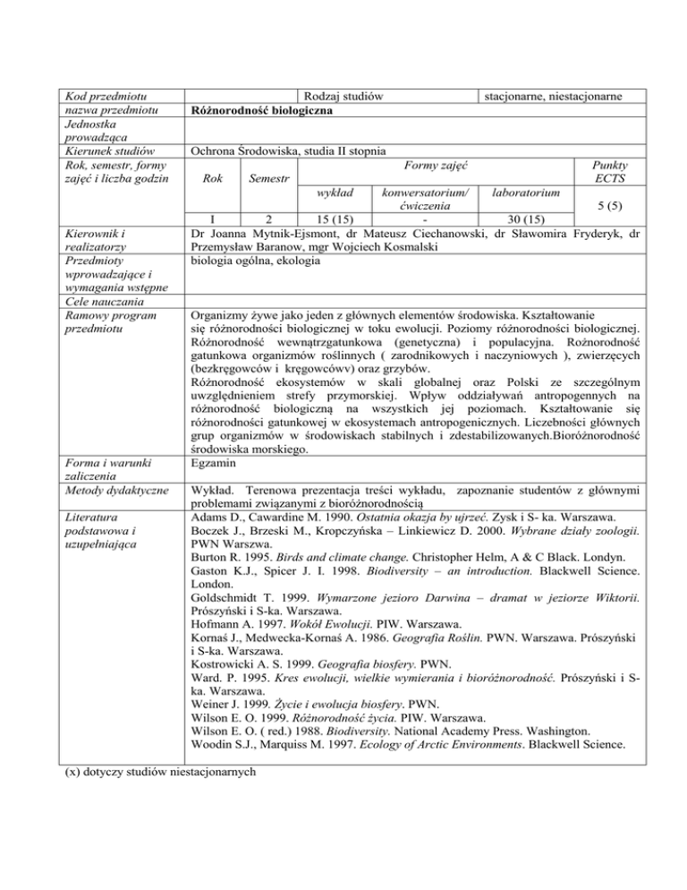 Kod przedmiotu nazwa przedmiotu Jednostka prowadząca Kierunek studiów Rok, semestr, formy zajęć i liczba godzin Rodzaj studiów Różnorodność biologiczna stacjonarne, niestacjonarne Ochrona Środowiska, studia II stopnia Formy zajęć Rok Semestr Punkty ECTS wykład Kierownik i realizatorzy Przedmioty wprowadzające i wymagania wstępne Cele nauczania Ramowy program przedmiotu Forma i warunki zaliczenia Metody dydaktyczne Literatura podstawowa i uzupełniająca konwersatorium/ laboratorium ćwiczenia 5 (5) I 2 15 (15) 30 (15) Dr Joanna Mytnik-Ejsmont, dr Mateusz Ciechanowski, dr Sławomira Fryderyk, dr Przemysław Baranow, mgr Wojciech Kosmalski biologia ogólna, ekologia Organizmy żywe jako jeden z głównych elementów środowiska. Kształtowanie się różnorodności biologicznej w toku ewolucji. Poziomy różnorodności biologicznej. Różnorodność wewnątrzgatunkowa (genetyczna) i populacyjna. Rożnorodność gatunkowa organizmów roślinnych ( zarodnikowych i naczyniowych ), zwierzęcych (bezkręgowców i kręgowcówv) oraz grzybów. Różnorodność ekosystemów w skali globalnej oraz Polski ze szczególnym uwzględnieniem strefy przymorskiej. Wpływ oddziaływań antropogennych na różnorodność biologiczną na wszystkich jej poziomach. Kształtowanie się różnorodności gatunkowej w ekosystemach antropogenicznych. Liczebności głównych grup organizmów w środowiskach stabilnych i zdestabilizowanych.Bioróżnorodność środowiska morskiego. Egzamin Wykład. Terenowa prezentacja treści wykładu, zapoznanie studentów z głównymi problemami związanymi z bioróżnorodnością Adams D., Cawardine M. 1990. Ostatnia okazja by ujrzeć. Zysk i S- ka. Warszawa. Boczek J., Brzeski M., Kropczyńska – Linkiewicz D. 2000. Wybrane działy zoologii. PWN Warszwa. Burton R. 1995. Birds and climate change. Christopher Helm, A & C Black. Londyn. Gaston K.J., Spicer J. I. 1998. Biodiversity – an introduction. Blackwell Science. London. Goldschmidt T. 1999. Wymarzone jezioro Darwina – dramat w jeziorze Wiktorii. Prószyński i S-ka. Warszawa. Hofmann A. 1997. Wokół Ewolucji. PIW. Warszawa. Kornaś J., Medwecka-Kornaś A. 1986. Geografia Roślin. PWN. Warszawa. Prószyński i S-ka. Warszawa. Kostrowicki A. S. 1999. Geografia biosfery. PWN. Ward. P. 1995. Kres ewolucji, wielkie wymierania i bioróżnorodność. Prószyński i Ska. Warszawa. Weiner J. 1999. Życie i ewolucja biosfery. PWN. Wilson E. O. 1999. Różnorodność życia. PIW. Warszawa. Wilson E. O. ( red.) 1988. Biodiversity. National Academy Press. Washington. Woodin S.J., Marquiss M. 1997. Ecology of Arctic Environments. Blackwell Science. (x) dotyczy studiów niestacjonarnych