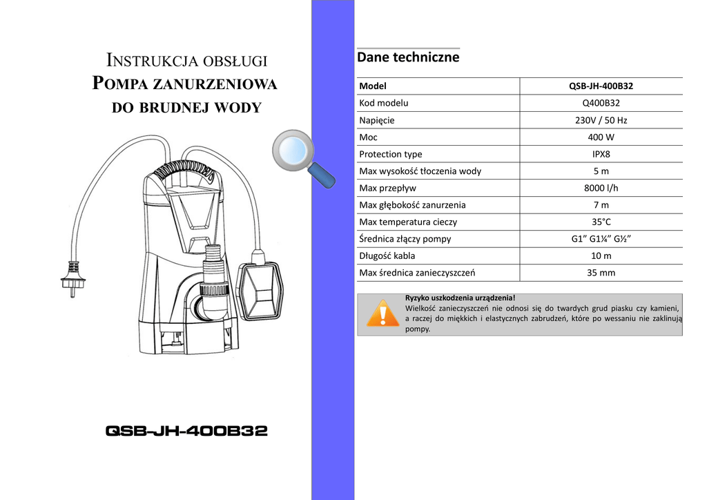 INSTRUKCJA OBSŁUGI POMPA ZANURZENIOWA DO BRUDNEJ WODY Dane techniczne Model QSB-JH-400B32 Kod modelu Napięcie Q400B32 230V / 50 Hz Moc 400 W Protection type IPX8 Max wysokość tłoczenia wody 5m Max przepływ 8000 l/h Max głębokość zanurzenia 7m Max temperatura cieczy 35°C Średnica złączy pompy Długość kabla Max średnica zanieczyszczeń G1” G1¼” G½” 10 m 35 mm Ryzyko uszkodzenia urządzenia! Wielkość zanieczyszczeń nie odnosi się do twardych grud piasku czy kamieni, a raczej do miękkich i elastycznych zabrudzeń, które po wessaniu nie zaklinują pompy. QSB-JH-400B32 INSTRUKCJA OBSŁUGI – POMPA ZANURZENIOWA DO BRUDNEJ WODY Drogi kliencie! Dziękujemy za zaufanie naszym produktom! Państwa urządzenie zostało zaprojektowane i wykonane z aktualnym stanem techniki. Prosimy przeczytać instrukcje użytkowania przed pierwszym użyciem urządzenia! Instrukcja zawiera podstawowe informacje niezbędne do bezpiecznego użytkowania tego urządzenia oraz zapewnienia wydłużonego czasu użytkowania. Upewnij się, że przestrzegasz wszystkich informacji dotyczące bezpieczeństwa zawartych w niniejszej instrukcji. Zanim użyjesz... Urządzenie jest przeznaczone do pompowania wody deszczowej, świeżej wody, sieci wodociągowej i chlorowanej wody w basenach. Nie może być stosowana do pompowania wody pitnej ani innych cieczy spożywczych. Nie wolno pompować ciekłych substancji wybuchowych, palnych, agresywnych i żrących, szamba oraz wszelkich innych niebezpiecznych dla zdrowia. Urządzenie przeznaczone jest do użytku domowego i nie nadaje się do użycia przemysłowego. Pompa nie jest przeznaczona do pracy ciągłej (np. w stałym obiegu w systemach filtracyjnych). Również nie nadaje się do pompowania płynów zawierających materiały ścierne (np. piasek) lub składających się ze szlamu, piasku, błota lub gliny. Każde zastosowanie pompy niezgodne z niniejszą instrukcją uważane jest za niewłaściwe i powstałe w ten sposób uszkodzenia urządzenia nie podlegają reklamacji. Niewłaściwe użytkowanie urządzenia może powodować nieprzewidywalne szkody. Podobnie stosowanie niewłaściwych części zamiennych. Ogólne zasady bezpieczeństwa Użytkownik powinien zapoznać się z instrukcją użytkowania pompy i przestrzegać podanych w niej zasad. Zawsze należy zachować instrukcję w zasięgu ręki. Nieprzestrzeganie zasad użytkowania może wyrządzić szkodę Tobie lub innym. Urządzenia nie można używać w miejscach zagrożonych wybuchem, w pobliżu palnych cieczy lub gazu. Nie dotykaj wtyczki przewodu mokrymi rękami! Zawsze należy wyjąć wtyczkę z gniazdka bezpośrednio a nie ciągnąć za kabel. Podłączenie musi być wykonywane do uziemionych gniazd, które zostały prawidłowo zainstalowane – uziemione i przetestowane; napięcie zasilające i bezpiecznik muszą być zgodne z danymi technicznymi. Podczas pracy na basenach, stawach ogrodowych i podobnych miejscach, urządzenie musi być wyposażone w wyłącznik prądu różnicowego obwodu (RCCB) z prądu zwarcia projekt nie więcej niż 30 mA. Nie zginać lub zgniatać przewodu kabla sieciowego; chronić przed ostrymi krawędziami, olejami, gorącymi powierzchniami. Nie wolno stosować przedłużaczy. Odłącz wtyczkę z gniazdka przed wszystkimi pracami nad urządzeniem. Nie instaluj i nie włączaj urządzenia, jeśli w zbiorniku wody (np. w basenie) znajdują się zwierzęta (lub mogą pozostawać w kontakcie z urządzeniem). Dzieci i młodzież w wieku poniżej 16 lat nie mogą korzystać z tego urządzenia, i nie powinny znajdować się w jego zasięgu gdy jest podłączone lub w trakcie pracy. Naprawy mogą być wykonywane wyłącznie przez wykwalifikowanego elektryka. W przypadku błędnie przeprowadzonej naprawy istnieje niebezpieczeństwo przenikania cieczy do elektrycznych elementów pompy. INSTRUKCJA OBSŁUGI – POMPA ZANURZENIOWA DO BRUDNEJ WODY Ogólna budowa urządzenia 1. 2. 3. 4. 5. Uchwyt do przenoszenia Przewód zasilający z wtyczką Włącznik pływakowy Adapter do węża ciśnieniowego Obudowa pompy Montaż i uruchomienie Dołączyć wystarczająco długą i mocną linę do uchwytu przed pierwszym użyciem. W głębszych zbiornikach pompę należy zanurzać z użyciem liny, w płytszych można wstawić pompę trzymając ją za uchwyt. Uwaga! Jeśli stale używasz liny do zanurzania pompy, stan liny powinien być sprawdzony przed każdym użyciem, czy lina nie jest przegniła lub pęknięta. Podłącz przewód ciśnieniowy. Do sporadycznego użytku, należy użyć odpowiedniego węża z wodą. Jeśli pompa będzie montowana na dłuższy czas lub na stałe w jakimś miejscu zalecane jest zastosowanie sztywnego węża z zaworem zwrotnym. Zapobiegnie to wstecznemu przepływowi cieczy przy wyłączaniu. Przewód ciśnieniowy wkręcić na przyłączu ciśnieniowym. Wszystkie połączenia gwintowane należy uszczelnić taśmą uszczelniającą gwint (np. taśmą teflonową). Jeśli wąż tego wymaga – zastosować odpowiedni adapter na przyłączu ciśnieniowym. Wcisnąć przewód mocno na końcówkę rury i zabezpieczyć zaciskiem. Urządzenie wymaga co najmniej 50 x 50 cm powierzchni wolnej przestrzeni wokół siebie tak aby włącznik pływakowy mógł swobodnie unosić się lub opadać w wodzie. Urządzenie może być zanurzone pod wodą do maksymalnej swojej głębokości roboczej (patrz tabla „Dane techniczne”). Pompa ustawiona powinna być na trwałej powierzchni, w taki sposób, aby otwory ssące nie były zablokowane przez ciała obce (w razie potrzeby zastosować podkładkę stabilizującą pod pompę). Upewnij się, że urządzenie stoi jest stabilnie. Ryzyko uszkodzenia! Nie zanurzaj pompy trzymając ją za przewód zasilający lub wąż odprowadzający wodę. Zanurzaj pompę pod kątem, tak aby w tworach ssących nie pozostały bańki powietrza. Zapowietrzenie w pompie uniemożliwi jej prawidłowe zasysanie wody. Kiedy pompa znajdzie się całkowicie pod 