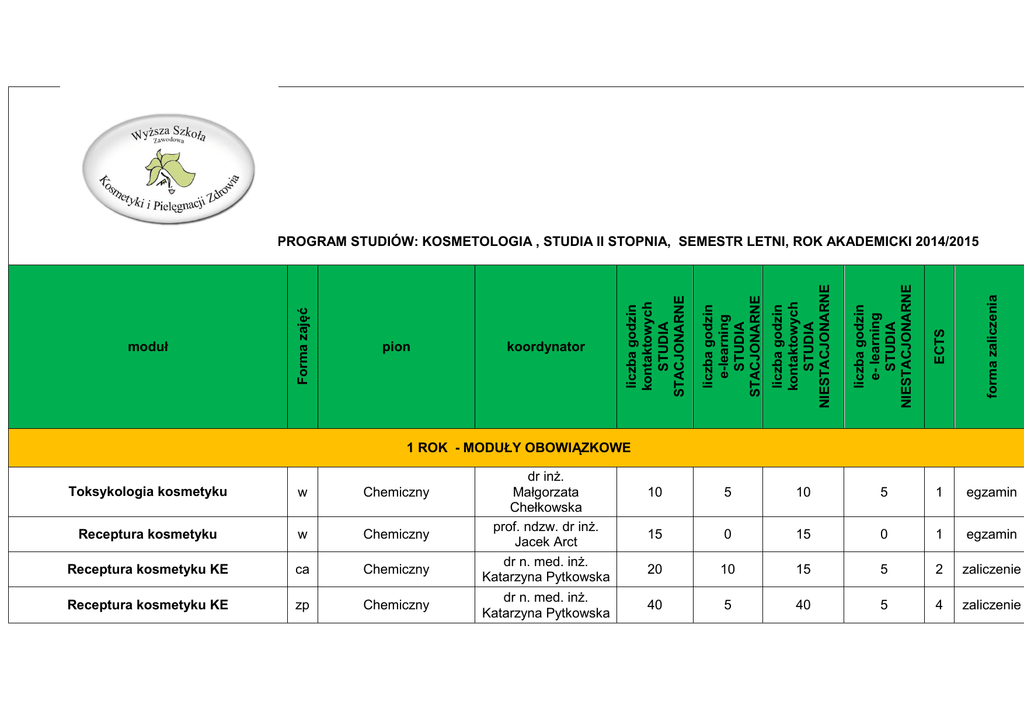 liczba godzin kontaktowych STUDIA NIESTACJONARNE liczba godzin e- learning STUDIA NIESTACJONARNE ECTS forma zaliczenia koordynator 10 5 10 5 1 egzamin 15 0 15 0 1 egzamin 20 10 15 5 2 zaliczenie 40 5 40 5 4 zaliczenie liczba godzin e-learning STUDIA STACJONARNE pion liczba godzin kontaktowych STUDIA STACJONARNE moduł Forma zajęć PROGRAM STUDIÓW: KOSMETOLOGIA , STUDIA II STOPNIA, SEMESTR LETNI, ROK AKADEMICKI 2014/2015 1 ROK - MODUŁY OBOWIĄZKOWE Toksykologia kosmetyku w Chemiczny Receptura kosmetyku w Chemiczny Receptura kosmetyku KE ca Chemiczny Receptura kosmetyku KE zp Chemiczny dr inż. Małgorzata Chełkowska prof. ndzw. dr inż. Jacek Arct dr n. med. inż. Katarzyna Pytkowska dr n. med. inż. Katarzyna Pytkowska Endokrynologia w Medyczny Onkologia skóry ca Medyczny prof. dr hab. n. med. Andrzej Langner 15 0 15 0 2 egzamin 10 5 10 5 1 zaliczenie 110 25 105 20 11 13 2 13 2 1 egzamin 15 0 10 0 2 zaliczenie 15 0 15 0 3 zaliczenie 30 0 20 0 2 egzamin 30 0 20 0 2 egzamin 15 15 10 20 2 egzamin 15 0 15 0 1 egzamin 55 5 45 5 5 zaliczenie 2 13 2 13 1 egzamin 55 5 45 5 5 zaliczenie 1 ROK - MODUŁY OBIERALNE Przemysłowa produkcja kosmetyków w Chemiczny Przemysłowa produkcja kosmetyków s Chemiczny Nowości w kosmetologii s kosmetyczny/chemiczny Marketing kosmetyków i usług kosmetycznych w PR usług kosmetycznych w Propedeutyka podologii w Medyczny w Kosmetyczny zp Kosmetyczny Techniki i zabiegi SPA w Kosmetyczny Kosmetologia pielęgnacyjna ciała zp Kosmetyczny Niekonwencjonalne techniki kosmetyczne Kosmetologia estetyczna mgr Irena Ozga mgr Irena Ozga dr n. med.inż. Katarzyna Pytkowska/ mgr Maria Klamczyńska mgr inż. Rafał Masiak dr inż. Alvin Gajadhur prof. ndzw. dr n. med. Maciej Koselak dr n. med. Zygmunt Bronz dr Marta Klimczyk mgr Grażyna Skalec mgr Grażyna Skalec Kosmetologia klasyczna 1 zp Anatomia czynnościowa układu ruchu w Specjalistyczne metody masażu w Specjalistyczne metody masażu 1 zp dr Marta Klimczyk mgr Jacek Hernik mgr Jacek Hernik mgr Jacek Hernik 60 0 60 0 5 zaliczenie 10 20 10 20 3 egzamin 15 15 15 15 3 egzamin 30 0 30 0 3 zaliczenie 360 75 310 80 2 ROK - MODUŁY OBOWIĄZKOWE Seminarium dyplomowe s _ prof. ndzw. dr inż. Jacek Arct 15 0 15 0 4 zaliczenie Konwersatorium dyplomowe s _ prof. ndzw. dr inż. Jacek Arct _ _ _ _ 10 zaliczenie Pracownia dyplomowa zp _ prof. ndzw. dr inż. Jacek Arct _ _ _ _ 5 zaliczenie Medycyna estetyczna z elementami chirurgii plastycznej w Medyczny dr n ekon. lek. med. Dorota Wydro 15 15 10 15 1 egzamin Medycyna estetyczna z elementami chirurgii plastycznej ca Medyczny dr n. ekon. lek. med. Dorota Wydro 10 5 10 5 2 zaliczenie 40 20 35 20 22 13 2 13 2 1 2 ROK - MODUŁY OBIERALNE Dodatkowe moduły obieralne Rola jakości usług w salonie kosmetycznym w Kosmetyczny mgr Paulina Burek egzamin Kontrola analityczna w produkcji kosmetyków w Chemiczny prof. ndzw. dr hab. inż. Mirosław Mojski 30 0 * Uczelnia zastrzega sobie prawo do wprowadzenia zmian w powyższych danych Legenda: zp - zajęcia praktyczne s - seminarium ca - ćwiczenia audytoryjne w- wykład 30 0 1 egzamin