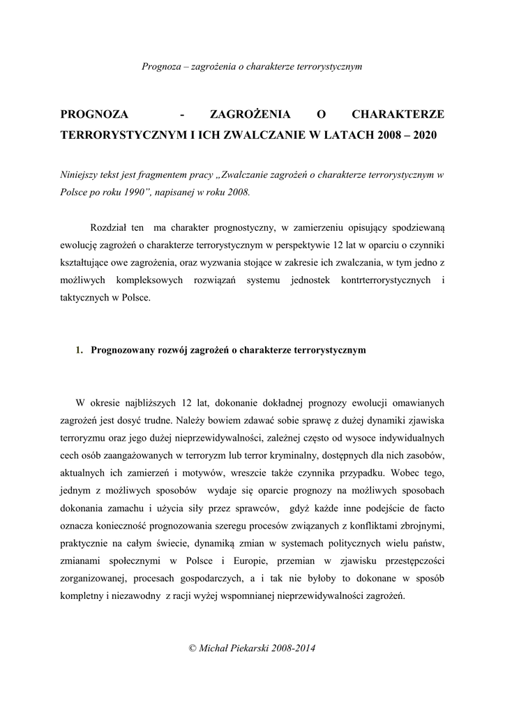 Prognoza – zagrożenia o charakterze terrorystycznym PROGNOZA - ZAGROŻENIA O CHARAKTERZE TERRORYSTYCZNYM I ICH ZWALCZANIE W LATACH 2008 – 2020 Niniejszy tekst jest fragmentem pracy „Zwalczanie zagrożeń o charakterze terrorystycznym w Polsce po roku 1990”, napisanej w roku 2008. Rozdział ten ma charakter prognostyczny, w zamierzeniu opisujący spodziewaną ewolucję zagrożeń o charakterze terrorystycznym w perspektywie 12 lat w oparciu o czynniki kształtujące owe zagrożenia, oraz wyzwania stojące w zakresie ich zwalczania, w tym jedno z możliwych kompleksowych rozwiązań systemu jednostek kontrterrorystycznych i taktycznych w Polsce. 1. Prognozowany rozwój zagrożeń o charakterze terrorystycznym W okresie najbliższych 12 lat, dokonanie dokładnej prognozy ewolucji omawianych zagrożeń jest dosyć trudne. Należy bowiem zdawać sobie sprawę z dużej dynamiki zjawiska terroryzmu oraz jego dużej nieprzewidywalności, zależnej często od wysoce indywidualnych cech osób zaangażowanych w terroryzm lub terror kryminalny, dostępnych dla nich zasobów, aktualnych ich zamierzeń i motywów, wreszcie także czynnika przypadku. Wobec tego, jednym z możliwych sposobów wydaje się oparcie prognozy na możliwych sposobach dokonania zamachu i użycia siły przez sprawców, gdyż każde inne podejście de facto oznacza konieczność prognozowania szeregu procesów związanych z konfliktami zbrojnymi, praktycznie na całym świecie, dynamiką zmian w systemach politycznych wielu państw, zmianami społecznymi w Polsce i Europie, przemian w zjawisku przestępczości zorganizowanej, procesach gospodarczych, a i tak nie byłoby to dokonane w sposób kompletny i niezawodny z racji wyżej wspomnianej nieprzewidywalności zagrożeń. © Michał Piekarski 2008-2014 Prognoza – zagrożenia o charakterze terrorystycznym Należy także unikać wartościowania zagrożeń w zależności od możliwych do poniesienia w rezultacie zamachu strat. Trzeba bowiem brać pod uwagę, że incydenty o mniejszej skali są bardziej prawdopodobne, a zatem należy spodziewać się że będą występowały znacznie częściej niż zamachy o większym stopniu wyrafinowania i stwarzanego zagrożenia (np. przy użyciu broni masowego rażenia), które są mniej prawdopodobne i będą zdarzać się znacznie rzadziej. Wobec tego, należy przygotowywać się na pełne spektrum zagrożeń, od najbardziej prawdopodobnych po najgorsze możliwe scenariusze. Pojawia się pytanie, czy jest coś jeszcze , co można przewidzieć? Oczywiście, żaden człowiek nie jest w stanie dokonać żadnej prognozy ze stuprocentową pewnością. Można jednak wskazać pewne procesy kształtujące sposób użycia siły zbrojnej. „Wojna opuściła pole bitwy” jak pisze L. Seaquist, przewidując konflikt w którym tradycyjna armia – której najbardziej zaawansowanym wcieleniem była i jest amerykańska potęga wojskowa – musi mierzyć się z widmem dziesiątek lokalnych wojen, lokalnych konfliktów, gdzie podział na wojskowych i cywili zaburza się coraz bardziej 1. Także inne oceny wyraźnie sugerują, że proces użycia siły w stosunkach międzynarodowych powoli przechodzi transformację. Nie jest to jednak transformacja opisywana przez Tofflerów 2, w kierunku wojen wysokiej technologii, opartych na zaawansowanym, precyzyjnym uzbrojeniu, walce informatycznej, walce w Kosmosie, walce nierozerwalnie związanej z technologią, będącą dostępną faktycznie tylko dla nielicznych państw, której praktycznym wyrazem stały się amerykańskie koncepcje i programy rozwoju armii, określane jako „Revolution in Military Affairs” 3. Postawić należy bowiem pytanie, czy w dobie tak znaczącego rozwoju broni konwencjonalnych, w tym dominującego na współczesnym polu walki lotnictwa , pozwalających uzyskać zdolność zadawania ciosów druzgocących dla przeciwnika w stopniu porównywalnym z bronią jądrową, dzięki precyzji uderzeń i wszechobecności technicznych 1 L. Seaquist Community War Proceedings of the Naval Institute August 2000 (kopia : http://www.d-n-i.net/fcs/seaquist_community_war.htm) 2 A i H Toffler Wojna i Antywojna. Jak przetrwać na progu XXI wieku? Warszawa 1998. Warto zwrócić uwagę, że Tofflerowie przypisują wiedzy będącej fundamentem „wojen trzeciej fali” – ergo wojen opartych na wysokiej technologii rolę czynnika równoważącego potencjały, to jednak kompleksowa modernizacja armii i jej zaplecza w tym kierunku, jest z powodów materialnych lub – jak pokazał casus Związku Radzieckiego – politycznych – wykonalna tylko dla wąskiej grupy państw. 3 Zob np. W. Łuczak Rewolucja w US Army „Raport – wto” 12/2002, M.Likowski, W. Łuczak, S. Zaloga Armia czasów wojny i transformacji „Raport – wto” 11/03. © Michał Piekarski 2008-2014 Prognoza – zagrożenia o charakterze terrorystycznym środków zbierania informacji, najsilniejsze państwa nie osiągnęły w wymiarze sił konwencjonalnych stanu pata militarnego, na wzór strategicznego pata zimnowojennego. Obydwie strony posiadają bowiem podobną zdolność kontroli poczynań przeciwnika i zadawania mu strat, lub przynajmniej powstrzymania jego uderzeń 4. Z uwagi na koszta współczesnej broni i stopień jej komplikacji, idące w miliardy dolarów, żadne państwo nie może sobie pozwolić na utrzymywanie dużych arsenałów ani na szybkie wprowadzanie do produkcji w czasie wojny nowych serii produkcyjnych czy w ogólne nowych typów uzbrojenia. W efekcie wojna konwencjonalna pomiędzy wysoko rozwiniętymi państwami („trzeciej fali”), przestaje mieć sens. Wojna konwencjonalna pomiędzy państwami wysoko rozwiniętymi, a słabszymi jest również bezsensowna, gdyż dysproporcje w technice wojskowej są tak duże, że zamieniają wojnę w „grę do jednej bramki” (casus „Pustynnej Burzy”). Państwo słabiej rozwinięte nie ma szans w otwartym starciu z silniejszym technologicznie przeciwnikiem, gdyż dy