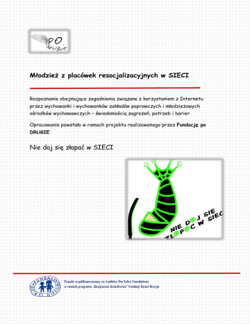 Młodzież z placówek resocjalizacyjnych w SIECI Rozpoznanie obejmujące zagadnienia związane z korzystaniem z Internetu przez wychowanki i wychowanków zakładów poprawczych i młodzieżowych ośrodków wychowawczych – świadomością zagrożeń, potrzeb i barier Opracowanie powstało w ramach projektu realizowanego przez Fundację po DRUGIE Nie daj się złapać w SIECI Projekt współfinansowany ze środków The Velux Foundations w ramach programu „Bezpieczne dzieciństwo” Fundacji Dzieci Niczyje CELE: Fundacja po DRUGIE na przełomie października i listopada 2014 roku przeprowadziła badania ankietowe wśród wychowanek i wychowanków placówek resocjalizacyjnych, które miały na celu znalezienie odpowiedzi na pytania: − w jakim zakresie wychowanki i wychowankowie placówek resocjalizacyjnych korzystają z Internetu w czasie pobytu w placówce; − w jakim zakresie wychowanki i wychowankowie placówek resocjalizacyjnych korzystają z Internetu poza placówką; − jak kształtują się potrzeby i oczekiwania dziewcząt i chłopców przebywających w placówkach resocjalizacyjnych w zakresie korzystania z Internetu – poszukiwane treści, tworzenie własnych przekazów; − jaka i czy jest świadomość zagrożeń związanych z korzystaniem z Internetu. Wyniki rozpoznania – określenie potrzeb, barier, poziomu świadomości – są podstawą do stworzenia przez specjalistów Fundacji po DRUGIE programu edukacyjnego pt. „Nie daj się złapać w SIECI”, ale również pozwalają na szerokie rozpoznanie sytuacji wychowanek i wychowanków w kontekście korzystania z Internetu. GRUPA: W badaniu wzięło udział 165 osób (48 dziewcząt i 117 chłopców) przebywających w młodzieżowych ośrodkach wychowawczych - 62 osoby oraz zakładach poprawczych - 103 osoby (tab. 1), w wieku od 13 do 20 lat. Tabela 1a. Rozkład płci w próbie badanej Liczebność placówka płeć MOW ZP ogółem kobieta 35 13 48 mężczyzna 27 90 117 ogółem 62 103 165 Młodzież uczestnicząca w badaniu w zdecydowanej większości pochodzi ze środowiska miejskiego (89,7%) – głównie ze średnich (38,8%) i dużych (37,6%) i miast. Wychowanki i wychowankowie placówek resocjalizacyjnych są umieszczeni w nich na mocy sądowych postanowień. Powodami umieszczenia w młodzieżowym ośrodku wychowawczym i zakładzie poprawczym są demoralizacja, jak również popełnione przez nieletnich czyny karalne. Większość wychowanek i wychowanków wywodzi się ze środowisk dysfunkcjonalnych (ubóstwo, przemoc, alkohol, pobyty w zakładach karnych itp.); znaczna część z nich ma w swoim doświadczeniu również pobyty w pogotowiach opiekuńczych, domach dziecka, rodzinach zastępczych. NET W PLACÓWCE: Zgodnie z treścią art. 95cc § 1. pkt. 7 ustawy o postępowaniu w sprawach nieletnich korzystanie z Internetu w zakładach poprawczych jest formą nagrody, którą wychowanka/wychowanek może uzyskać m.in. za właściwe zachowanie, wyróżniające wykonywanie obowiązków, wzorowe przestrzeganie regulaminu lub osiąganie bardzo dobrych wyników w nauce. W przypadku młodzieżowych ośrodków wychowawczych zasady korzystania z Internetu są regulowane wewnętrznymi dokumentami placówek. Te regulacje zatem wyglądają różnie – ale co do zasady są zbliżone do obowiązujących w zakładach poprawczych. Dobre oceny i dobre zachowanie wychowanek i wychowanków przekładają się na częstszą, swobodniejszą możliwość korzystania z Internetu. Wskazane zasady mają swoje odbicie w rzeczywistości. Wychowankowie/wychowanki zakładów poprawczych i młodzieżowych ośrodków wychowawczych biorący udział w badaniu wskazali, iż dostęp do Internetu mają zagwarantowany w czasie zajęć komputerowych – co nie zawsze wiąże się ze swobodnym użytkowaniem sieci, ale często z wykonywaniem zadań wskazanych. przez nauczyciela. Dostępność i możliwość korzystania z Internetu dla własnych potrzeb jest zróżnicowana i jak wynika z rozpoznania dużo bardziej ograniczona w zakładach poprawczych, niż w młodzieżowych ośrodkach wychowawczych. ZATEM: Wychowanki MOW (35 osób) wskazały, iż podczas zajęć pozalekcyjnych tylko w określonych godzinach i pod opieką wychowawcy mogą korzystać z Internetu w telefonie (13 wskazań) lub pracowni komputerowej/bibliotece (22 wskazania). Dziennie nie poświęcają na korzystanie z Internetu więcej niż 1 godzinę. Wychowankowie MOW (27 osób) biorący udział w badaniu jednogłośnie wskazywali na brak możliwości korzystania z Internetu w ich placówkach poza zajęciami szkolnymi, gdzie dostęp ten odbywa się tylko pod kontrolą wychowawców. Wychowanki ZP mogą korzystać z Internetu tylko w sali komputerowej w określonych godzinach i pod opieką wychowawcy (13 wskazań). Czas dziennego użytkowania Internetu, podobnie jak w ośrodku wychowawczym, nie przekracza godziny dziennie. Wychowankowie ZP mają dostęp do sieci jedynie w sali komputerowej, z której korzystają albo w określonych godzinach (20 wskazań), albo w określonych godzinach i pod opieką wychowawcy (49 wskazań). 21 wskazań odnosiło się do braku możliwości użytkowania Internetu poza podstawowymi zajęciami szkolnymi. CZAS W SIECI: Najczęstsze wskazanie odnoszące się do dziennego czasu korzystania z Internetu oscyluje wokół godziny 1. 57 osób spędza w sieci mniej niż jedną godzinę. 10 osób może poświęcać na to od jednej do dwóch godzin, a 2 osoby od trzech do czterech godzin. Pomimo popularności Internetu wśród młodzieży blisko 60% badanych nie uważa, że jest on jedyną szansą na utrzymywanie kontaktu z prawdziwym życiem poza placówką, są przecież telefony, widzenia i przepustki. CIEKAWE: W odniesieniu do czasu i dostępności Internetu w placówce niezwykle ciekawe okazały się nie tyle same wyniki ankiet, ale przede wszystkim dopiski znalezione na nich wykonane przez wychowanków. W swoich komentarzach postulowali oni poszerzenie możliwości