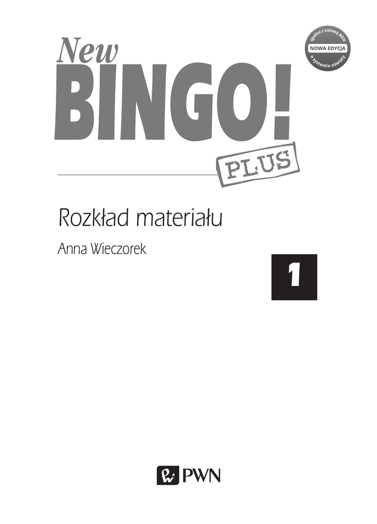 New BINGO! Rozkład materiału Anna Wieczorek 1 Rozk∏ad materia∏u (syllabus) do podr´cznika New Bingo! 1 Plus (nowa edycja) Lesson Lesson 1 Hello! Good morning! Hi! Temat lekcji Wyra˝enia i struktury zdaniowe S∏ownictwo Nowe umiej´tnoÊci j´zykowe ucznia Witamy si´ i przedstawiamy po angielsku. Hello! Good morning! Hi! I’m … My name is … I’m … What’s your name? It’s nice to see you. How are you? I’m fine, thank you! Goodbye! book, school, boy, girl, teacher, mouse, children Zapozna si´ z nowym podr´cznikiem. Nauczy si´ witaç i przedstawiaç po angielsku. Nauczy si´ pytaç o czyjeÊ imi´ i samopoczucie. Pozna nowe s∏ownictwo. Nauczy si´ ˝egnaç po angielsku. Poznajemy nazwy przyborów szkolnych. What is this? This is a … classroom, pen, pencil, pencil-case, book, ruler, rubber, school-bag, board Pozna nazwy przedmiotów szkolnych. Nauczy si´ zadawaç pytanie: Co to jest? Nauczy si´ odpowiedzi na to pytanie: To jest … Zapytanie o samopoczucie i odpowiedzi na to pytanie. How are you today? I’m fine, thank you. I’m OK. I’m not very well. Where is (Kasia)? Here I am. Liczenie od 1 do 10 Liczba mnoga rzeczowników I like number … How many …? one, two, three, four, five, six, seven, eight, nine, ten yes, no, and board(s), ruler(s), pencil(s), school-bag(s), pencil-case(s), book(s), pen(s), rubber(s), boy(s), girl(s) Pozna liczebniki od 1 do 10. Nauczy si´ odpowiadaç na pytanie: Ile? Nauczy si´ wyra˝aç preferencje: Lubi´ numer … B´dzie u˝ywaç znanych rzeczowników w liczbie mnogiej. Lesson 5 Ju˝ umiem! Materiały çwiczeniowe, str. 8–9) UNIT 1 First day at school Utrwalenie materia∏u z rozdzia∏u 1. Wyra˝enia i struktury zdaniowe z lekcji 1–4 S∏ownictwo z lekcji 1–4 Utrwali materia∏ z rozdzia∏u 1. Sprawdzi swoje umiej´tnoÊci j´zykowe. Lesson * Story telling (str. 8–9) Historyjka obrazkowa First day at school. S∏ownictwo z rozdzia∏u 1 Utrwali materia∏ j´zykowy z rozdzia∏u 1. na tekÊcie historyjki dêwi´kowo-obrazkowej. UNIT 1 First day at school Lesson 2 In the classroom UNIT 1 First day at school Lesson 3 How are you today? UNIT 1 First day at school Lesson 4 I like numbers UNIT 1 First day at school Wyra˝enia i struktury zdaniowe z rozdzia∏u 1. Nauczy si´ zadawaç pytanie: Gdzie jest …? B´dzie umia∏ powiedzieç: Tutaj jestem. Nauczy si´ zadawaç pytanie o samopoczucie i odpowiadaç na to pytanie. UNIT 1 First day at school Lesson 6 Head and shoulders Poznajemy nazwy cz´Êci cia∏a i proste polecenia. Look at …! Point at …! Touch his …! head, shoulders, knees, toes, eyes, ears, mouth, nose Numbers: 1–10 Pozna i przyswoi nazwy cz´Êci cia∏a. B´dzie poprawnie reagowa∏ na polecenia typu: Popatrz na…!, Wska˝ na…!, Dotknij…! Utrwali liczenie do 10. Przymiotniki: big, little Czasownik „mieç” w 1 os. liczby poj. I have got … You can see! How many (eyes) have you got? big, little, head, nose, tail, eyes, ears, mouth, nose, arms, fingers, lion, mouse Numbers: 1–10 funny monster many (toes) Pozna przymiotniki: du˝y, ma∏y. B´dzie stosowa∏ czasownik „mieç” w 1 os. liczby poj. Utrwali liczebniki 1–10. Utrwali s∏ownictwo dot. nazw cz´Êci cia∏a. B´dzie ustnie opisywaç swój wyglàd. UNIT 2 My body Lesson 7 A big lion and a little mouse UNIT 2 My body 2 New Bingo! 1 Plus, Rozk∏ad materia∏u © Wydawnictwo Szkolne PWN Lesson Lesson 8 Clap your hands Temat lekcji Wyra˝enia i struktury zdaniowe S∏ownictwo Nowe umiej´tnoÊci j´zykowe ucznia åwiczenia z elementami TPR – wydawanie poleceƒ i reagowanie na nie. Clap your hands! Touch your …! Point to your …! Say it again after me! Powtórzenie nazw cz´Êci cia∏a Number one, two, three, four arm, shoe, knee, floor Nauczy si´ rozpoznawaç i poprawnie reagowaç na proste polecenia. Utrwali s∏ownictwo z kr´gu tematycznego: Moje cia∏o. B´dzie wydawa∏ polecenia po angielsku. Gra planszowa My monster. Czasownik „mieç” w 3 os. liczby poj. My monster has got… It has got … How many …? Powtórzenie nazw cz´Êci cia∏a big, little Numbers: 1–10 Utrwali nazwy cz´Êci cia∏a. Utrwali liczebniki. B´dzie opisywa∏ wyglàd postaci. Utrwali nazwy przymiotników: du˝y, ma∏y. B´dzie odpowiadaç na pytanie o liczb´. Lesson 10 Ju˝ umiem! (Materiały çwiczeniowe, str. 14–15) UNIT 2 My body Utrwalenie materia∏u z rozdzia∏u 2. Wyra˝enia i struktury zdaniowe z lekcji 6–9 S∏ownictwo z lekcji 6–9 Utrwali materia∏ z rozdzia∏u 2. Sprawdzi swoje umiej´tnoÊci j´zykowe. Lesson * Story telling (str. 14–15) Historyjka obrazkowa My body. Wyra˝enia i struktury zdaniowe z rozdzia∏u 2 S∏ownictwo z rozdzia∏u 2 Utrwali materia∏ j´zykowy z rozdzia∏u 2. na tekÊcie historyjki dêwi´kowo-obrazkowej. Poznajemy nazwy kolorów. for me for you and me Here you are. Thank you! pink, red, orange, yellow, green, blue, purple, lolly, pencil-case(s), computer(s), ruler(s), pencil(s), book(s), numbers: 1–10 Pozna nazwy kolorów. Utrwali poznane do tej pory s∏ownictwo. Utrwali liczebniki: 1–10. B´dzie praktycznie u˝ywa∏ zwrotów: Dla mnie! Dla ciebie i dla mnie! Prosz´ bardzo! Dzi´kuj´! Poznajemy nazwy kolorów, cd. My (desk) is brown. It is brown. What colour is your …? Tell me! Tell me now! orange, red, yellow, pink, green, purple, blue, black, white, grey, brown, desk, pencil, school-bag, notebook, pencil-case, ruler Pozna i b´dzie u˝ywaç nowych nazw kolorów: czarny, bia∏y, szary, bràzowy. Utrwali kolory poznane do tej pory. B´dzie okreÊla∏ kolory ró˝nych przedmiotów. B´dzie zadawa∏ pytania o kolory. Utrwali nazwy przyborów szkolnych. Utrwalenie nazw kolorów w oparciu o nazwy niektórych zwierzàt. I like you (too)! Through my window. I am sleepy! green frog, blue dolphin, orange camel, black and white panda, brown bear, pink dinosaur Utrwali nazwy kolorów. Pozna nazwy niektórych zwierzàt. B´dzie aktywnie u˝ywa∏ wyra˝enia: Lubi´ ci´!
