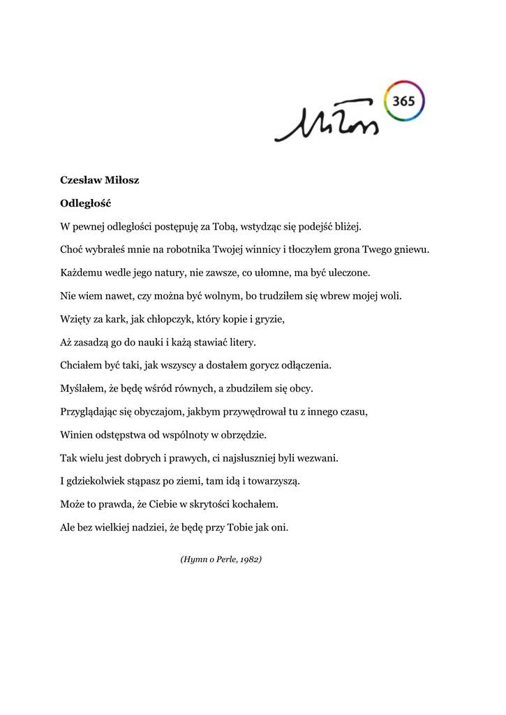 Czesław Miłosz Odległość W pewnej odległości postępuję za Tobą, wstydząc się podejść bliżej. Choć wybrałeś mnie na robotnika Twojej winnicy i tłoczyłem grona Twego gniewu. Każdemu wedle jego natury, nie zawsze, co ułomne, ma być uleczone. Nie wiem nawet, czy można być wolnym, bo trudziłem się wbrew mojej woli. Wzięty za kark, jak chłopczyk, który kopie i gryzie, Aż zasadzą go do nauki i każą stawiać litery. Chciałem być taki, jak wszyscy a dostałem gorycz odłączenia. Myślałem, że będę wśród równych, a zbudziłem się obcy. Przyglądając się obyczajom, jakbym przywędrował tu z innego czasu, Winien odstępstwa od wspólnoty w obrzędzie. Tak wielu jest dobrych i prawych, ci najsłuszniej byli wezwani. I gdziekolwiek stąpasz po ziemi, tam idą i towarzyszą. Może to prawda, że Ciebie w skrytości kochałem. Ale bez wielkiej nadziei, że będę przy Tobie jak oni. (Hymn o Perle, 1982)