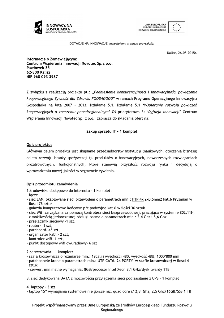 DOTACJE NA INNOWACJE. Inwestujemy w waszą przyszłość. Kalisz, 26.08.2015r. Informacje o Zamawiającym: Centrum Wspierania Innowacji Novotec Sp.z o.o. Pawłówek 35 62-800 Kalisz NIP 968 093 3987 Z związku z realizacją projektu pt.: „Podniesienie konkurencyjności i innowacyjności powiązania kooperacyjnego Żywność dla Zdrowia FOOD4GOOD” w ramach Programu Operacyjnego Innowacyjna Gospodarka na lata 2007 – 2013, Działanie 5.1. Działanie 5.1 ‘Wspieranie rozwoju powiązań kooperacyjnych o znaczeniu ponadregionalnym’ Oś priorytetowa 5: ‘Dyfuzja innowacji’ Centrum Wspierania Innowacji Novotec Sp. z o.o. zaprasza do składania ofert na: Zakup sprzętu IT – 1 komplet Opis projektu: Głównym celem projektu jest skupianie przedsiębiorstw instytucji (naukowych, otoczenia biznesu) celem rozwoju branży spożywczej tj. produktów o innowacyjnych, nowoczesnych rozwiązaniach prozdrowotnych, funkcjonalnych, które stanowią przyszłość rozwoju rynku i decydują o wprowadzeniu nowej jakości w segmencie żywienia. Opis przedmiotu zamówienia 1.środowisko dostępowe do Internetu – 1 komplet: - łącze - sieć LAN, okablowane sieci przewodem o parametrach min.: FTP 4x 2x0,5mm2 kat.6 Prysmian w ilości 76 sztuk - gniazda komputerowe końcowe p/t podwójne kat.6 w ilości 36 sztuk - sieć Wifi zarządzana za pomocą kontrolera sieci bezprzewodowej, pracująca w systemie 802.11N, z możliwością jednoczesnej obsługi pasma o parametrach min.: 2,4 Ghz i 5,6 Ghz - przełącznik sieciowy -1 szt, - router- 1 szt, - patchcord- 45 szt, - organizator kabli- 2 szt, - kontroler wifi- 1 szt, - punkt dostępowy wifi dwuradiowy- 6 szt 2.serwerownia - 1 komplet: - szafa krosownicza o rozmiarze min.: 19cali i wysokości 480, wysokość 48U, 1000*800 mm - patchpanele krone o parametrach min.: UTP CAT6. 24 PORTY w szafie krosowniczej w ilości 4 sztuk - serwer, minimalne wymagania: 8GB/procesor Intel Xeon 3.1 GHz/dysk twardy 1TB 3. sieć dedykowana DATA z możliwością przyłączenia sieci pod zasilanie z UPS – 1 komplet 4. laptopy – 3 szt. - laptop 15” wymagania systemowe nie gorsze niż: quad core i7 2,8 Ghz, 2,5 Ghz/16GB/SSS 1 TB Projekt współfinansowany przez Unię Europejską ze środków Europejskiego Funduszu Rozwoju Regionalnego DOTACJE NA INNOWACJE. Inwestujemy w waszą przyszłość. - laptop 11 ” wymagania systemowe nie gorsze niż: quard core i7,2,2 Ghz/8GB/256 GB - laptop 13” wymagania systemowe nie gorsze niż: quard core i7,2,2Ghz/8GB/512 GB 5. system konferencyjny – 2 komplety dla pomieszczeń o powierzchni pow.20 m2 /każde - ekran HD 50 ”, - kamera HD, - rzutnik, - zestaw głośnikowo-mikrofonowy. 6. inteligentny system IT dostępu do budynku – 1 komplet, w skład którego wchodzić będzie: - wideofon IP z dedykowaną aplikacją do obsługi min .8 użytkowników - kontrola dostępu -12 punktów - Kamera turbo hd -9szt - Rejestrator turbo hd - 1szt, - dysk specjalny do rejestratora kamer 4TB - 4szt - Monitor HDMI do systemu 27", wejście HDMI - Zasilacz do kamer - 1szt - Zasilacz awaryjny UPS do systemu- 1 szt Termin realizacji zamówienia: najpóźniej do 20.10.2015r. Zamawiający nie dopuszcza składania ofert częściowych. Rozpatrywane będą wyłącznie oferty kompletne. Wybrana zostanie oferta, które opiewać będzie na najniższą kwotę łączną całego przedmiotu zamówienia. Kryteria wyboru ofert: 1. obligatoryjne: • Ważność oferty: min 60 dni od daty wystawienia oferty • Złożenie oferty na formularzu ofertowym • Wypełnienie formularza ofertowego danymi pozwalającymi ocenić ofertę oraz złożenie oświadczeń. • Oferta powinna być opatrzona datą sporządzenia, danymi Oferenta (nazwa i adres) oraz podpisana 2. punktowe: Kryteria wyboru Cena netto oferty obliczana wg wzoru: C min A n = ----------------- x 100 Cr C min – cena minimalna w zbiorze C r – cena oferty rozpatrywanej A n – ilość punktów przyznana ofercie Znaczenie 100% Projekt współfinansowany przez Unię Europejską ze środków Europejskiego Funduszu Rozwoju Regionalnego DOTACJE NA INNOWACJE. Inwestujemy w waszą przyszłość. Szczegółowe informacje techniczne, można uzyskać pod numerem telefonu: Osoba do kontaktu: Żaneta Mikołajczyk Tel: 797663389 Email: [email protected] Każdy zainteresowany złożeniem oferty może uzyskać dodatkowe informacje, w tym mieć wgląd do projektu budowlanego, który udostępniany będzie w siedzibie firmy . Miejsce i termin składania ofert: Oferty należy składać pocztą lub osobiście do dnia 09.09.2015 r., do godz.15.00 na adres: Centrum Wspierania Innowacji Novotec Sp.z o.o. Pawłówek 35 62-800 Kalisz Zastrzeżenia Niniejsze zapytanie ofertowe nie zobowiązuje Centrum Wspierania Innowacji Novotec Sp. z o.o. do żadnego określonego działania. • Wydanie niniejszego zapytania ofertowego nie zobowiązuje Centrum Wspierania Innowacji Novotec Sp. z o.o. do akceptacji oferty, w całości lub części i nie zobowiązuje Centrum Wspierania Innowacji Novotec Sp. z o.o. do składania wyjaśnień czy powodów akceptacji lub odrzucenia oferty. • Centrum Wspierania Innowacji Novotec Sp. z o.o. nie może być pociągana do odpowiedzialności za jakiekolwiek koszty czy wydatki poniesione przez oferentów w związku z przygotowaniem i dostarczeniem oferty. • Centrum Wspierania Innowacji Novotec Sp. z o.o. zastrzega sobie prawo w każdej chwili do zmian całości lub części zapytania ofertowego. Projekt współfinansowany przez Unię Europejską ze środków Europejskiego Funduszu Rozwoju Regionalnego DOTACJE NA INNOWACJE. Inwestujemy w waszą przyszłość. Formularz ofertowy .................., dn. ........................... Miejscowość i data* ........................................ ........................................ .......................................... Nazwa firmy i dane adresowe* OFERTA Dla Centrum Wspierania Innowacji Novotec Sp.z o.o. Pawłówek 35, 62-800 Kalisz W odpowiedzi na zapytanie