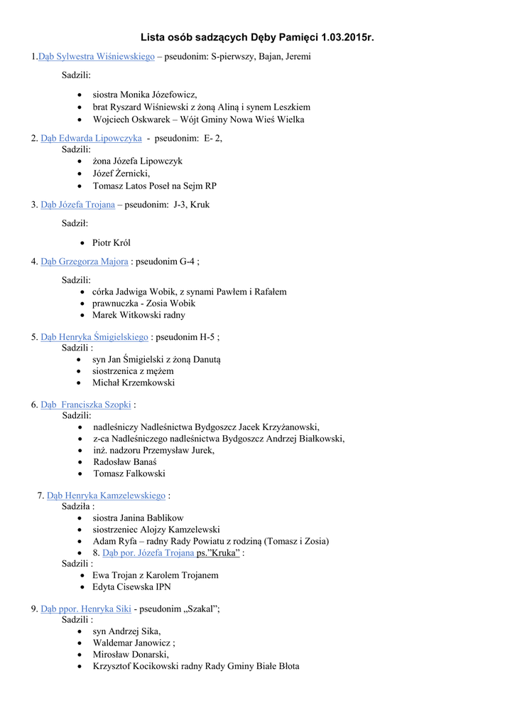 Lista osób sadzących Dęby Pamięci 1.03.2015r. 1.Dąb Sylwestra Wiśniewskiego – pseudonim: S-pierwszy, Bajan, Jeremi Sadzili: siostra Monika Józefowicz, brat Ryszard Wiśniewski z żoną Aliną i synem Leszkiem Wojciech Oskwarek – Wójt Gminy Nowa Wieś Wielka 2. Dąb Edwarda Lipowczyka - pseudonim: E- 2, Sadzili: żona Józefa Lipowczyk Józef Żernicki, Tomasz Latos Poseł na Sejm RP 3. Dąb Józefa Trojana – pseudonim: J-3, Kruk Sadził: Piotr Król 4. Dąb Grzegorza Majora : pseudonim G-4 ; Sadzili: córka Jadwiga Wobik, z synami Pawłem i Rafałem prawnuczka - Zosia Wobik Marek Witkowski radny 5. Dąb Henryka Śmigielskiego : pseudonim H-5 ; Sadzili : syn Jan Śmigielski z żoną Danutą siostrzenica z mężem Michał Krzemkowski 6. Dąb Franciszka Szopki : Sadzili: nadleśniczy Nadleśnictwa Bydgoszcz Jacek Krzyżanowski, z-ca Nadleśniczego nadleśnictwa Bydgoszcz Andrzej Białkowski, inż. nadzoru Przemysław Jurek, Radosław Banaś Tomasz Falkowski 7. Dąb Henryka Kamzelewskiego : Sadziła : siostra Janina Bablikow siostrzeniec Alojzy Kamzelewski Adam Ryfa – radny Rady Powiatu z rodziną (Tomasz i Zosia) 8. Dąb por. Józefa Trojana ps.”Kruka” : Sadzili : Ewa Trojan z Karolem Trojanem Edyta Cisewska IPN 9. Dąb ppor. Henryka Siki - pseudonim „Szakal”; Sadzili : syn Andrzej Sika, Waldemar Janowicz ; Mirosław Donarski, Krzysztof Kocikowski radny Rady Gminy Białe Błota 10. Dąb Zbigniewa Kłosa ps. „Groźny” Sadzili : brat Ryszard Kłos z żoną i bratankiem Marcinem Maciej Kulpa Wójt Gminy Białe Błota Łukasz Kulpa 11. Dąb Franciszka Główczewskiego ps. „Wysoki” : Sadzili : córka Bożena Porożyńska z mężem Zbigniewem i córką Marek Witkowski 12. Dąb Mieczysława Kwaśniewskiego ps. „Sęk” Sadzili: Rafał Piasecki z rodziną, Jarosław Zwoliński 13. Dąb Bogdana Wiśniewskiego ps. ”Błysk Sadziła : żona Lubomira Wiśniewska Aleksandra Lubońska z harcerzami 14. Dąb sanitariuszki Reginy Nowak ps. „Szarotka” Jerzy Wachniew z harcerzami 15. Dąb Heleny Trojan siostry por. „Kruka” Sadziły : córki Teresa Szlachetka oraz bratanica „Kruka” Barbara Górska 16. Dąb Henryka Malickiego ps. „Zawisza” : Sadziła : córka Alicja Kalemba z mężem Zenonem syn „Zawiszy” Jarosław Malicki Michał Wyszomirski Jan Schilke 17. Dąb Tadeusza Gadaszewskiego Sadzili: syn Paweł Gadaszewski brat Florian Gadaszewski 18. Dąb Czesława Siwińskiego Sadzili: Alicja Żaguń, Elżbieta Wysocka 19. Dąb Janusza Romana ps. „Robert” Sadzili: Sławomir Witkowicz