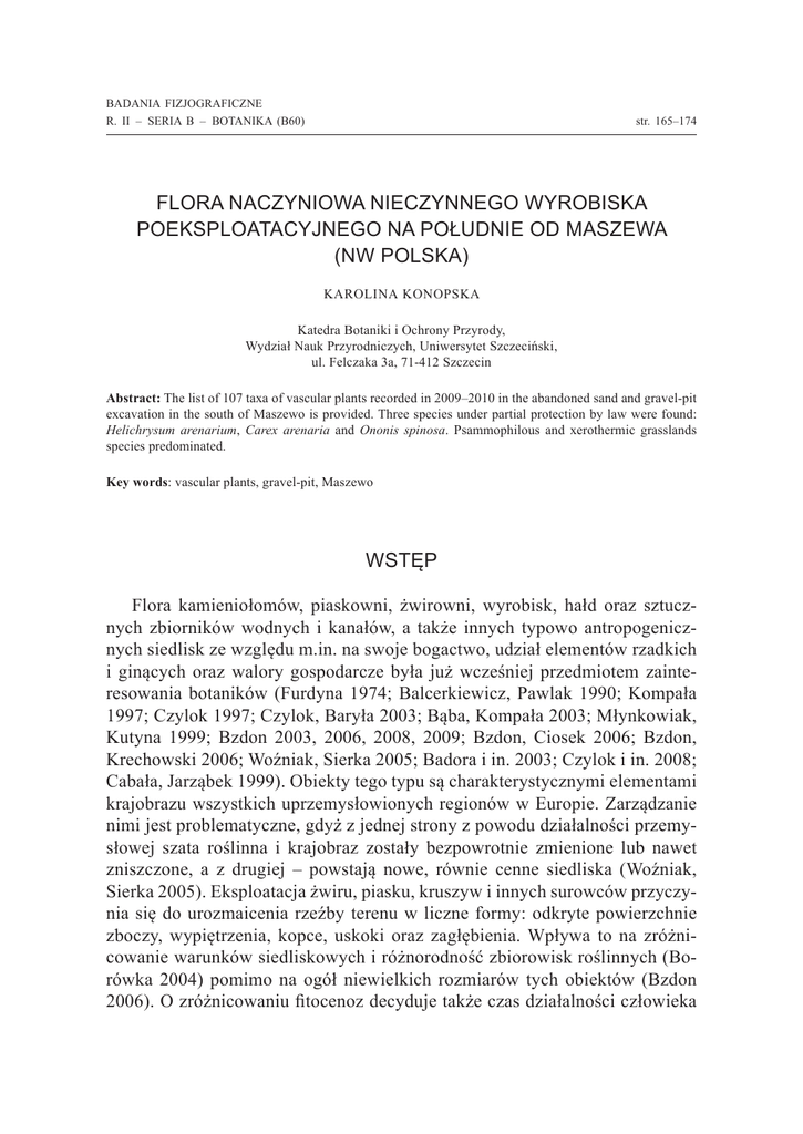 BADANIA FIZJOGRAFICZNE R. II – SERIA B – BOTANIKA (B60) str. 165–174 Flora naczyniowa nieczynnego wyrobiska poeksploatacyjnego na południe od Maszewa (NW Polska) Flora naczyniowa nieczynnego wyrobiska poeksploatacyjnego Karolina Konopska Katedra Botaniki i Ochrony Przyrody, Wydział Nauk Przyrodniczych, Uniwersytet Szczeciński, ul. Felczaka 3a, 71-412 Szczecin Abstract: The list of 107 taxa of vascular plants recorded in 2009–2010 in the abandoned sand and gravel-pit excavation in the south of Maszewo is provided. Three species under partial protection by law were found: Helichrysum arenarium, Carex arenaria and Ononis spinosa. Psammophilous and xerothermic grasslands species predominated. Key words: vascular plants, gravel-pit, Maszewo Wstęp Flora kamieniołomów, piaskowni, żwirowni, wyrobisk, hałd oraz sztucznych zbiorników wodnych i kanałów, a także innych typowo antropogenicznych siedlisk ze względu m.in. na swoje bogactwo, udział elementów rzadkich i ginących oraz walory gospodarcze była już wcześniej przedmiotem zainteresowania botaników (Furdyna 1974; Balcerkiewicz, Pawlak 1990; Kompała 1997; Czylok 1997; Czylok, Baryła 2003; Bąba, Kompała 2003; Młynkowiak, Kutyna 1999; Bzdon 2003, 2006, 2008, 2009; Bzdon, Ciosek 2006; Bzdon, Krechowski 2006; Woźniak, Sierka 2005; Badora i in. 2003; Czylok i in. 2008; Cabała, Jarząbek 1999). Obiekty tego typu są charakterystycznymi elementami krajobrazu wszystkich uprzemysłowionych regionów w Europie. Zarządzanie nimi jest problematyczne, gdyż z jednej strony z powodu działalności przemysłowej szata roślinna i krajobraz zostały bezpowrotnie zmienione lub nawet zniszczone, a z drugiej – powstają nowe, równie cenne siedliska (Woźniak, Sierka 2005). Eksploatacja żwiru, piasku, kruszyw i innych surowców przyczynia się do urozmaicenia rzeźby terenu w liczne formy: odkryte powierzchnie zboczy, wypiętrzenia, kopce, uskoki oraz zagłębienia. Wpływa to na zróżnicowanie warunków siedliskowych i różnorodność zbiorowisk roślinnych (Borówka 2004) pomimo na ogół niewielkich rozmiarów tych obiektów (Bzdon 2006). O zróżnicowaniu fitocenoz decyduje także czas działalności człowieka 166 Ka roli na Konopska w danym wyrobisku oraz czas, który upłynął od zaniechania eksploatacji (Borówka 2004). Tereny poprzemysłowe pozornie mogą być uważane za ubogie. Jednak wyniki wielu badań florystycznych dowodzą, że bardzo zniekształcone obszary mogą stanowić cenne siedliska dla wielu taksonów. Na nierekultywowanych fragmentach wyrobisk podczas sukcesji roślinności wykształcają się unikatowe układy biocenotyczne, stanowiące często ostoje dla rzadkich, zagrożonych i chronionych gatunków (Bzdon, Ciosek 2006; Czylok i in. 2008). Obiekty tego typu, jak i inne marginesy ekologiczne, są więc siedliskami zastępczymi dla cennych taksonów (Bzdon 2006). Wyrobiska poeksploatacyjne przedstawiają w efekcie zaprzestania wydobycia interesującą wartość przyrodniczą godną poznania i ochrony (Badora i in. 2003). Celem niniejszego opracowania jest przedstawienie i próba scharakteryzowania flory naczyniowej nieczynnego od 13 lat wyrobiska w okolicach Maszewa na Pomorzu Zachodnim. Florę tę zinwentaryzowano i zestawiono oraz omówiono pod względami: systematycznym, udziału grup historyczno-geograficznych, socjologiczno-ekologicznych, form życiowych i elementów geograficznych. Ponadto wykazano obecność gatunków chronionych. Opracowanie dostarcza informacji o bogactwie florystycznym tego niezbadanego dotąd obiektu. Teren i metoda Badaniami zostało objęte największe wyrobisko znajdujące się na północnym krańcu ozu przy drodze Maszewo–Stargard Szczeciński. Wydobycie piasku i żwiru zakończono tam w 1998 r. Żwirownia leży na południe od Maszewa (ryc. 1), na krawędzi rynny maszewsko-tychowskiej, w obrębie północnego wału ozów maszewskich. Powierzchnia odkrywki wynosi łącznie około 10 ha. Ściany wyrobiska sięgają 6 m wysokości. Znaczne powierzchnie nadal pozbawione są okrywy roślinnej. Wyrobisko ze względu na swoje położenie jest mocno eksponowane od strony drogi i miasta Maszewa (Waloryzacja przyrodnicza…, 2001). Terenowe badania florystyczne opisywanego obiektu prowadzono w sezonach wegetacyjnych w latach 2009–2010. Dane gromadzono w postaci spisów florystycznych. Wykaz stwierdzonych taksonów przedstawiono w tabeli 1. Nazewnictwo gatunków oparto na opracowaniu Mirka i in. (2002). Florę scharakteryzowano pod względem: struktury systematycznej (Rutkowski 2007), przynależności do form życiowych Raunkiaera (Zarzycki i in. 2002), grup geograficzno-historycznych (Kornaś 1968; Chmiel 1993; Zając i in. 1998) oraz grup socjologiczno-ekologicznych (Zarzycki i in. 2002). Określono wskaźniki ekologiczne: świetlny (L), wilgotności gleb (W) i stanu troficznego (TR) (Zarzycki i in. 2002). Status gatunków chronionych wskazano na podstawie F lora na czyn iowa niec zynn ego wy robiska p oeks p loata c yjn e go 167 Ryc. 1. Położenie nieczynnego żwirowiska w Maszewie 1 – droga; 2 – las; 3 – staw; 4 – żwirowisko Fig. 1. Location of abandoned gravel-pit in Maszewo 1 – road; 2 – forest; 3 – pond; 4 – gravel-pit Rozporządzenia…, 2004. Elementy geograficzne flory wyróżniono według Chmiela (1993), Pawłowskiej (1977) oraz Zając i Zająca (2009). Wyniki i dyskusja W trakcie badań stwierdzono występowanie 107 gatunków roślin naczyniowych. Wykazane gatunki należą do 31 rodzin, z czego najliczniej reprezentowane są rodziny: Asteraceae (24 gat.), Poaceae (16 gat.) i Fabaceae (15 gat.). Fitocenozy wykształcające się w obrębie wyrobisk są zbiorowiskami pionierskimi, a spontaniczny rozwój szaty roślinnej na odsłoniętych zboczach i w zagłębieniach związany jest z pierwszym stadium sukcesji. Gatunki z łatwością opanowujące te specyficzne siedliska na terenach poeksploatacyjnych wyróżniają się określonymi cechami morf