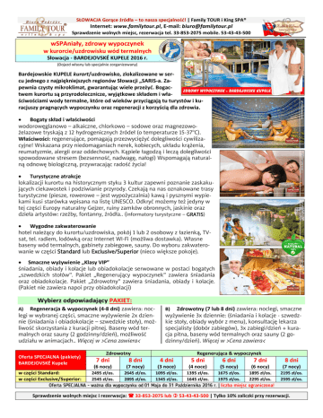 SŁOWACJA Gorące źródła – to nasza specjalność! | Family TOUR i King SPA® Internet: www.familytour.pl, E-mail: [email protected] Sprawdzenie wolnych miejsc, rezerwacja tel. 33-853-2075 mobile. 53-43-43-500 wSPAniały, zdrowy wypoczynek w kurorcie/uzdrowisku wód termalnych Słowacja - BARDEJOVSKÉ KUPELE 2016 r. (Dojazd własny lub specjalnie zorganizowany) Bardejowskie KUPELE kurort/uzdrowisko, zlokalizowane w sercu jednego z najpiękniejszych regionów Słowacji „SARIS-a. Zapewnia czysty mikroklimat, gwarantując wiele przeżyć. Bogactwem kurortu są przyrodolecznicze, wyjątkowe składem i właściwościami wody termalne, które od wieków przyciągają tu turystów i kuracjuszy pragnących wypoczynku oraz regeneracji z korzyścią dla zdrowia. Bogaty skład i właściwości wodorowęglanowo – alkaiczne, chlorkowo – sodowe oraz magnezowożelazowe tryskają z 12 hydrogenicznych źródeł (o temperaturze 15-37oC). Właściwości: regenerujące, pomagają przezwyciężyć dolegliwości cywilizacyjne! Wskazana przy niedomaganiach nerek, kobiecych, układu krążenia, reumatyzmie, alergii oraz oddechowych. Kąpiele łagodzą i leczą dolegliwości spowodowane stresem (bezsenność, nadwagę, nałogi) Wspomagają naturalną odnowę biologiczną, przywracając radość życia! Turystyczne atrakcje lokalizacji kurortu na historycznym styku 3 kultur zapewni poznanie zaskakujących ciekawostek i podziwianie przyrody. Czekają na nas oznakowane trasy turystyczne (piesze, rowerowe – jest wypożyczalnia) kawą i pysznymi wypiekami kusi starówka wpisana na listę UNESCO. Odkryć możemy też jedyny w tej części Europy naturalny Gejzer, ruiny zamków obronnych, jaskinie oraz dzieła artystów: rzeźby, fontanny, źródła.. (informatory turystyczne – GRATIS) Wygodne zakwaterowanie hotel należący do kurortu/uzdrowiska, pokój 1 lub 2 osobowy z łazienką, TVsat, tel. radiem, lodówką oraz Internet WI-Fi (możliwa dostawka). Własne baseny wód termalnych, gabinety zabiegowe, sauny. Do wyboru zakwaterowanie w części Standard lub Exclusive/Superior (nieco większe pokoje). Smaczne wyżywienie „Klasy VIP” śniadania, obiady i kolacje lub obiadokolacje serwowane w postaci bogatych „szwedzkich stołów”. Pakiet „Regenerujący wypoczynek” zawiera śniadania oraz obiadokolacje. Pakiet „Zdrowotny” zawiera śniadania, obiady i kolacje. (Pakiet nie zawiera napoi przy obiadokolacji) Wybierz odpowiadający PAKIET: Regeneracja & wypoczynek (4-8 dni) zawiera: noclegi w wybranej części, smaczne wyżywienie 2x dziennie (śniadania i obiadokolacje – szwedzkie stoły), możliwość skorzystania z kuracji pitnej. Baseny wód termalnych oraz sauny (2 godzinny/dzień), możliwość udziału w animacjach.. Więcej w >Cena zawiera< A) Oferta SPECJALNA (pakiety) BARDEJOVSKÉ Kupele w części Standard: w części Exclusive/Superior: Zdrowotny (7 lub 8 dni) zawiera: noclegi, smaczne wyżywienie 3x dziennie: (śniadania i kolacje - szwedzkie stoły, obiady wybór z menu), konsultację lekarza specjalisty (dobór zabiegów), 3x zabiegi/dzień + kuracja pitna, baseny wód termalnych oraz sauny (2 godzinny/dzień). Więcej w >Cena zawiera< B) Zdrowotny Regenerująca & wypoczynek 7 dni 8 dni 4 dni 5 dni 6 dni 7 dni 8 dni (6 nocy) (7 nocy) (3 noce) (4 noce) (5 nocy) (6 nocy) (7 nocy) 2495 zł/os. 2545 zł/os. 2645 zł/os. 2895 zł/os. 1095 zł/os. 1345 zł/os. 1395 zł/os. 1645 zł/os. 1675 zł/os. 1975 zł/os. 1895 zł/os. 2295 zł/os. 2195 zł/os. 2595 zł/os. Sprawdzenie wolnych miejsc i rezerwacja: 33-853-2075 lub 53-43-43-500 | Tylko 10% zaliczki przy rezerwacji. 2|Strona Kompleksowy, zdrowy wypoczynek w kurorcie wód termalnych.. Bardejovské KUPELE 2016 r. Cena zawiera: • 3 / 4 / 5 / 6 lub 7 nocy, kurort/uzdrowisko Bardejovskie Kupele • smaczne wyżywienie (2 lub 3x dziennie – wg wybranego pakietu) • baseny wód termalnych, sauny, fitness (2 godziny/dzień) – GRATIS All Inclusive • możliwość udziału w animacjach i programie kulturalnym • możliwość skorzystania z kuracji pitnej wód mineralnych (oczyszczenie, regeneracja, detox..) • faktura VAT (polski rachunek) pozwalający skorzystać z funduszu socjalnego i odliczeń • pakiet ubezpieczeń KL + NNW Signal Iduna • oraz KL + NNW chorób przewlekłych do 10 000 € • przed wypoczynkiem pomocne informatory turystyczne • mapa dojazdu i atrakcji • Pakiet „ZDROWOTNY” – dodatkowo zapewnia: konsultacja lekarza specjalisty (dobór zabiegów), 3x zabiegi/dzień (oprócz niedzieli i świąt) dobraną indywidualnie kurację pitną wód mineralnych. Cena nie zawiera: opłaty klimatycznej 1 €/dzień, parkingowej - miejsca bezpłatne i płatne. Pokój jednoosobowy +20%. Zniżki: dziecko do lat 2 GRATIS! do lat 12 na dostawce –25%, Klub F. T®” – 45 zł. Wczesna rezerwacja -2%. Sprawdzenie wolnych miejsc i rezerwacja: 33-853-2075 lub 53-43-43-500 | Tylko 10% zaliczki przy rezerwacji.