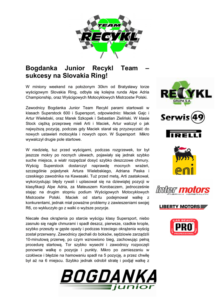 Bogdanka Junior Recykl sukcesy na Slovakia Ring! Team – W miniony weekend na położonym 30km od Bratysławy torze wyścigowym Slovakia Ring, odbyła się kolejna runda Alpe Adria Championship, oraz Wyścigowych Motocyklowych Mistrzostw Polski. Zawodnicy Bogdanka Junior Team Recykl parami startowali w klasach Superstock 600 i Supersport, odpowiednio: Maciek Gajc i Artur Wielebski, oraz Marek Szkopek i Sebastian Zieliński. W klasie Stock ciężką przeprawę mieli Arti i Maciek, Artur walczył o jak najwyższą pozycję, podczas gdy Maciek starał się przyzwyczaić do nowych ustawień motocykla i nowych opon. W Supersport Mikro wywalczył drugie pole startowe. W niedzielę, tuz przed wyścigami, podczas rozgrzewek, tor był jeszcze mokry po nocnych ulewach, pojawiały się jednak szybko suche miejsca, a wiatr rozpędzał dosyć szybko deszczowe chmury. Wyścig Superstock dostarczył naprawdę mocnych wrażeń, szczególnie pojedynek Artura Wielebskiego, Adriana Paska i czeskiego zawodnika na Kawasaki. Tuż przed metą, Arti zaatakował, wykorzystując błędy rywali i uplasował się na dziewiątej pozycji w klasyfikacji Alpe Adria, za Mateuszem Korobaczem, jednocześnie stając na drugim stopniu podium Wyścigowych Motocyklowych Mistrzostw Polski. Maciek od startu podejmował walkę z konkurentami, jednak miał poważne problemy z zawieszeniami swojej R6, co wykluczyło go z walki o wyższe pozycje. Niecałe dwa okrążenia po starcie wyścigu klasy Supersport, niebo zasnuło się nagle chmurami i spadł deszcz, pierwsze, rzadkie krople, szybko przeszły w gęste opady i podczas trzeciego okrążenia wyścig został przerwany. Zawodnicy zjechali do boksów, sędziowie zarządzili 10-minutową przerwę, po czym wznowiono bieg, zachowując pełną procedurę startową. Tor szybko wysechł i zawodnicy rozpoczęli ponownie walkę o pozycje i punkty. Mikro po zamieszaniu w czołówce i błędzie na hamowaniu spadł na 5 pozycję, a przez chwilę był aż na 6 miejscu. Szybko jednak odrobił stratę i podjął walkę z Danielem Bukowskim, wyprzedzając go tuż przed metą i kończąc wyścig na drugiej pozycji. W klasyfikacji WMMP Szkopek był bezkonkurencyjny, w Alpe Adria zajął drugą pozycję tuż za rewelacyjnie jadącym Patrikiem Vostarkiem z Czech. Sebastian Zieliński po zaciętej walce, ukończył wyścig na 11 pozycji i zainkasował 5 punktów do klasyfikacji AAC i WMMP. Artur Wielebski: „Ciężki weekend, ale rewelacyjny wyścig, znakomicie bawiliśmy się z Adrianem, myślę, że publiczność była zadowolona z naszych pojedynków. Fakt jest taki, że przez to straciliśmy kilka sekund do poprzedzającej nas grupy, ale taką jazdę uwielbiam!” Marek Szkopek: „Wyścig przerwano, po wznowieniu popełniłem błąd w zakręcie, tylna opona ślizgała się mocno i prawie zaliczyłem wysiadkę z motocykla, oddając pola konkurentom. Musiałem odrabiać stratę, wykorzystując każdą okazję do ataku i wyprzedzania. Udało się, jestem szczęśliwy z wyniku niedzielnego starcia. Tym razem Vostarek był poza zasięgiem, ale jeszcze wszystko przed nami. Mam ogromny apetyt na kolejne sukcesy!” Połowa sezonu WMMP już za nami, w dalszym ciągu jesteśmy liderem w klasyfikacji sponsorskiej w klasie Supersport, oraz wiceliderem w Superstock 600 Junior. Klasyfikacja generalna WMMP: Supersport: 1 Daniel Bukowski 67 pkt. 2 Marek Szkopek 64 pkt. 3 Marcin Kałdowski 58 pkt. 4 Patrik Vostarek 37 pkt. 5 Claudio Conti 34 pkt. Junior Superstock 600: 1 Mateusz Korobacz 106 pkt. 2 Artur Wielebski 76 pkt. 3 Adrian Pasek 53 pkt. 4 Kuba Wróblewski 50 pkt. 5 Michał Orlikowski 48 pkt. Zapraszamy na nasz profil na Facebook oraz na stronę internetową naszego głównego sponsora, Recykl Grupa S.A. Naszymi motocyklami zajmuje się warszawski Serwis49, ul. Łopuszańska 49, 02-232 Warszawa.