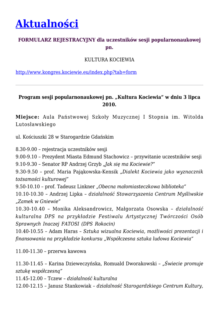 Aktualności FORMULARZ REJESTRACYJNY dla uczestników sesji popularnonaukowej pn. KULTURA KOCIEWIA http://www.kongres.kociewie.eu/index.php?tab=form Program sesji popularnonaukowej pn. „Kultura Kociewia” w dniu 3 lipca 2010. Miejsce: Aula Państwowej Szkoły Muzycznej I Stopnia im. Witolda Lutosławskiego ul. Kościuszki 28 w Starogardzie Gdańskim 8.30-9.00 – rejestracja uczestników sesji 9.00-9.10 – Prezydent Miasta Edmund Stachowicz – przywitanie uczestników sesji 9.10-9.30 – Senator RP Andrzej Grzyb „Jak się ma Kociewie?” 9.30-9.50 – prof. Maria Pająkowska-Kensik „Dialekt Kociewia jako wyznacznik tożsamości kulturowej” 9.50-10.10 – prof. Tadeusz Linkner „Obecna małomiasteczkowa biblioteka” 10.10-10.30 – Andrzej Lipka – działalność Stowarzyszenia Centrum Myśliwskie „Zamek w Gniewie” 10.30-10.40 – Monika Aleksandrowicz, Małgorzata Osowska – działalność kulturalna DPS na przykładzie Festiwalu Artystycznej Twórczości Osób Sprawnych Inaczej FATOSI (DPS Rokocin) 10.40-10.55 – Adam Haras – Sztuka wizualna Kociewia, możliwości prezentacji i finansowania na przykładzie konkursu „Współczesna sztuka ludowa Kociewia” 11.00-11.30 – przerwa kawowa 11.30-11.45 – Karina Dzieweczyńska, Romuald Dworakowski – „Świecie promuje sztukę współczesną” 11.45-12.00 – Tczew – działalność kulturalna 12.00-12.15 – Janusz Stankowiak – działalność Starogardzkiego Centrum Kultury, na przykładzie Międzynarodowego Festiwalu Kultur VERIZANE 12.15-12.25 – Zbigniew Potocki „Jak działają kociewskie instytucje „historyczne” a zwłaszcza muzea, na przykładzie Muzeum Ziemi Kociewskiej w Starogardzie Gdańskim 12.25-12.35 – Grzegorz Oller – działalność kulturalna Ogniska Pracy Pozaszkolnej 12.35-12.50 – Dominika Muszyńska – „Rewitalizacja małego miasta na przykładzie Koronowa” 12.50-13.05 – dr Włodzimierz Moch – „Kultura języka mediów na przykładzie portalu internetowego Kociewiak.pl” 13.05-13.20 – dr inż. Magdalena Warmińska – „Kociewskie dziedzictwo kulinarne” 13.30 – przerwa kulinarna 14.00 – zakończenie sesji DNI STAROGARDU 2010 2 – 4 lipca piątek 2 lipca „Czar musicalu” Kościół pw. NSPJ Łapiszewo godz. 19.00 – koncert organowy pod tytułem „Opera i operetka” w wykonaniu wirtuoza Gedymina Grubby i solistki Anity Rywalskiej – Sosnowskiej Anita Rywalska-Sosnowska ma w swoim repertuarze utwory Franza Schuberta, Francisa Poulenca oraz Roberta Schumanna. Śpiewa partie operowe i operetkowe takie jak partia Carmen z opery „Carmen” Georges’a Bizeta. Jest jedną z czwórki solistów show muzyczno – kabaretowego pn. „Filharmonia Dowcipu” Waldemara Malickiego i Jacka Kęcika. Gedymin Grubba – organista, improwizator, kompozytor, aranżer, dyrygent posiadający w swoim repertuarze pełen wachlarz literatury muzycznej, wielokrotnie gościł w naszym mieście za każdym razem budząc entuzjazm melomanów . Rynek Miejski godz. 20.00 Wernisaż plenerowej wystawy fotograficznej pn. „Portret mojego miasta” Na wystawie zostaną zaprezentowane fotografie uczestników pleneru fotograficznego zorganizowanego przez Wydział Promocji i Współpracy Zagranicznej we współpracy z Trójmiejską Szkołą Fotografii oraz Starogardzkim Towarzystwem Fotograficznym w ramach projektu pn. „Starogard w fotografii” realizowanego w latach 2010-2012. godz. 21.00 Oficjalne rozpoczęcie Dni Starogardu godz. 21.10 „Czar musicalu” widowisko plenerowe w wykonaniu aktorów i tancerzy Teatru Broadway Teatr Broadway znany jest ze swoich barwnych widowisk, które przenoszą widza w świat musicalu serwując w ciągu dwóch godzin koncertu przeboje tego gatunku muzyki wzbogacone sekwencjami tanecznymi i anegdotkami konferansjera. godz. 23.00 zakończenie programu sobota 3 lipca „Kultura Kociewia” Aula Państwowej Szkoły Muzycznej I Stopnia im. Witolda Lutosławskiego ul. Kościuszki 28 godz. 9.00 Sesja popularnonaukowa pt. „Kultura Kociewia” W trzech największych miastach Kociewia: Świeciu, Tczewie oraz Starogardzie Gdańskim zaplanowano w ramach IV Kongresu Kociewskiego, jak podczas poprzednich kongresów, główne wydarzenia Kociewskiego Roku Kongresowego. W Tczewie, 8 maja, wydarzenia kongresowe przebiegły one pod hasłem Historia, w Świeciu 8 maja odbył się Jarmark Na Kociewiu, a na 16 października zaplanowano sesję naukową o edukacji regionalnej. W Stolicy Kociewia rozmawiać będziemy o kulturze regionu. Kulturę prezentowaną na sesji rozumieć będziemy jako ogół wytworów ludzi mieszkających na Kociewiu, zarówno materialnych, jak i niematerialnych, dlatego omawiane będą m.in. zagadnienia z zakresu: kultury języka, kultury mediów, kultury przestrzeni, kultury kulinarnej czy terapii kulturą, a także poznamy ofertę kulturalną największych miast Kociewia. Rynek Miejski godz. 13.30 Wielki Jarmark Kociewski Wielki Jarmark Kociewski wyrósł z tradycji festynów „Raz na ludowo”. Na starogardzkim rynku pojawią się reprezentanci wszystkich dziedzin kultury: plastyki, muzyki, teatru, filmu, literatury i nauki. Poza ogródkami gastronomicznymi, prezentacjami dzieł poszczególnych artystów, wystawami, warsztatami, prezentacjami na jarmarkowej scenie, koncertami czołowych zespołów regionalnych i pokazów rycerskich, starogardzki jarmark to także bogata oferta handlowa. Scena główna: na scenie głównej odbędą się prezentacje zespołów z Kociewia: 13:30 – 13:45 – Zespół Sygnalistów Myśliwskich z Gniewa 13:45 – 14:10 – Zespół Folklorystyczny „Burczybas” z Gniewa 14:10 – 14:40 – Zespół pieśni i tańca „Kociewie Retro” ze Starogardu Gd. 14:40 – 15:00 – „Adalbertus” chór z parafii pw. św. Wojciecha w Starogardzie Gd. 15:00 – 15:30 – Zespół Folklorystyczny „Piaseckie Kociewiaki” z Piaseczna 15:30 – 16:00 – Kociewski Zespół Folklorystyczny „Rodzina” ze Zblewa 16:00 – 1