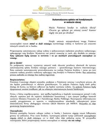 Hubertus – Premium Concierge, ul. Obrzeżna 1B/114, 02-691 Warszawa www.premiumconcierge.pl i Automatyczna spłata rat kredytowych w walucie obcej Macie Państwo kredyt w walucie obcej? Chcecie go spłacać po niższej cenie? Kantor nigdy nie jest po drodze? Dzięki ustawie antyspredowej mogą Państwo zaoszczędzić nawet 200zł w skali miesiąca wymieniając walutę w kantorze po znacznie niższych cenach niż w banku. Proponujemy automatyczny zakup waluty z jednoczesnym nadaniem przelewu walutowego, spłacającego ratę kredytu. Wystarczy raz puścić maszynę w ruch, aby działała co miesiąc. Raty opłacane będą zawsze w terminie i to po stawkach pozwalających oszczędzać co miesiąc. Jak to działa? Po podpisaniu umowy, wystarczy ustawić stałe zlecenie przelewu złotówek do sytemu automatycznej spłaty kredytu naszego partnera – sprawdzonego kantoru internetowego. Rata zostanie automatycznie przewalutowana na walutę Państwa kredytu i zaraz po tym zostanie nadany przelew walutowy spłacający ratę kredytu w Państwa banku. Raz ustawiony proces zadziała co miesiąc bez żadnej ingerencji. Bezpieczeństwo. Premium Concierge objaśni wszystko, podpisze z Państwem umowę i uruchomi proces, ale nie będzie pośredniczyć w obrocie gotówkowym. To jedynie Państwo będą mieli pełny dostęp do konta, na którym odbywać się będzie wymiana waluty. To jedynie Państwo będą dysponować swoimi środkami, jak na własnym internetowym koncie bankowym. Firma, z którą współpracujemy, jest spółką kapitałową o kapitale wynoszącym ponad 2 mln złotych, wpisana jest do rejestru działalności kantorowej i tym samym podlega kontroli zarówno Ministra Finansów jak i Narodowego Banku Polskiego. Rozwiązania informatyczne zostały przygotowane w oparciu o międzynarodowe standardy zabezpieczeń przez doświadczone firmy obsługujące również takich klientów jak MSWiA. Wszystko to daje gwarancję bezpieczeństwa. Oszczędności. Różnice pomiędzy kursem zakupu waluty w banku i kantorze sięgają nawet kilkunastu groszy na jednostce. Przy racie kredytu, wynoszącej jedynie tysiąc jednostek oszczędności sięgają 200zł w skali miesiąca, co w skali roku daje pokaźną sumę. W przypadku rozwiązania, które proponujemy można oszczędzać co miesiąc nic nie robiąc. Hubertus – Premium Concierge, ul. Obrzeżna 1B/114, 02-691 Warszawa www.premiumconcierge.pl W praktyce Podpisanie umowy •Premium Concierge przygotuje i podpisze z Państwem stosowną umowę. Nadanie stałego zlecnia przelewu •Wystarczy złozyć stałą dyspozycję przelewu z konta w złotówkach na konto kantoru interentowego. Konto walutowe kredytu Internetowy kantor •Kantor automatycznie przewalutuje złotówki na walutę kredytu oraz zleci jej przelew na konto kredytu. • Voilà rata kredytu właśnie została spłacona, a Państwo otrzymaliście wiadomość sms o kursie wymiany. Korzyści Realne oszczędności co miesiąc. Bezpieczeństwo, dzięki sprawdzonym partnerom. W pełni zautomatyzowany proces. Concierge wszystko przygotuje i wdroży. Pełna kontrola i możliwość rezygnacji w każdej chwili. Jeśli chcą Państwo oszczędzać bez poświęcania czasu, teraz jest taka możliwość. Wystarczy się z nami skontaktować. Z poważaniem, Zespół Premium Concierge 784-535-535