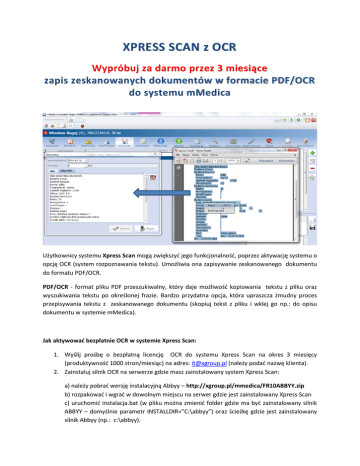 XPRESS SCAN z OCR Wypróbuj za darmo przez 3 miesiące zapis zeskanowanych dokumentów w formacie PDF/OCR do systemu mMedica Użytkownicy systemu Xpress Scan mogą zwiększyć jego funkcjonalność, poprzez aktywację systemu o opcję OCR (system rozpoznawania tekstu). Umożliwia ona zapisywanie zeskanowanego dokumentu do formatu PDF/OCR. PDF/OCR - format pliku PDF przeszukiwalny, który daje możliwość kopiowania tekstu z pliku oraz wyszukiwania tekstu po określonej frazie. Bardzo przydatna opcja, która upraszcza żmudny proces przepisywania tekstu z zeskanowanego dokumentu (skopiuj tekst z pliku i wklej go np.: do opisu dokumentu w systemie mMedica). Jak aktywować bezpłatnie OCR w systemie Xpress Scan: 1. Wyślij prośbę o bezpłatną licencję OCR do systemu Xpress Scan na okres 3 miesięcy (produktywność 1000 stron/miesiąc) na adres: [email protected] (należy podać nazwę klienta). 2. Zainstaluj silnik OCR na serwerze gdzie masz zainstalowany system Xpress Scan: a) należy pobrać wersję instalacyjną Abbyy – http://xgroup.pl/mmedica/FR10ABBYY.zip b) rozpakować i wgrać w dowolnym miejscu na serwer gdzie jest zainstalowany Xpress Scan c) uruchomić instalacja.bat (w pliku można zmienić folder gdzie ma być zainstalowany silnik ABBYY – domyślnie parametr INSTALLDIR=”C:\abbyy”) oraz ścieżkę gdzie jest zainstalowany silnik Abbyy (np.: c:\abbyy). 3. W konfiguracji systemu Xpress Scan w sekcji Konfiguracja dodatku Abbyy FineReader wpisać otrzymany mailem numer seryjny klucza aktywacyjnego (Abbyy FineReader Serial), wpisać poprawnie ścieżkę do zainstalowanego silnika OCR (domyślnie: C:\abbyy\bin) i kliknąć „Aktywacja”. 4. Po prawidłowej aktywacji przy zapisie dokumentu pojawi się nowy przycisk „zapisz OCR” – zapis dokumentów do formatu pdf-ocr. UWAGI: szczegóły dotyczące dodatku OCR znajdziesz w instrukcji instalacji punkt 3.8 Instrukcja instalacji Xpress Scan: http://xgroup.pl/mmedica/v2/instrukcja-istalacji-Xpress-Scan.pdf Kontakt do działu handlowego: od PN do PT w godz. 8.00 -16.00 telefon: (71) 350 55 53 W razie problemów z instalacją dodatku OCR – bezpłatna pomoc techniczna: od PN do PT w godz. 8.00 -16.00 telefon: (71) 350 55 50