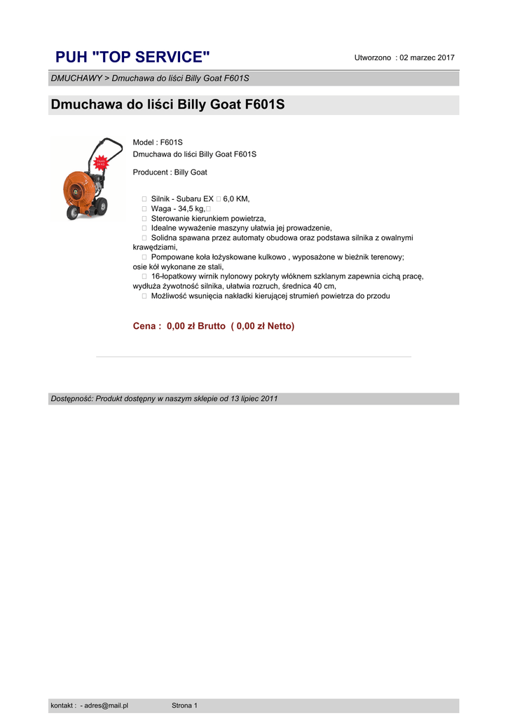 PUH "TOP SERVICE" Utworzono : 02 marzec 2017 DMUCHAWY > Dmuchawa do liści Billy Goat F601S Dmuchawa do liści Billy Goat F601S Model : F601S Dmuchawa do liści Billy Goat F601S Producent : Billy Goat � Silnik - Subaru EX �6,0 KM, � Waga - 34,5 kg,� � Sterowanie kierunkiem powietrza, � Idealne wyważenie maszyny ułatwia jej prowadzenie, � Solidna spawana przez automaty obudowa oraz podstawa silnika z owalnymi krawędziami, � Pompowane koła łożyskowane kulkowo , wyposażone w bieżnik terenowy; osie kół wykonane ze stali, � 16-łopatkowy wirnik nylonowy pokryty włóknem szklanym zapewnia cichą pracę, wydłuża żywotność silnika, ułatwia rozruch, średnica 40 cm, � Możliwość wsunięcia nakładki kierującej strumień powietrza do przodu Cena : 0,00 zł Brutto ( 0,00 zł Netto) Dostępność: Produkt dostępny w naszym sklepie od 13 lipiec 2011 kontakt : - [email protected] Strona 1