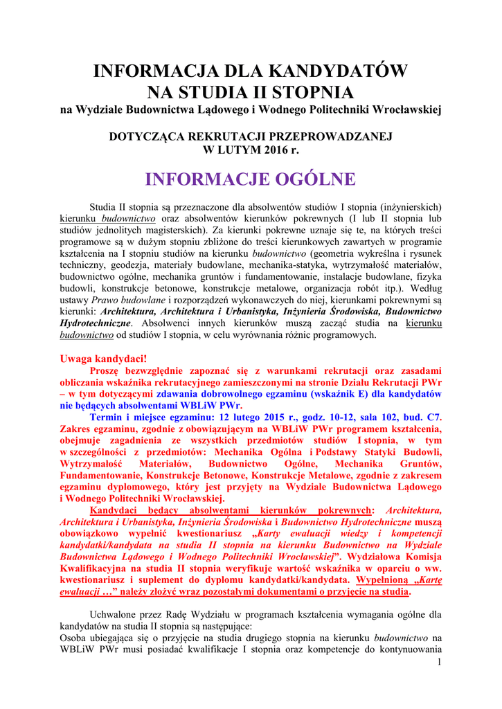 INFORMACJA DLA KANDYDATÓW NA STUDIA II STOPNIA na Wydziale Budownictwa Lądowego i Wodnego Politechniki Wrocławskiej DOTYCZĄCA REKRUTACJI PRZEPROWADZANEJ W LUTYM 2016 r. INFORMACJE OGÓLNE Studia II stopnia są przeznaczone dla absolwentów studiów I stopnia (inżynierskich) kierunku budownictwo oraz absolwentów kierunków pokrewnych (I lub II stopnia lub studiów jednolitych magisterskich). Za kierunki pokrewne uznaje się te, na których treści programowe są w dużym stopniu zbliżone do treści kierunkowych zawartych w programie kształcenia na I stopniu studiów na kierunku budownictwo (geometria wykreślna i rysunek techniczny, geodezja, materiały budowlane, mechanika-statyka, wytrzymałość materiałów, budownictwo ogólne, mechanika gruntów i fundamentowanie, instalacje budowlane, fizyka budowli, konstrukcje betonowe, konstrukcje metalowe, organizacja robót itp.). Według ustawy Prawo budowlane i rozporządzeń wykonawczych do niej, kierunkami pokrewnymi są kierunki: Architektura, Architektura i Urbanistyka, Inżynieria Środowiska, Budownictwo Hydrotechniczne. Absolwenci innych kierunków muszą zacząć studia na kierunku budownictwo od studiów I stopnia, w celu wyrównania różnic programowych. Uwaga kandydaci! Proszę bezwzględnie zapoznać się z warunkami rekrutacji oraz zasadami obliczania wskaźnika rekrutacyjnego zamieszczonymi na stronie Działu Rekrutacji PWr – w tym dotyczącymi zdawania dobrowolnego egzaminu (wskaźnik E) dla kandydatów nie będących absolwentami WBLiW PWr. Termin i miejsce egzaminu: 12 lutego 2015 r., godz. 10-12, sala 102, bud. C7. Zakres egzaminu, zgodnie z obowiązującym na WBLiW PWr programem kształcenia, obejmuje zagadnienia ze wszystkich przedmiotów studiów I stopnia, w tym w szczególności z przedmiotów: Mechanika Ogólna i Podstawy Statyki Budowli, Wytrzymałość Materiałów, Budownictwo Ogólne, Mechanika Gruntów, Fundamentowanie, Konstrukcje Betonowe, Konstrukcje Metalowe, zgodnie z zakresem egzaminu dyplomowego, który jest przyjęty na Wydziale Budownictwa Lądowego i Wodnego Politechniki Wrocławskiej. Kandydaci będący absolwentami kierunków pokrewnych: Architektura, Architektura i Urbanistyka, Inżynieria Środowiska i Budownictwo Hydrotechniczne muszą obowiązkowo wypełnić kwestionariusz „Karty ewaluacji wiedzy i kompetencji kandydatki/kandydata na studia II stopnia na kierunku Budownictwo na Wydziale Budownictwa Lądowego i Wodnego Politechniki Wrocławskiej”. Wydziałowa Komisja Kwalifikacyjna na studia II stopnia weryfikuje wartość wskaźnika w oparciu o ww. kwestionariusz i suplement do dyplomu kandydatki/kandydata. Wypełnioną „Kartę ewaluacji …” należy złożyć wraz pozostałymi dokumentami o przyjęcie na studia. Uchwalone przez Radę Wydziału w programach kształcenia wymagania ogólne dla kandydatów na studia II stopnia są następujące: Osoba ubiegająca się o przyjęcie na studia drugiego stopnia na kierunku budownictwo na WBLiW PWr musi posiadać kwalifikacje I stopnia oraz kompetencje do kontynuowania 1 kształcenia na studiach II stopnia na tym kierunku. Kandydaci ubiegający się o przyjęcie na studia II stopnia na kierunku budownictwo na WBLiW PWr muszą posiadać w szczególności następujące kompetencje: - posiada wiedzę z zakresu fizyki i matematyki, umożliwiającą zrozumienie podstaw fizycznych budownictwa oraz formułowanie i rozwiązywanie prostych zadań z zakresu budownictwa; - posiada wiedzę z zakresu chemii, umożliwiającą zrozumienie podstaw chemicznych właściwości i budowy materiałów budowlanych; - ma umiejętność odczytywania ze zrozumieniem rysunków architektonicznych, budowlanych i geodezyjnych oraz potrafi sporządzić odpowiednią projektową dokumentację graficzną w środowisku wybranych programów CAD; - ma wiedzę i kompetencje z zakresu mechaniki ogólnej, wytrzymałości materiałów oraz zasad ogólnego kształtowania konstrukcji budowlanych; - posiada znajomość i umiejętność stosowania zasad mechaniki i analizy konstrukcji prętowych w zakresie statyki, dynamiki i stateczności; - potrafi przyjąć odpowiednie modele obliczeniowe i wykonać analizę statyczną prostych konstrukcji prętowych statycznie wyznaczalnych i niewyznaczalnych; - posiada wiedzę i umiejętności z zakresu zaprojektowania wybranych elementów i prostych konstrukcji: metalowych, żelbetowych, drewnianych, murowych i zespolonych; - ma wiedzę i podstawowe umiejętności z zakresu projektowania obiektów budownictwa hydrotechnicznego i mostowego oraz związanego z infrastrukturą transportową; - zna podstawy mechaniki gruntów i zasady modelowania, wymiarowania i konstruowania fundamentów; - zna podstawy fizyki budowli oraz rozumie zjawiska dotyczące transferu ciepła i dyfuzji wilgoci w obiektach budowlanych; - potrafi poprawnie wybrać i zastosować narzędzia do rozwiązywania problemów analizy i projektowania obiektów budowlanych oraz prowadzenia robót budowlanych; - umie sporządzić kosztorys i harmonogram robót budowlanych, projekt zagospodarowania placu budowy oraz projekt wykonania robót budowlanych; - ma umiejętności z zakresu interpretacji, prezentacji i dokumentacji wyników prostych eksperymentów oraz prezentacji i dokumentacji wyników realizacji zadań o charakterze projektowym. Na studiach II stopnia mogą być zaliczone osobom, które już studiowały na studiach magisterskich (np. jsm lub studia II stopnia na innym kierunku) przedmioty takie, jak np. Teoria sprężystości, Dynamika, Metody komputerowe (w teorii sprężystości), drugi język obcy. O zaliczenie takich przedmiotów należy wystąpić w systemie Edukacja.CL za pośrednictwem zakładki „złóż podanie” – podanie o włączenie przedmiotu do dorobku. Podanie takie należy złożyć w formie wydruku z systemu (z załącznikami) oraz dokumentacją potwierdzająca zaliczenie (suplement lub indeks) do dnia 4. marca 2016 r. (studenci studiów stacjonarnych