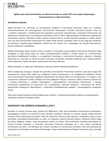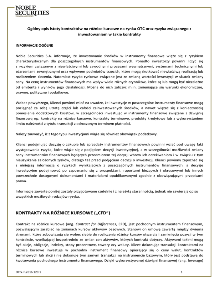 Ogólny opis istoty kontraktów na różnice kursowe na rynku OTC oraz ryzyka związanego z inwestowaniem w takie kontrakty INFORMACJE OGÓLNE Noble Securities S.A. informuje, że inwestowanie środków w instrumenty finansowe wiąże się z ryzykiem charakterystycznym dla poszczególnych instrumentów finansowych. Ponadto inwestorzy powinni liczyć się z ryzykiem związanym z niewłaściwymi lub zawodnymi procesami wewnętrznymi, systemami technicznymi lub zdarzeniami zewnętrznymi oraz wpływem podmiotów trzecich, które mogą skutkować niewłaściwą realizacją lub rozliczeniem zlecenia. Natomiast ryzyko rynkowe związane jest ze zmianą wartości inwestycji w skutek zmiany ceny. Na cenę instrumentów finansowych ma wpływ wiele różnych czynników, które są lub mogą być niezależne od emitenta i wyników jego działalności. Można do nich zaliczyć m.in. zmieniające się warunki ekonomiczne, prawne, polityczne i podatkowe. Wobec powyższego, Klienci powinni mieć na uwadze, że inwestycje w poszczególne instrumenty finansowe mogą pociągnąć za sobą utratę części lub całości zainwestowanych środków, a nawet wiązać się z koniecznością poniesienia dodatkowych kosztów, w szczególności inwestując w instrumenty finansowe związane z dźwignią finansową np. kontrakty na różnice kursowe, kontrakty terminowe, produkty kredytowe lub z wykorzystaniem limitu należności z tytułu transakcji z odroczonym terminem płatności. Należy zauważyć, iż z tego typu inwestycjami wiąże się również obowiązek podatkowy. Klienci podejmując decyzję o zakupie lub sprzedaży instrumentów finansowych powinni wziąć pod uwagę fakt występowania ryzyka, które wiąże się z podjęciem decyzji inwestycyjnej, a w szczególności możliwości zmiany ceny instrumentów finansowych będących przedmiotem tej decyzji wbrew ich oczekiwaniom i w związku z tym nieuzyskania założonych zysków, dlatego też przed podjęciem decyzji o inwestycji, Klienci powinny zapoznać się z niniejszą informacją o ryzykach wynikających z poszczególnych instrumentów finansowych, a decyzje inwestycyjne podejmować po zapoznaniu się z prospektami, raportami bieżących i okresowymi lub innych powszechnie dostępnymi dokumentami i materiałami opublikowanymi zgodnie z obowiązującymi przepisami prawa. Informacje zawarte poniżej zostały przygotowane rzetelnie i z należytą starannością, jednak nie zawierają opisu wszystkich możliwych rodzajów ryzyka. KONTRAKTY NA RÓŻNICE KURSOWE („CFD”) Kontrakt na różnice kursowe (ang. Contract for Differences, CFD), jest pochodnym instrumentem finansowym, pozwalającym zarabiać na zmianach kursów aktywów bazowych. Stanowi on umowę zawartą między dwiema stronami, które zobowiązują się wobec siebie do rozliczenia różnicy kursów otwarcia i zamknięcia pozycji w tym kontrakcie, wynikającej bezpośrednio ze zmian cen aktywów, których kontrakt dotyczy. Aktywami takimi mogą być akcje, obligacje, indeksy, stopy procentowe, towary czy waluty. Klient dokonując transakcji kontraktami na różnice kursowe inwestuje w pochodny instrument finansowy opierający się o ceny walut, kontraktów terminowych lub akcji i nie dokonuje tym samym transakcji na instrumencie bazowym, który jest podstawą do kwotowania pochodnego instrumentu finansowego. Dzięki wykorzystywanej dźwigni finansowej (ang. leverage) OPIS.IF.2016.129.1 1 CFD umożliwia Klientom zawieranie transakcji opiewających na znaczne kwoty przy zaangażowaniu stosunkowo niewielkich środków pieniężnych. Klient jest zobowiązany do posiadania na swoim rachunku pieniężnym środków pieniężnych jedynie w określonej procentowo niewielkiej części wartości CFD (najczęściej od 1% do 10% wartości kontraktu) – stanowiącej tzw. depozyt zabezpieczający. Kontrakty na różnice kursowe to instrumenty finansowe stanowiące przedmiot obrotu na największym rynku przepływu kapitału na świecie – tzw. rynku forex. Kontrakty na różnice kursowe są ze swej istoty instrumentami finansowymi pozwalającymi na osiąganie zysków w związku ze wzrostem lub spadkiem ceny instrumentu bazowego (tzw. underlying). Wartość jednego CFD uzależniona jest od instrumentu bazowego, na którym jest on oparty i szczegółowo zdefiniowana w Tabeli Specyfikacji Instrumentów Finansowych, dostępnej na stronie www.noblemarkets.pl. DEPOZYT ZABEZPIECZAJĄCY W celu otwarcia transakcji na kontrakcie na różnice kursowe wymagana jest określona wartość środków pieniężnych stanowiąca najczęściej niewielką część wartości nominalnej kontraktu. Inwestor może otworzyć transakcję na kontrakcie na różnice kursowe wykorzystując dźwignię tzw. lewar, co skutkuje otwarciem pozycji o znacznej wartości nominalnej przy wykorzystaniu niewielkiego kapitału (depozyt zabezpieczający). PRZYKŁAD Jeżeli depozyt zabezpieczający wymagany do otwarcia transakcji na kontrakcje na różnice kursowe opartym o waluty wynosi 1% wartości nominalnej kontraktu, a wartość nominalna kontraktu wynosi 100.000 zł oznacza to, że depozyt zabezpieczający wynosi 1000 zł. Dokładne wartości pobieranego depozytu zabezpieczającego dla kontraktów na różnice kursowe w ofercie Domu Maklerskiego dostępne są na stronie internetowej, w Tabeli Depozytów: https://www.noblemarkets.pl/handel/regulacje/tabela-depozytow MECHANIZM STOP OUT Mechanizm stop out w normalnych warunkach rynkowych zabezpiecza saldo rachunku przed spadkiem poniżej wartości zdeponowanych na rachunku środków Klienta, co jest realizowane w ten sposób, że Dom Maklerski, automatycznie i bez konieczności otrzymania zgody Klienta, może zamknąć niezamkniętą transakcję Klienta, która generuje, w danym momencie, największą stratę, jeżeli saldo bieżące rejestru operacyjnego jest równe lub niższe niż 50 % aktualnego depozytu zabezpieczającego OTC zablokowanego w ramach NMS, przy czym zamknięcie transakcji dokony