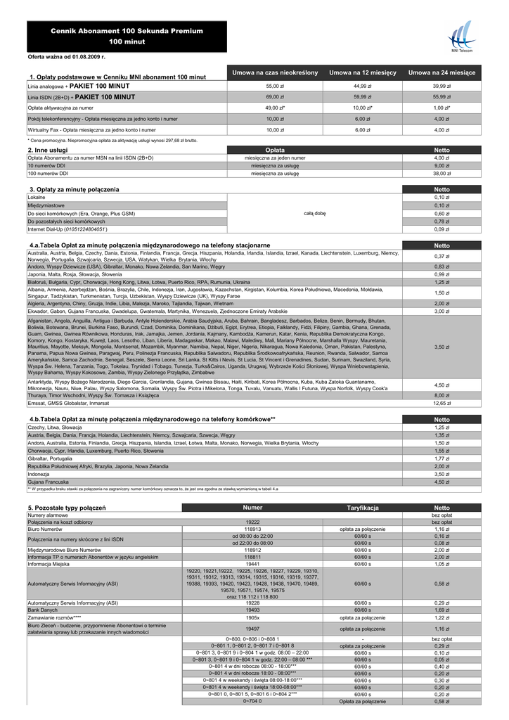 Cennik Abonament 100 Sekunda Premium 100 minut Oferta waŜna od 01.08.2009 r. Umowa na czas nieokreślony Umowa na 12 miesięcy Umowa na 24 miesiące 55,00 zł 44,99 zł 39,99 zł 69,00 zł 59,99 zł 55,99 zł Opłata aktywacyjna za numer 49,00 zł* 10,00 zł* 1,00 zł* Pokój telekonferencyjny - Opłata miesięczna za jedno konto i numer 10,00 zł 6,00 zł 4,00 zł Wirtualny Fax - Opłata miesięczna za jedno konto i numer 10,00 zł 6,00 zł 4,00 zł 1. Opłaty podstawowe w Cenniku MNI abonament 100 minut Linia analogowa + PAKIET 100 MINUT Linia ISDN (2B+D) + PAKIET 100 MINUT * Cena promocyjna. Niepromocyjna opłata za aktywację usługi wynosi 297,68 zł brutto. 2. Inne usługi Opłata Abonamentu za numer MSN na linii ISDN (2B+D) Opłata Netto miesięczna za jeden numer 4,00 zł 10 numerów DDI miesięczna za usługę 9,00 zł 100 numerów DDI miesięczna za usługę 38,00 zł 3. Opłaty za minutę połączenia Netto Lokalne 0,10 zł Międzymiastowe 0,10 zł całą dobę Do sieci komórkowych (Era, Orange, Plus GSM) 0,60 zł Do pozostałych sieci komórkowych 0,78 zł Internet Dial-Up (01051224804051 ) 0,09 zł 4.a.Tabela Opłat za minutę połączenia międzynarodowego na telefony stacjonarne Netto Australia, Austria, Belgia, Czechy, Dania, Estonia, Finlandia, Francja, Grecja, Hiszpania, Holandia, Irlandia, Islandia, Izrael, Kanada, Liechtenstein, Luxemburg, Niemcy, Norwegia, Portugalia, Szwajcaria, Szwecja, USA, Watykan, Wielka Brytania, Włochy Andora, Wyspy Dziewicze (USA), Gibraltar, Monako, Nowa Zelandia, San Marino, Węgry 0,37 zł 0,83 zł Japonia, Malta, Rosja, Słowacja, Słowenia 0,99 zł Białoruś, Bułgaria, Cypr, Chorwacja, Hong Kong, Litwa, Łotwa, Puerto Rico, RPA, Rumunia, Ukraina Albania, Armenia, AzerbejdŜan, Bośnia, Brazylia, Chile, Indonezja, Iran, Jugosławia, Kazachstan, Kirgistan, Kolumbia, Korea Południowa, Macedonia, Mołdawia, Singapur, TadŜykistan, Turkmenistan, Turcja, Uzbekistan, Wyspy Dziewicze (UK), Wyspy Faroe Algieria, Argentyna, Chiny, Gruzja, Indie, Libia, Malezja, Maroko, Tajlandia, Tajwan, Wietnam 1,25 zł Ekwador, Gabon, Gujana Francuska, Gwadelupa, Gwatemala, Martynika, Wenezuela, Zjednoczone Emiraty Arabskie 3,00 zł Afganistan, Angola, Anguilla, Antigua i Barbuda, Antyle Holenderskie, Arabia Saudyjska, Aruba, Bahrain, Bangladesz, Barbados, Belize, Benin, Bermudy, Bhutan, Boliwia, Botswana, Brunei, Burkina Faso, Burundi, Czad, Dominika, Dominikana, DŜibuti, Egipt, Erytrea, Etiopia, Falklandy, FidŜi, Filipiny, Gambia, Ghana, Grenada, Guam, Gwinea, Gwinea Równikowa, Honduras, Irak, Jamajka, Jemen, Jordania, Kajmany, KambodŜa, Kamerun, Katar, Kenia, Republika Demokratyczna Kongo, Komory, Kongo, Kostaryka, Kuwejt, Laos, Lesotho, Liban, Liberia, Madagaskar, Makao, Malawi, Malediwy, Mali, Mariany Północne, Marshalla Wyspy, Mauretania, Mauritius, Mayotte, Meksyk, Mongolia, Montserrat, Mozambik, Myanmar, Namibia, Nepal, Niger, Nigeria, Nikaragua, Nowa Kaledonia, Oman, Pakistan, Palestyna, Panama, Papua Nowa Gwinea, Paragwaj, Peru, Polinezja Francuska, Republika Salwadoru, Republika Środkowoafrykańska, Reunion, Rwanda, Salwador, Samoa Amerykańskie, Samoa Zachodnie, Senegal, Seszele, Sierra Leone, Sri Lanka, St Kitts i Nevis, St Lucia, St Vincent i Grenadines, Sudan, Surinam, Swaziland, Syria, Wyspa Św. Helena, Tanzania, Togo, Tokelau, Trynidad i Tobago, Tunezja, Turks&Cairos, Uganda, Urugwaj, WybrzeŜe Kości Słoniowej, Wyspa Wniebowstąpienia, Wyspy Bahama, Wyspy Kokosowe, Zambia, Wyspy Zielonego Przylądka, Zimbabwe 3,50 zł Antarktyda, Wyspy BoŜego Narodzenia, Diego Garcia, Grenlandia, Gujana, Gwinea Bissau, Haiti, Kiribati, Korea Północna, Kuba, Kuba Zatoka Guantanamo, Mikronezja, Nauru, Niue, Palau, Wyspy Salomona, Somalia, Wyspy Św. Piotra i Mikelona, Tonga, Tuvalu, Vanuatu, Wallis I Futuna, Wyspa Norfolk, Wyspy Cook'a Thuraya, Timor Wschodni, Wyspy Św. Tomasza i KsiąŜęca Emssat, GMSS Globalstar, Inmarsat 1,50 zł 2,00 zł 4,50 zł 8,00 zł 12,65 zł 4.b.Tabela Opłat za minutę połączenia międzynarodowego na telefony komórkowe** Netto Czechy, Litwa, Słowacja 1,25 zł Austria, Belgia, Dania, Francja, Holandia, Liechtenstein, Niemcy, Szwajcaria, Szwecja, Węgry 1,35 zł Andora, Australia, Estonia, Finlandia, Grecja, Hiszpania, Islandia, Izrael, Łotwa, Malta, Monako, Norwegia, Wielka Brytania, Włochy 1,50 zł Chorwacja, Cypr, Irlandia, Luxemburg, Puerto Rico, Słowenia 1,55 zł Gibraltar, Portugalia 1,77 zł Republika Południowej Afryki, Brazylia, Japonia, Nowa Zelandia 2,00 zł Indonezja 3,50 zł Gujana Francuska 4,50 zł ** W przypadku braku stawki za połączenia na zagraniczny numer komórkowy oznacza to, Ŝe jest ona zgodna ze stawką wymienioną w tabeli 4.a 5. Pozostałe typy połączeń Numery alarmowe Połączenia na koszt odbiorcy Biuro Numerów Połączenia na numery skrócone z lini ISDN Międzynarodowe Biuro Numerów Informacja TP o numerach Abonentów w języku angielskim Informacja Miejska Automatyczny Serwis Informacyjny (ASI) Automatyczny Serwis Informacyjny (ASI) Bank Danych Numer 19222 118913 od 08:00 do 22:00 od 22:00 do 08:00 118912 118811 19441 19220, 19221,19222, 19225, 19226, 19227, 19229, 19310, 19311, 19312, 19313, 19314, 19315, 19316, 19319, 19377, 19388, 19393, 19420, 19423, 19428, 19438, 19470, 19489, 19570, 19571, 19574, 19575 oraz 118 112 i 118 800 19228 19493 Taryfikacja Netto opłata za połączenie 60/60 s 60/60 s 60/60 s 60/60 s 60/60 s bez opłat bez opłat 1,16 zł 0,16 zł 0,08 zł 2,00 zł 2,00 zł 1,05 zł 60/60 s 0,58 zł 60/60 s 60/60 s 0,29 zł 1,69 zł 1,22 zł Zamawianie rozmów**** 1905x opłata za połączenie Biuro Zleceń - budzenie, przypomnienie Abonentowi o terminie załatwiania sprawy lub przekazanie innych wiadomości 19497 opłata za połączenie 1,16 zł 0~800, 0~806 i 0~808 1 0~801 1, 0~801 2, 0~801 7 i 0~801 8 0~801 3, 0~801 9 i 0~804 1 w godz. 08:00 – 22:00 0~801 3, 0~801 9 i 0~804 1 w godz. 22:00 – 08:00 *** 0~801 4 w dni robocze 08:00 - 18:00*** 0~801 4 w