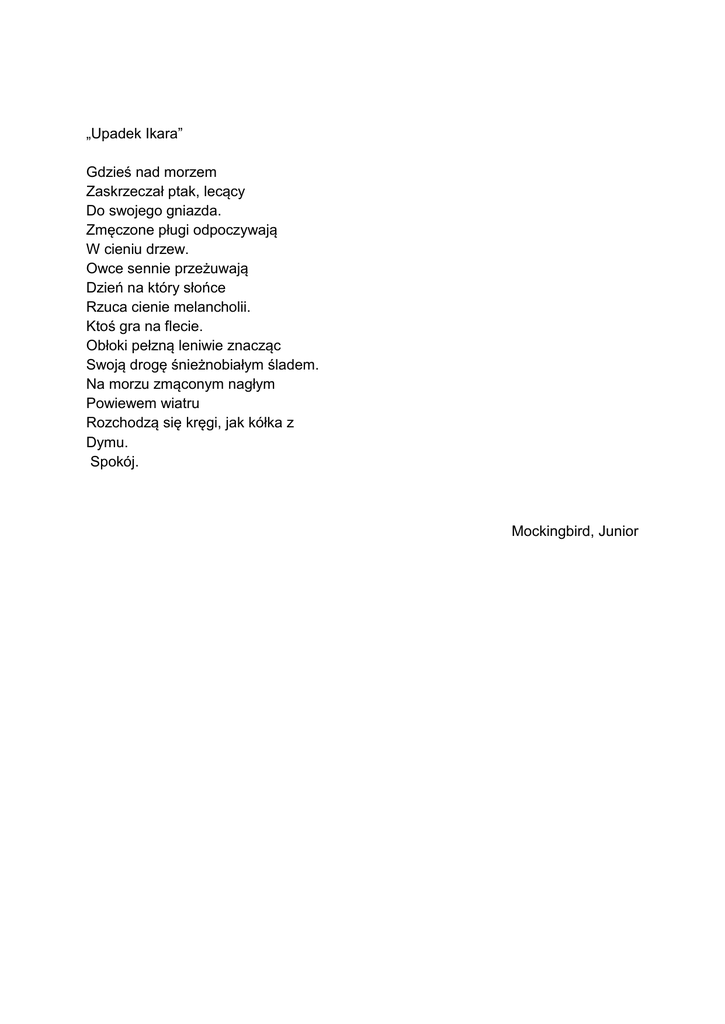 „Upadek Ikara” Gdzieś nad morzem Zaskrzeczał ptak, lecący Do swojego gniazda. Zmęczone pługi odpoczywają W cieniu drzew. Owce sennie przeżuwają Dzień na który słońce Rzuca cienie melancholii. Ktoś gra na flecie. Obłoki pełzną leniwie znacząc Swoją drogę śnieżnobiałym śladem. Na morzu zmąconym nagłym Powiewem wiatru Rozchodzą się kręgi, jak kółka z Dymu. Spokój. Mockingbird, Junior