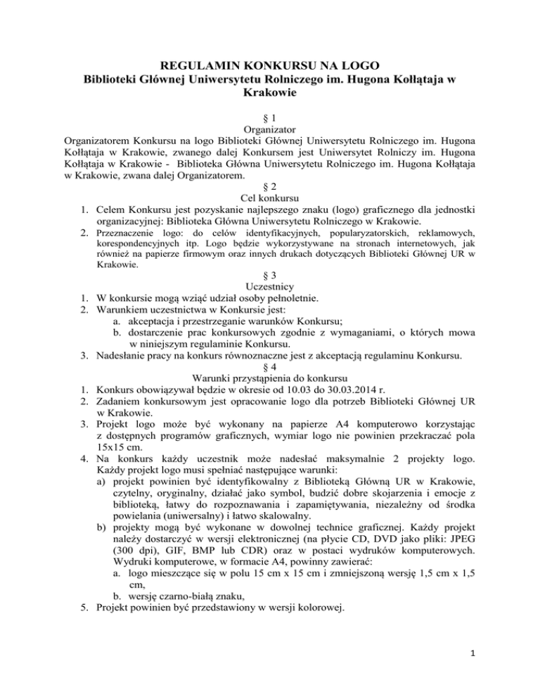 REGULAMIN KONKURSU NA LOGO Biblioteki Głównej Uniwersytetu Rolniczego im. Hugona Kołłątaja w Krakowie §1 Organizator Organizatorem Konkursu na logo Biblioteki Głównej Uniwersytetu Rolniczego im. Hugona Kołłątaja w Krakowie, zwanego dalej Konkursem jest Uniwersytet Rolniczy im. Hugona Kołłątaja w Krakowie - Biblioteka Główna Uniwersytetu Rolniczego im. Hugona Kołłątaja w Krakowie, zwana dalej Organizatorem. §2 Cel konkursu 1. Celem Konkursu jest pozyskanie najlepszego znaku (logo) graficznego dla jednostki organizacyjnej: Biblioteka Główna Uniwersytetu Rolniczego w Krakowie. 2. Przeznaczenie logo: do celów identyfikacyjnych, popularyzatorskich, reklamowych, korespondencyjnych itp. Logo będzie wykorzystywane na stronach internetowych, jak również na papierze firmowym oraz innych drukach dotyczących Biblioteki Głównej UR w Krakowie. 1. 2. 3. 1. 2. 3. 4. 5. §3 Uczestnicy W konkursie mogą wziąć udział osoby pełnoletnie. Warunkiem uczestnictwa w Konkursie jest: a. akceptacja i przestrzeganie warunków Konkursu; b. dostarczenie prac konkursowych zgodnie z wymaganiami, o których mowa w niniejszym regulaminie Konkursu. Nadesłanie pracy na konkurs równoznaczne jest z akceptacją regulaminu Konkursu. §4 Warunki przystąpienia do konkursu Konkurs obowiązywał będzie w okresie od 10.03 do 30.03.2014 r. Zadaniem konkursowym jest opracowanie logo dla potrzeb Biblioteki Głównej UR w Krakowie. Projekt logo może być wykonany na papierze A4 komputerowo korzystając z dostępnych programów graficznych, wymiar logo nie powinien przekraczać pola 15x15 cm. Na konkurs każdy uczestnik może nadesłać maksymalnie 2 projekty logo. Każdy projekt logo musi spełniać następujące warunki: a) projekt powinien być identyfikowalny z Biblioteką Główną UR w Krakowie, czytelny, oryginalny, działać jako symbol, budzić dobre skojarzenia i emocje z biblioteką, łatwy do rozpoznawania i zapamiętywania, niezależny od środka powielania (uniwersalny) i łatwo skalowalny. b) projekty mogą być wykonane w dowolnej technice graficznej. Każdy projekt należy dostarczyć w wersji elektronicznej (na płycie CD, DVD jako pliki: JPEG (300 dpi), GIF, BMP lub CDR) oraz w postaci wydruków komputerowych. Wydruki komputerowe, w formacie A4, powinny zawierać: a. logo mieszczące się w polu 15 cm x 15 cm i zmniejszoną wersję 1,5 cm x 1,5 cm, b. wersję czarno-białą znaku, Projekt powinien być przedstawiony w wersji kolorowej. 1 6. Logo powinno zawierać nazwę Biblioteka Główna Uniwersytetu Rolniczego im. Hugona Kołłątaja w Krakowie lub skrót tej nazwy. Dopuszczalne skróty: Biblioteka Główna UR w Krakowie. 7. Prace konkursowe powinny być wykonane samodzielnie przez uczestników Konkursu i powinny być wolne od wad prawnych oraz wcześniej nienagradzane w innych konkursach. Prace konkursowe mogą być pracą zbiorową. Prace konkursowe powinny być podpisane na odwrocie imieniem i nazwiskiem lub imionami i nazwiskami twórcy/twórców. 8. Prace konkursowe w zaklejonej kopercie należy złożyć osobiście lub przesłać za pośrednictwem poczty polskiej na adres Biblioteka Główna Uniwersytetu Rolniczego w Krakowie al. A. Mickiewicza 24/28 30 – 059 Kraków. Termin składania prac konkursowych upływa 30.03.2014 r. Na kopercie musi znaleźć się napis: „Konkurs na logo Biblioteki Głównej UR w Krakowie”. W kopercie należy umieścić także wypełnioną kartę zgłoszeniową. 9. Organizator nie zwraca nadesłanych prac konkursowych. 10. Niespełnienie przez uczestnika warunków formalnych lub technicznych określonych w tym paragrafie może spowodować odrzucenie pracy konkursowej przez Organizatora. §5 Rozstrzygnięcie konkursu 1. Nad prawidłowym przebiegiem Konkursu będzie czuwać Komisja Konkursowa, w której skład wchodzi 5 osób. 2. Organizator powołuje Komisję Konkursową, która dokonuje oceny prac oraz przyznaje nagrody i wyróżnienia. 3. Z każdego posiedzenia Komisji Konkursowej zostaje spisany protokół, który jest podpisywany przez wszystkich obecnych na posiedzeniu członków Komisji Konkursowej. Dokumentacja z posiedzenia Komisji Konkursowej przechowywana jest w siedzibie Organizatora. 4. Komisja Konkursowa podejmuje decyzje większością głosów. W przypadku równej liczby głosów decyduje głos Przewodniczącego. 5. Decyzje Komisji Konkursowej są ostateczne. §6 Nagrody 1. Laureaci otrzymają dyplomy a także podarunki pamiątkowe. 2. Przyznana zostanie 1 nagroda główna (oraz 2 wyróżnienia). Jeden uczestnik może otrzymać tylko nagrodę lub tylko wyróżnienie, niezależnie od ilości zgłoszonych projektów logo. 3. Laureat oraz osoby wyróżnione w konkursie otrzymają książki. §7 Ogłoszenie wyników i promocja laureatów 1. Ogłoszenie wyników Konkursu nastąpi w dniu 11.04.2014 r., a zwycięzca Konkursu zostanie powiadomiony drogą mailową i telefoniczną o rozstrzygnięciu Konkursu. 2. Organizatorzy Konkursu zastrzegają sobie możliwość podawania do publicznej wiadomości informacji o laureacie Konkursu. 3. Wyniki Konkursu a także wyróżnione prace zostaną zaprezentowane na stronie internetowej Biblioteki Głównej Uniwersytetu Rolniczego. §8 Prawa autorskie Każdy uczestnik konkursu zobowiązany jest do podpisania oświadczenia o przekazaniu praw autorskich na rzecz Organizatora, stanowiącego załącznik nr 1 do niniejszego Regulaminu. 2 1. 2. 1. 2. §9 Ochrona danych osobowych Uczestnicy Konkursu wyrażają zgodę na przetwarzanie ich danych osobowych zgodnie z ustawą z dnia 29 sierpnia 1997 r. o ochronie danych osobowych (tekst jednolity Dz. U. z 2002r., Nr 101, poz. 926, z późn. zm.) dla potrzeb Konkursu. Uczestnikom Konkursu przysługuje prawo wglądu do przekazanych danych osobowych oraz do ich poprawiania. § 10 Postanowienia końcowe Organizator zastrzega sobie prawo do zmiany treści niniejszego regulaminu Konkursu i przedłużenia terminu zgłaszania prac konkursowych do Konkursu oraz do ew