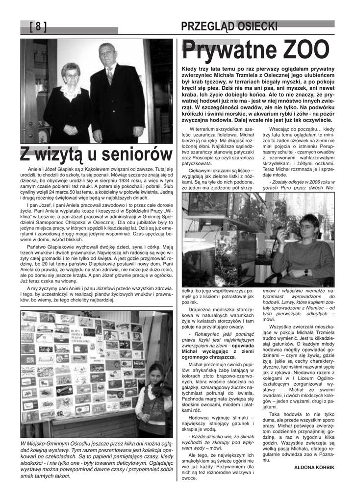 [8] PRZEGLĄD OSIECKI Prywatne ZOO Kiedy trzy lata temu po raz pierwszy oglądałam prywatny zwierzyniec Michała Trzmiela z Osiecznej jego ulubieńcem był krab tęczowy, w terrariach biegały myszki, a po pokoju kręcił się pies. Dziś nie ma ani psa, ani myszek, ani nawet kraba. Ich życie dobiegło końca. Ale to nie znaczy, że prywatnej hodowli już nie ma - jest w niej mnóstwo innych zwierząt. W szczególności owadów, ale nie tylko. Na podwórku króliczki i świnki morskie, w akwarium rybki i żółw - na pozór zwyczajna hodowla. Dalej wcale nie jest już tak oczywiście. Z wizytą u seniorów Aniela i Józef Glapiak są z Kąkolewem związani od zawsze. Tutaj się urodzili, tu chodzili do szkoły, tu się poznali. Mówiąc szczerze znają się od dziecka, bo obydwoje urodzili się w sierpniu 1934 roku, a więc w tym samym czasie pobierali też nauki. A potem się pokochali i pobrali. Ślub cywilny wzięli 24 marca 50 lat temu, a kościelny w połowie kwietnia. Jedną i drugą rocznicę świętować więc będą w najbliższych dniach. W terrarium skrzydełkami szeleści szarańcza fioletowa. Michał bierze ją na rękę. Ma długość rozłożonej dłoni. Najbliższe sąsiedztwo szarańczy stanowią patyczaki oraz Proscopia sp czyli szarańcza patyczkowata. Ciekawymi okazami są liśćce – wyglądają jak zielone listki z nóżkami. Są na tyle do nich podobne, że jeden ma zjedzone pół skrzy- Wracając do początku… kiedy trzy lata temu oglądałam to minizoo to żaden człowiek na ziemi nie miał pojęcia o istnieniu Peruphasmy schultei - czarnych owadów z czerwonymi wahlarzowatymi skrzydełkami i żółtymi oczkami. Teraz Michał rozmnaża je i sprzedaje młode. - Zostały odkryte w 2006 roku w górach Peru przez dwóch Nie- I pan Józef, i pani Aniela pracowali zawodowo i to przez całe dorosłe życie. Pani Aniela wyplatała kosze i koszyczki w Spółdzielni Pracy „Wiklina” w Lesznie, a pan Józef pracował w administracji w Gminnej Spółdzielni Samopomoc Chłopska w Osiecznej. Dla obu jubilatów były to jedyne miejsca pracy, w których spędzili kilkadziesiąt lat. Dziś są już emerytami i zawodową drogę mogą jedynie wspominać. Czas spędzają bowiem w domu, wśród bliskich. Państwo Glapiakowie wychowali dwójkę dzieci, syna i córkę. Mają trzech wnuków i dwóch prawnuków. Największą ich radością są więc wizyty całej gromadki i to nie tylko od święta. A jest gdzie przyjmować rodzinę, bo 20 lat temu państwo Glapiakowie postawili nowy dom. Pani Aniela co prawda, ze względu na stan zdrowia, nie może już dużo robić, ale po domu się jeszcze krząta. A pan Józef głównie pracuje w ogródku. Już teraz czeka na wiosnę. A my życzymy pani Anieli i panu Józefowi przede wszystkim zdrowia. I tego, by uczestniczyli w realizacji planów życiowych wnuków i prawnuków, bo wiemy, że tego chcieliby najbardziej. dełka, bo jego współtowarzysz pomylił go z liściem i potraktował jak posiłek. Drapieżna modliszka storczykowa w naturalnych warunkach żyje w kwiatach storczyków i tam poluje na przylatujące owady. - Rohatyniec jeśli pominąć prawa fizyki jest najsilniejszym zwierzęciem na ziemi – opowiada Michał wyciągając z ziemi ogromnego chrząszcza. Michał prezentuje swoich pupilów: afrykańską żabę latającą w kolorach złoto brązowo-czerwonych, która właśnie skoczyła na gałązkę, szmaragdowy żuczek natychmiast pofrunął do światła, Pachnoda marginata żywiąca się słodkimi owocami, miodem i płatkami róż. Hodowca wyjmuje ślimaki – największy istniejący gatunek i skrapia je wodą. W Miejsko-Gminnym Ośrodku jeszcze przez kilka dni można oglądać kolejną wystawę. Tym razem prezentowana jest kolekcja opakowań po czekoladach. Są to papierki pamiętające czasy, kiedy słodkości - i nie tylko one - były towarem deficytowym. Oglądając wystawę można powspominać dawne czasy i przypomnieć sobie smak tamtych łakoci. - Każde dziecko wie, że ślimak wychodzi ze skorupy pod wpływem wody – mówi. Ale tego, że największym ich smakołykiem są świeże ogórki nie wie już każdy. Pożywieniem dla nich są też różnorodne warzywa i owoce. mców i właściwie niemalże natychmiast wprowadzone do hodowli. Larwy, które kupiłem zostały sprowadzone z Niemiec – od tych pierwszych, odkrytych – mówi. Wszystkie zwierzaki mieszkające w pokoju Michała Trzmiela trudno wymienić. Jest tu kilkadziesiąt gatunków. O każdym młody hodowca mógłby opowiadać godzinami – czym się żywią, gdzie żyją, jakie są cechy charakterystyczne, łacińskimi nazwami sypie jak z rękawa. Niedawno razem z kolegami w I Liceum Ogólnokształcącym zorganizował wystawę – Michał ze swoimi owadami, i dwóch młodszych kolegów – jeden z wężami, drugi z pająkami. Taka hodowla to nie tylko duma, ale przede wszystkim sporo pracy. Michał poświęca zwierzętom codziennie przynajmniej godzinę, a raz w tygodniu kilka godzin. Wszystkie zwierzęta są wielką pasją Michała, dlatego regularnie odwiedza zoo w Poznaniu. ALDONA KORBIK