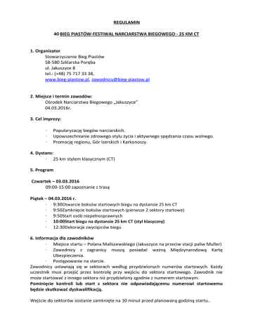 REGULAMIN 40 BIEG PIASTÓW-FESTIWAL NARCIARSTWA BIEGOWEGO - 25 KM CT 1. Organizator Stowarzyszenie Bieg Piastów 58-580 Szklarska Poręba ul. Jakuszyce 8 tel.: (+48) 75 717 33 38, www.bieg-piastow.pl, [email protected] 2. Miejsce i termin zawodów: Ośrodek Narciarstwa Biegowego „Jakuszyce” 04.03.2016r. 3. Cel imprezy: · · · Popularyzację biegów narciarskich. Upowszechnianie zdrowego stylu życia i aktywnego spędzania czasu wolnego. Promocję regionu, Gór Izerskich i Karkonoszy. 4. Dystans: · 25 km stylem klasycznym (CT) 5. Program Czwartek – 03.03.2016 09:00-15:00 zapoznanie z trasą Piątek – 04.03.2016 r. · 9:30Otwarcie boksów startowych biegu na dystansie 25 km CT · 9:50Zamknięcie boksów startowych (pierwsze 2 sektory startowe) · 9:50Start osób niepełnosprawnych · 10:00Start biegu na dystansie 25 km CT (styl klasyczny) · 12:30Dekoracje zwycięzców biegu 6. Informacja dla zawodników · Miejsce startu – Polana Maliszewskiego (Jakuszyce na przeciw stacji paliw Muller) · Zawodnicy z zagranicy muszą posiadać ważną Międzynarodową Kartę Ubezpieczenia. · Postępowanie na starcie. Zawodnicy ustawiają się w sektorach według przydzielonych numerów startowych. Każdy uczestnik musi przejść przez kontrolę przy wejściu do sektora startowego. Zawodnik nie może startować z innego sektora niż przydzielony zgodnie z numerem startowym. Pominięcie kontroli lub start z sektora nie odpowiadającemu numerowi startowemu będzie skutkować dyskwalifikacją. Wejście do sektorów zostanie zamknięte na 10 minut przed planowaną godziną startu. 1 Start dystansu 25 CT odbywać się będzie falowo w odstępach czasowych, w sektorach po 200 zawodników. Drugi sektor startuje w 2 minutowym odstępie czasowym, kolejne w 3 minutowych odstępach. I sektor (1-199) II sektor (200- 399) III sektor (400- 599) IV sektor (600-799) V sektor (800-999) VI sektor (1000- 1199) VII sektor (1200- 1399) VIII sektor (1400 – ) 10:00 10:02 10:05 10:08 10:11 10:14 10:17 10:20 Zawodnicy niepełnosprawni startują 10 minut przed pierwszym sektorem i mają liczony czas netto. Czas biegu wszystkich zawodników z sektora pierwszego będzie liczony od momentu przekroczenia linii pomiaru czasu przez pierwszego zawodnika (czas brutto). Zawodnicy z pozostałych sektorów mają liczony indywidualny czas biegu od momentu przekroczenia linii pomiaru czasu do mety (czas netto). · Przydzielanie numerów startowych: Numer startowy, a tym samym miejsce startowe zależy od wyniku: - uzyskanego w XXXIX edycji Biegu Piastów na dystansie 25 km CT - udokumentowanych wyników uzyskanych w sezonie 2014/2015 w innych biegach Worldloppet. Przy przydzielaniu numerów startowych Organizator może posiłkować się wynikami wskazanymi i udokumentowanymi przez zawodnika w karcie zgłoszeniowej: - uzyskanymi we wcześniejszych w edycjach Biegu Piastów na tym samym dystansie; - uzyskanymi we wcześniejszych edycjach Biegu Piastów na innym dystansie; W momencie kiedy zawodnik nie umieści informacji w karcie zgłoszeniowej, dotyczącej przydzielenia numeru startowego, będzie traktowany tak jakby był to jego pierwszy start. Nieoficjalna lista startowa zostanie opublikowana 18.02.2016 od tego momentu obowiązuje trzydniowy termin reklamacji, po tym terminie zażalenia nie będą uwzględniane. · Postępowanie na trasie zawodów: Zawodnicy muszą: - biec od startu do mety wzdłuż wyznaczonej trasy i przejść przez wszystkie punkty kontrolne, - nie utrudniać biegu i nie przeszkadzać innym zawodnikom, - nie utrudniać wyprzedzania zawodnikom szybszym. Zawodnicy słabsi powinni zajmować prawą stronę trasy, zawodnicy szybsi jej lewą stronę, - biec stylem klasycznym. Zmiana stylu w trakcie biegu będzie skutkowała dyskwalifikacją. Zawodnicy w czasie biegu nie mogą zmieniać nart, jeśli te nie są uszkodzone. Zmiana nart w trakcie zawodów będzie skutkowała dyskwalifikacją. Zmiana uszkodzonych nart powinna odbyć się w punkcie obsługi zawodów znajdującym się na trasie. Uszkodzoną nartę należy zostawić w ww. miejscu. Na trasach będą znajdowały się punkty kontrolne. Ich obsługa będzie spisywała numery startowe w celu weryfikacji dystansu przebytego przez zawodnika. Przebywanie na trasie zawodów bez ważnego numeru startowego jest niedozwolone. Osoby bez ważnego numeru startowego będą usuwane z trasy przez obsługę zawodów. · Oznakowanie trasy. 25 km styl klasyczny – kolor zielony · Punkty z napojami i punkty żywieniowe. - Orle - ok. 14 km (pkt 7) - Rozdroże pod Cichą Równią - ok. 21 km (pkt 22) · Limit czasowy. Na trasie 25 km stylem klasycznym obowiązuje bezwzględny limit czasowy ukończenia biegu – limit czasowy 14:30 – meta · Postępowanie w razie nieukończenia zawodów. Zawodnik, który nie może bądź nie chce ukończyć biegu powinien poinformować o tym obsługę zawodów wyposażoną w środki łączności znajdującą się na trasie i dalej postępować zgodnie z instrukcjami. · Szatnie. Każdy zawodnik może skorzystać z bezpłatnej szatni oraz depozytu. Worki będą do pobrania w szatniach. Oznakowany numerem worek można zostawić w depozycie. Zawodnik może w każdej chwili po zakończeniu biegu odebrać swoje rzeczy po okazaniu numeru startowego. Worki z rzeczami pozostawione na starcie zostaną przewiezione do depozytu, skąd można będzie odebrać je po biegu. Organizator nie ponosi odpowiedzialności za rzeczy pozostawione w depozycie. · Dekoracja. Dekoracja zwycięzców poszczególnych biegów odbędzie się zgodnie z harmonogramem zamieszczonym na stronie internetowej Organizatora - www.bieg-piastow.pl · Protesty. Protesty należy składać, wraz z wszystkimi dowodami w formie pisemnej, w języku polskim lub angielskim. Do pisemnego protestu należy załączyć kaucję w wysokości 300 złotych. W przypadku uznania protestu kaucja zostaje zwrócona. W przypadku odrzucenia protestu kaucja przechodzi na rzecz Organizatora. Czas na złożen