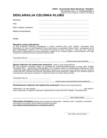 JUDO - Uczniowski Klub Sportowy “Dwójka” Tarnowskie Góry, ul. Wyspiańskiego 3 Regulamin klubu dostępny na stronie www.judotg.pl DEKLARACJA CZŁONKA KLUBU Nazwisko: …................................................................................................. Imię: …................................................................................................. Data i miejsce urodzenia: …................................................................................................. Miejsce zamieszkania: …................................................................................................. …................................................................................................. PESEL …................................................................................................. Wypełnia osoba pełnoletnia: Ja niżej podpisany deklaruję przystąpienie w poczet członków klubu UKS “Dwójka” Tarnowskie Góry. Stwierdzam, że znany mi jest Regulamin Klubu opracowany na podstawie Statutu Klubu i zobowiązuję się do jego przestrzegania. Zgadzam się na przechowywanie powyższych danych osobowych w sekcji judo tylko i wyłacznie dla jej potrzeb, jednocześnie mam prawo poprawiania i wglądu do nich. Wyrażam zgodę na wykorzystywanie moich zdjęć (związanych z działalnością klubu) na potrzeby reklamowe klubu. Tarnowskie Góry dn. ………………………………….. …..…....………………………………… czytelny podpis osoby pełnoletniej Zgoda rodziców lub opiekunów prawnych (dotyczy osób niepełnoletnich) My niżej podpisani wyrażamy zgodę na przynależność syna/córki/podopiecznego do klubu UKS “Dwójka” Tarnowskie Góry, jednocześnie zobowiązujemy się w jego/jej imieniu do przestrzegania Regulaminu Klubu i systematycznego opłacania składek członkowskich. Zgadzamy się na przechowywanie powyższych danych osobowych w sekcji judo tylko i wyłacznie dla jej potrzeb, jednocześnie mamy prawo poprawiania i wglądu do nich. Wyrażamy zgodę na wykorzystywanie zdjęć dziecka (związanych z działalnością klubu) na potrzeby reklamowe klubu. Tarnowskie Góry dn. ………………………………….. …..…....…………………………………........................ czytelny podpis osoby pełnoletniej (osób pełnoletnich) Oświadczenie rodziców lub opiekunów prawnych (dotyczy osób niepełnoletnich) Oświadczam, że moje dziecko …....................................................................................................... jest zdrowe i może uczestniczyć w zajęciach sporowych organizowanych przez Klub UKS “Dwójka” Tarnowskie Góry. …..…....………………………………… data, czytelny podpis Informacja od lekarza (dotyczy tylko ćwiczących rekreacyjnie - “Zabawa w judo”, startujący w zawodach zobowiązani są posiadać ważne badania lekarskie sportowe). Czy istnieją przewiwskazania do uprawiania sportu? …..…....………………………………… data, podpis i pieczęć lekarza