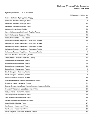 Klubowa Wystawa Psów Gończych Opole, 4.06.2016 Wykaz wystawców / List of exhibitors Nr katalogowy / Catalog No. Barakso Bertalan - Nyaregyhaza, Węgry 13 Bartkowiak Wiesław - Tarczyn, Polska 3 Bartkowiak Wiesław - Tarczyn, Polska 24 Bartkowiak Wiesław - Tarczyn, Polska 29 Bonkosch Anna - Opole, Polska 53 Branny Małgorzata Julia Warchoł- Rząska, Polska 54 Branny Małgorzata - Rząska, Polska 45 Brejtkopf Aleksander - Łódź, Polska 44 Budkowscy Tomasz, Magdalena - Warszawa, Polska 18 Budkowscy Tomasz, Magdalena - Warszawa, Polska 7 Budkowscy Tomasz, Magdalena - Warszawa, Polska 12 Budkowscy Tomasz, Magdalena - Warszawa, Polska 27 Budkowscy Tomasz, Magdalena - Warszawa, Polska 4 Bukowski Wiesław - Nowa Ruda, Polska 56 Frnco Ladislav - Kostelec Na Hane, Czechy 11 Giczela Irena - Grzegorzew, Polska 25 Giczela Irena - Grzegorzew, Polska 28 Giczela Irena - Grzegorzew, Polska 23 Giczela Irena - Grzegorzew, Polska 6 Gliński Grzegorz - Katowice, Polska 1 Gliński Grzegorz - Katowice, Polska 2 Glowacki Bohdan - Gąsocin, Polska 43 Gorgolewska Dorota - Ostrów Wielkopolski, Polska 40 Grygierzec Halina - Bestwina, Polska 52 Gwarda-Gruszczyńska Edyta Monika Markiton- Kopanka, Polska 49 Kowalczyk Waldemar - Jelcz Laskowice, Polska 35 Kradyna Paweł - Kamiennik, Polska 37 Kubik Małgorzata - Warszawa, Polska 50 Kubik Małgorzata - Warszawa, Polska 55 Kuszwara Małgorzata - Kotowice, Polska 57 Małek Witold - Mikołów, Polska 47 Marek Anna - Brąszewice, Polska 30 Marek Anna - Brąszewice, Polska 26 Nowak-Patyniak Agnieszka - Dębowa, Polska 36 Olanin Bożena - Wrocław, Polska 48 Roczniak Paulina - Modlniczka, Polska 38 Rowińska Roma Robert Rowiński- Kościan, Polska 39 Sapierzyńska-Kurek Katarzyna - Wołomin, Polska 16 Sapierzyńska-Kurek Katarzyna - Wołomin, Polska 15 Sarna Urszula - Wola Rasztowska, Polska 5 Smolska Kamila - Mierzyn, Polska 10 Smolska Kamila - Mierzyn, Polska 14 Szwałek Jakub - Mysłowice, Polska 8 Szwałek Jakub - Mysłowice, Polska 20 Szwałek Jakub - Mysłowice, Polska 21 Szwałek Jakub Magdalena Szwałek- Mysłowice, Polska 31 Szwałek Jakub Magdalena Szwałek- Mysłowice, Polska 32 Szwałek Jakub Joshua Grant- Mysłowice, Polska 19 Topolska Kinga - Koniusza, Polska 17 Topolska Kinga - Koniusza, Polska 22 Topolska Kinga - Koniusza, Polska 9 Wierzejska Magdalena Jan Maciej Paluchiewicz- Oława, Polska 41 Wierzejska Magdalena Jan Maciej Paluchiewicz- Oława, Polska 42 Wolny Maja - Rogów, Polska 51 Woźnicki Jan - Elbląg, Polska 46 Zawadzka Jolanta Monika Sedlackova- Imielin, Polska 33 Zawadzka Jolanta Monika Sedlackova- Imielin, Polska 34
