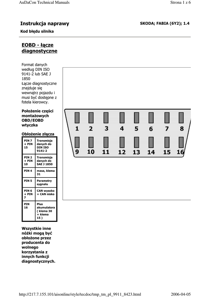 AuDaCon Technical Manuals Instrukcja naprawy Strona 1 z 6 SKODA; FABIA (6Y2); 1.4 Kod błędu silnika EOBD - łącze diagnostyczne Format danych według DIN ISO 9141-2 lub SAE J 1850 Łącze diagnostyczne znajduje się wewnątrz pojazdu i musi być dostępne z fotela kierowcy. PołoŜenie części montaŜowych OBD/EOBD wtyczka ObłoŜenie złącza PIN 7 + PIN 15 Transmisja danych do DIN ISO 9141-2 PIN 2 + PIN 10 Transmisja danych do SAE J 1850 PIN 4 masa, klema 31 PIN 5 Parametry sygnału PIN 6 + PIN 7 CAN wysoko + CAN nisko PIN 16 Plus akumulatora ( klema 30 + klema 15 ) Wszystkie inne nóŜki mogą być obłoŜone przez producenta do wolnego korzystania z innych funkcji diagnostycznych. http://217.7.155.101/aisonline/style/tecdoc/tmp_tm_pl_9911_8423.html 2006-04-05 AuDaCon Technical Manuals Strona 2 z 6 Znaczenie kodów usterek. (po ISO 15031-6) Przykład kod usterki: P0303 1. miejsce P Kabel prowadzenia B Karoseria C Podwozie U System szyny Bus 2. miejsce Grupa kodów usterek 0/2 NiezaleŜnie od producenta. 1/3 Specyficznie w zaleŜności od producenta 3. miejsce Grupy budowy 0 Cały układ 1 Powietrze wtórne/przygotowanie mieszanki 2 System paliwowy 3 Instalacja zapłonowa/Przerwa w zapłonie 4 Dodatkowe systemy do kontroli emisji 5 Regulacja prędkości/liczby obrotów biegu jałowego 6 Sygnały wejścia/wyjścia komputera 7 Skrzynia biegów 8 Skrzynia biegów 9 Sygnały wejścia/wyjścia komputera 4.+5. Miejsce Wzrastająca numeracja części Wskazówka(i) : Przegląd kodów błędów uporządkowany jest zgodnie z kodem SAE wzgl. V.A.G.. W przypadku, gdy podzespoły podawane są jako wadliwe: - Odczytać listę zmierzonych wyników uŜywając odpowiednią diagnostyczną jednostkę - Sprawdzić przewody elektryczne i elektryczne złącza wtykowe do tych podzespołów. - Po usunięciu błędu naleŜy zresetować pamięć błędów. Stopka Objaśnienie (1) Błędy elektrycznego pedału gazu komunikowane są dodatkowo przez lampkę usterki (EPC - lampkę kontrolną w module tablicy instrumentów. (2) Dodatkowo do wyłącznika światła hamulcowego F pedału hamulca jest nadzorowany przez F47. (3) add. = oznacza, Ŝe błąd działa tylko na wolnych obrotach. (4) Błąd – poziom paliwa nie jest z reguły sporadyczny, poniewaŜ zawsze jest dodatkowo lokalizowany kolejny błąd, taki jak regulacja sondy lambda i/lub przerywacz zapłonu. http://217.7.155.101/aisonline/style/tecdoc/tmp_tm_pl_9911_8423.html 2006-04-05 AuDaCon Technical Manuals Strona 3 z 6 (5) Kod 1 W przypadku próby uruchomienia niedopasowanym kluczykiem zapisywany jest błąd statystyczny. W przypadku kolejnego uruchomienia dopasowanym kluczykiem błąd przekształcany jest w błąd sporadyczny. Opis Rozwiązanie P0101 VAG16485 Licznik masy powietrza G70 Sygnał niemoŜliwy Sprawdzić miernik ilości powietrza/mas powietrza , Sprawdzić bezpiecznik(i). , Zlokalizować błąd zgodnie ze schematem połączeń. , Sprawdzić system zasysający pod względem nieszczelności. P0102 VAG16486 Licznik masy powietrza G70 - Za mały sygnał Sprawdzić miernik ilości powietrza/mas powietrza , Sprawdzić bezpiecznik(i). , Zlokalizować błąd zgodnie ze schematem połączeń. , Sprawdzić system zasysający pod względem nieszczelności. P0103 VAG16487 Licznik masy powietrza G70 Sygnał zbyt wysoki. Sprawdzić miernik ilości powietrza/mas powietrza , Sprawdzić bezpiecznik(i). , Zlokalizować błąd zgodnie ze schematem połączeń. , Sprawdzić system zasysający pod względem nieszczelności. P0106 VAG16490 Czujnik ciśnienia pompy pobierającej powietrze G71 Sygnał niemoŜliwy Sprawdzić czujnik. P0107 VAG16491 Czujnik ciśnienia pompy pobierającej powietrze G71 - Za mały sygnał Sprawdzić czujnik. P0108 VAG16492 Czujnik ciśnienia pompy pobierającej powietrze G71 Sygnał zbyt wysoki. Sprawdzić czujnik. P0112 VAG16496 Czujnik temperatury pobieranej G42 - Za mały sygnał Sprawdzić czujnik. P0113 VAG16497 Czujnik temperatury pobieranej G42 - Sygnał zbyt wysoki. Sprawdzić czujnik. Opis Rozwiązanie P0116 VAG16501 Czujnik temperatury pobieranej G62 - Sygnał niemoŜliwy Sprawdzić czujnik. P0117 VAG16502 Czujnik temperatury cieczy chłodzącej G62 - Sygnał zbyt wysoki. Sprawdzić czujnik. Czujnik temperatury cieczy Sprawdzić czujnik. Kod 1 Kod 2 Kod 2 Kod 3 Kod 3 http://217.7.155.101/aisonline/style/tecdoc/tmp_tm_pl_9911_8423.html 2006-04-05 AuDaCon Technical Manuals Strona 4 z 6 P0118 VAG16503 chłodzącej G62 - Za mały sygnał P0130 VAG16514 Bank 1 , sonda lambda 1 - Błąd elektryczny w obwodzie prądowym. Sprawdzić regulację sondą lambda przed katalizatorem. , Sprawdzić ogrzewanie sondy lambda przed katalizatorem. , Sprawdzić sondę lambda 1 przed katalizatorem. P0131 VAG16515 Bank 1 , sonda lambda 1 - Za niskie napięcie Sprawdzić regulację sondą lambda przed katalizatorem. , Sprawdzić ogrzewanie sondy lambda przed katalizatorem. , Sprawdzić sondę lambda 1 przed katalizatorem. P0132 VAG16516 Bank 1 , sonda lambda 1 - Za wysokie napięcie. Sprawdzić regulację sondą lambda przed katalizatorem. , Sprawdzić ogrzewanie sondy lambda przed katalizatorem. , Sprawdzić sondę lambda 1 przed katalizatorem. P0133 VAG16517 Bank 1 , sonda lambda 1 - Sygnał zbyt wolny. Sprawdzić regulację sondą lambda przed katalizatorem. , Sprawdzić ogrzewanie sondy lambda przed katalizatorem. , Sprawdzić sondę lambda 1 przed katalizatorem. P0134 VAG16518 Bank 1 , sonda lambda 1 - Bez funkcji Sprawdzić regulację sondą lambda przed katalizatorem. , Sprawdzić ogrzewanie sondy lambda przed katalizatorem. , Sprawdzić sondę lambda 1 przed katalizatorem. Opis Rozwiązanie P0135 VAG16519 Bank 1 , sonda lambda 1 - Błąd elektryczny obwodu ogrzewania Sprawdzić regulację sondą lambda przed katalizatorem. , Sprawdzić ogrzewanie sondy lambda przed katalizatorem. , Sprawdzić sondę lambda 1 przed katalizatorem. P0136 VAG16520 Bank 1 , sonda lambda 2 - Błąd elektryczny w obwodzie prądowym. Sprawdzić regulację sondą la