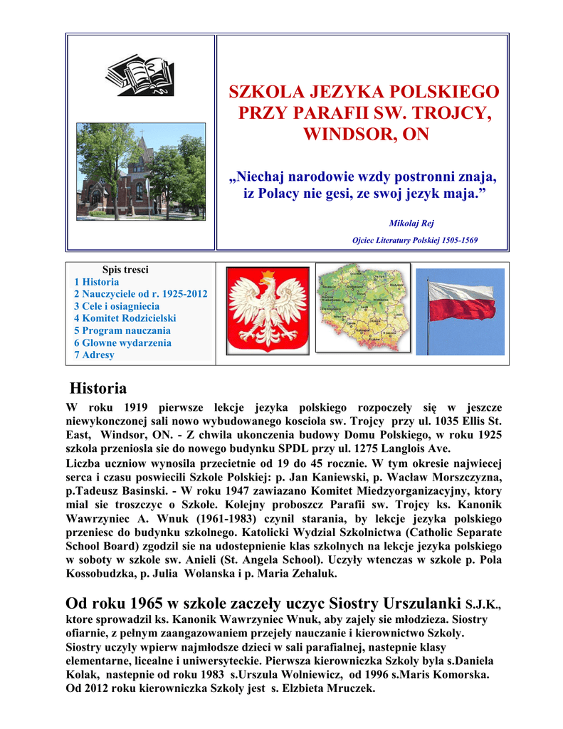 SZKOLA JEZYKA POLSKIEGO ..PRZY PARAFII SW. TROJCY, WINDSOR, ON „Niechaj narodowie wzdy postronni znaja, iz Polacy nie gesi, ze swoj jezyk maja.” Mikolaj Rej Ojciec Literatury Polskiej 1505-1569 Spis tresci 1 Historia 2 Nauczyciele od r. 1925-2012 3 Cele i osiagniecia 4 Komitet Rodzicielski 5 Program nauczania 6 Glowne wydarzenia 7 Adresy Historia W roku 1919 pierwsze lekcje jezyka polskiego rozpoczeły się w jeszcze niewykonczonej sali nowo wybudowanego kosciola sw. Trojcy przy ul. 1035 Ellis St. East, Windsor, ON. - Z chwila ukonczenia budowy Domu Polskiego, w roku 1925 szkola przeniosla sie do nowego budynku SPDL przy ul. 1275 Langlois Ave. Liczba uczniow wynosila przecietnie od 19 do 45 rocznie. W tym okresie najwiecej serca i czasu poswiecili Szkole Polskiej: p. Jan Kaniewski, p. Wacław Morszczyzna, p.Tadeusz Basinski. - W roku 1947 zawiazano Komitet Miedzyorganizacyjny, ktory mial sie troszczyc o Szkołe. Kolejny proboszcz Parafii sw. Trojcy ks. Kanonik Wawrzyniec A. Wnuk (1961-1983) czynil starania, by lekcje jezyka polskiego przeniesc do budynku szkolnego. Katolicki Wydzial Szkolnictwa (Catholic Separate School Board) zgodzil sie na udostepnienie klas szkolnych na lekcje jezyka polskiego w soboty w szkole sw. Anieli (St. Angela School). Uczyły wtenczas w szkole p. Pola Kossobudzka, p. Julia Wolanska i p. Maria Zehaluk. Od roku 1965 w szkole zaczeły uczyc Siostry Urszulanki S.J.K., ktore sprowadzil ks. Kanonik Wawrzyniec Wnuk, aby zajely sie młodzieza. Siostry ofiarnie, z pełnym zaangazowaniem przejeły nauczanie i kierownictwo Szkoly. Siostry uczyly wpierw najmłodsze dzieci w sali parafialnej, nastepnie klasy elementarne, licealne i uniwersyteckie. Pierwsza kierowniczka Szkoly byla s.Daniela Kolak, nastepnie od roku 1983 s.Urszula Wolniewicz, od 1996 s.Maris Komorska. Od 2012 roku kierowniczka Szkoly jest s. Elzbieta Mruczek. Nauczyciele w Szkole Jezyka Polskiego od 1925 do 2011 roku. 1. 2. 3. 4. 5. 6. 7. 8. 9. 10. 11. 12. 13. 14. 15. 16. 17. 18. 19. 20. 21. 22. 23. 24. 25. 26. 27. Basinski Tadeusz Bartoszewicz Wieslawa Bochus Wieslawa Borawska Anna S. Budniak Magdalena Chadała S. Chemel Anna Cichon J. Ciepielowska Czajkowski Andrzej Dabrowska Dziwer J. S. Gasiorowska Maria S. Gorska Malgorzata S. Grochowska Teresa Jung J. Kamienski J. Kaniewski Jan Kijak Elzbieta Klimska Marta S. Kolak Daniela Koleczko Elzbieta S. Komorska Maris Konior Maciej Kossobudzka Apolonia Kowal Lidia Kowalewski 28. 29. 30. 31. 32. 33. 34. 35. 36. 37. 38. 39. 40. 41. 42. 43. 44. 45. 46. 47. 48. 49. 50. 51. 52. 53. 54. Leszczynska B. Lewandowski S. Majtczak Z. Markiewicz Stefania Michalak Anna Minkiewicz Hanna Morszczyzna Waclaw S. Mruczek Elzbieta Nari Mariola Pajdowska Helena Pietraszko Rajs W. S. Ryniec Pawla Rudyk Elzbieta S. Sroka Teresa Szewczyk W. Tuna J. S. Unikowska Malgorzata Urbanek Aleksandra Wadas Barbara Wichlacz Jolanta Witwicka Wolanska Julia S. Wolniewicz Urszula Zielinska Janina Zehaluk Maria Zlobicka Jadwiga Głowne cele i osiagniecia: Szkola rozbudza wsrod mlodziezy milosci szacunek do „wlasnych korzeni”, tradycji i kultury polskiej. Utrzymuje kontakty z Polska przez pogłebiona znajomosc jezyka, tradycji i kultury polskiej , korespondencje z rodzina, wyjazdy wakacyjne do Polski. Poprzez nauke jezyka polskiego, znajomosc historii, tradycji i geografii Polski, uczniowie zdobywaja wiedze o Polsce, umilowanie wszystkiego co polskie, doskonala umiejetnosc porozumiewania sie jezykiem Ojcow. Nawiazuja znajomosci z rowiesnikami swego pochodzenia. Bedac swiatlymi obywatelami Kanady maja mozliwosci zajmowania odpowiedzialnych stanowisk. Ilosc uczniow jest zmienna – zalezna od nasilenia emigracji polskiej. W roku szk. 1998 - 1999 mielismy 365 uczniow. Od roku szkolnego 2009 - 2010 mamy 11 klas: od I – VIII, oraz klasy X, XI i XII z ‘Kredytem’ tj. z zaliczeniem Kursu Jezyka Polskiego w szkolach kanadyjskich. 2006 – Grono Pedagogiczne z Ks. Romanem Waszkiewiczem, opiekunem Szkoly. Przed szkola Sw. Anieli - 2007 r. - Zakonczenie Roku Szkolnego Graduacja Klasy XII - 2008 * Klasa XII - Rok, 2009 Kazdorazowy Proboszcz Parafii jest duchowym opiekunem Szkoly. Kolejnymi opiekunami Szkoly byli: Ks. Wawrzyniec Wnuk (1961-1983), Ks. Piotr Sanczenko (1983-2003), Ks. Roman Waszkiewicz (2003-2009). Od roku 2009 duchowym opiekunem Szkoły jest Ks. Zbigniew Sawicki. Lekcje religii W ramach lekcji jezyka polskiego w kazdej klasie odbywaja sie 15 min. lekcje religii zgodnie z programem dla kazdej grupy wiekowej. Dzieci przygotowywane sa przez Ksiedza Katechete i Siostry Zakonne do przyjecia Sakramentow: w IIgiej klasie do Sakramentu I Komunii Swietej i w VIII- ej klasie do Sakramentu Bierzmowania. Rekolekcje W okresie Wielkiego Postu, przed swietami Wielkanocy, Szkola urzadza w ramach zajec lekcyjnych dla wszystkich dzieci rekolekcje, aby przyblizyc im Zbawiciela – Dawce wszelkiego dobra. Komitet Rodzicielski Przy szkole istnieje tez, ktory scisle wspolpracuje z Kierownictwem Szkoly. Od roku 1968 Przewodniczącymi byli: Wawrzyniec Pernal, E. Kuffel, Witold Polewski, Wiktor Bas, Maria Lachowicz, Marek Zaremba, Ryszard Kusmierczyk, Teresa Wolfson, Antoni Kulinski, Teresa Baran, Roza Rzazewska, Ewa Barycka, Elzbieta Kulinska, Elzbieta Rudyk, Justyna Jaglarz i Magda Zielinska. Szkola jest finansowana przez Katolicki Wydzial Szkolnictwa oraz przez Organizacje Polonijne, ktore z duma i radoscia popieraja finansowo Szkole Polska, rozumiejac, ze od postawy naszej mlodziezy zalezy Jutro Polonii Kanadyjskiej. Pieniadze z oplat na Komitet Rodzicielski i z donacji Polskich Organizacji sa przeznaczane na zakup pomocy naukowych, materiałow biurowych, reperacje sprzetu, oplate czesci nauczycieli, nagrody dla dzieci. Program nauczania: Kierujemy sie programem nauczania opracowanym dla szkol polonijnych przez Zwiazek Nauczycielstwa Polskiego w Kanadzie (ZNPwK www.znp.ca). Korzystamy z podrecznikow wydanych w Kanadzie, w Anglii i czesciowo z podrecznikow wydanych w Polsce. Mamy tez opracowania wlasne. Sta