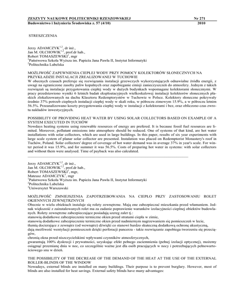 ZESZYTY NAUKOWE POLITECHNIKI RZESZOWSKIEJ Budownictwo i InŜynieria Środowiska z. 57 (4/10) Nr 271 2010 STRESZCZENIA Jerzy ADAMCZYK1,2, dr inŜ., Jan M. OLCHOWIK1,2, prof.dr hab., Robert TOMASZEWSKI1, mgr 1 Państwowa Szkoła WyŜsza im. PapieŜa Jana Pawła II, Instytut Informatyki 2 Politechnika Lubelska MOśLIWOŚĆ ZAPEWNIENIA CIEPŁEJ WODY PRZY POMOCY KOLEKTORÓW SŁONECZNYCH NA PRZYKŁADZIE INSTALACJI ZREALIZOWANEJ W TUCHOWIE W obecnych czasach preferuje się rozwiązania instalacji grzewczych wykorzystujących odnawialne źródła energii, z uwagi na ograniczone zasoby paliw kopalnych oraz zapobieganie emisji zanieczyszczeń do atmosfery. Jednym z takich rozwiązań są instalacje przygotowania ciepłej wody w duŜych budynkach wspomagane kolektorami słonecznymi. W pracy przedstawiono wyniki 6 letnich badań eksploatacyjnych wielkoskalowej instalacji kolektorów słonecznych płaskich zlokalizowanych na dachu Klasztoru Redemptorystów w Tuchowie w Polsce. Kolektory słoneczne pokrywały średnio 37% potrzeb cieplnych instalacji ciepłej wody w skali roku, w półroczu zimowym 15.9%, a w półroczu letnim 56.5%. Przeanalizowano koszty przygotowania ciepłej wody w instalacji z kolektorami i bez, oraz obliczono czas zwrotu nakładów inwestycyjnych. POSSIBILITY OF PROVIDING HEAT WATER BY USING SOLAR COLLECTORS BASED ON EXAMPLE OF A SYSTEM EXECUTED IN TUCHÓW Nowdays heating systems using renewable resources of energy are prefered. It is because fossil fuel resources are limited. Moreover, pollutant emissions into atmosphere should be reduced. One of systems of that kind, are hot water installations with solar collectors, which are used in large buildings. In this paper, results of six year experiments with large scale system of planar solar collector are presented. Instalation was placed on Redemptorist Monastery's roof in Tuchów, Poland. Solar collectors' degree of coverage of hot water demand was in average 37% in year's scale. For winter period it was 15.9%, and for summer it was 56.5%. Costs of preparing hot water in systems: with solar collectors and without them were analysed. Time of payback was also calculated. __________________________________________________________________________________ Jerzy ADAMCZYK1,2, dr inŜ., Jan M. OLCHOWIK1,2, prof.dr hab., Robert TOMASZEWSKI1, mgr, Mateusz ADAMCZYK3, mgr 1 Państwowa Szkoła WyŜsza im. PapieŜa Jana Pawła II, Instytut Informatyki 2 Politechnika Lubelska 3 Uniwersytet Warszawski MOśLIWOŚĆ ZMNIEJSZENIA ZAPOTRZEBOWANIA NA CIEPŁO PRZY ZASTOSOWANIU ROLET OKIENNYCH ZEWNĘTRZNYCH Obecnie w wielu obiektach instaluje się rolety zewnętrzne. Mają one zabezpieczać mieszkania przed włamaniem. Jednak większość z zainstalowanych rolet ma za zadanie poprawienie warunków izolacyjności cieplnej obiektów budowlanych. Rolety zewnętrzne zabezpieczające posiadają szereg zalet tj.: stanowią dodatkowe zabezpieczenie termiczne okien przed stratami ciepła w zimie, stanowią dodatkowe zabezpieczenie termiczne okien przed nadmiernym nagrzewaniem się pomieszczeń w lecie, tłumią docierające z zewnątrz (od wewnątrz) dźwięki co stanowi bardzo skuteczną dodatkową ochronę akustyczną, dają moŜliwość wentylacji pomieszczeń dzięki perforacji pancerza - takie rozwiązanie zapobiega tworzeniu się przeciągów, chronią okna przed niszczycielskimi wpływami czynników atmosferycznych, gwarantują 100% dyskrecji i prywatności, uzyskując efekt pełnego zaciemnienia (pełnej izolacji optycznej), moŜemy osiągnąć przemianę dnia w noc, co szczególnie waŜne jest dla osób pracujących w nocy i potrzebujących pełnowartościowego snu w dzień. THE POSSIBILITY OF THE DECREASE OF THE DEMAND OF THE HEAT AT THE USE OF THE EXTERNAL ROLLER-BLINDS OF THE WINDOW Nowadays, external blinds are installed on many buildings. Their purpose is to prevent burglary. However, most of blinds are also installed for heat savings. External safety blinds have many advantages: 2 they provide additional heat savings for windows during winter, they are additional prevention for windows from excessive rooms' heating in the summer, they provide additional acoustic protection from outside and from inside, they provide possibility of rooms' ventilation by armours perforation, which prevents from formation of draughts, they protect windows from being affected by destructive, they guaranteed 100% discretion and private, getting effect of full darkening (full optical isolation), one can achieve day to night transformation, which is especially important for people working in night and demanding proper sleep at day. __________________________________________________________________________________ Anita BEDNARSKA, mgr inŜ. Andrzej STĘPIEŃ, dr inŜ. Instytut Technologii Eksploatacji - Państwowy Instytut Badawczy, Zakład Technologii Proekologicznych BIOPALIWA EMULSYJNE DO ZASILANIA ŹRÓDEŁ CIEPŁA MAŁEJ I ŚREDNIEJ MOCY W artykule przedstawiono wybrane wyniki badań właściwości fizykochemicznych opracowanych kompozycji biopaliw emulsyjnych na bazie oleju roślinnego. Zaobserwowano wysoki poziom lepkości emulsji przy zawartości wody od ok. 1 do ok. 5%, co moŜe komplikować procesy spalania w typowych urządzeniach grzewczych. EMULSION BIOFUELS FOR SMALL AND MEDIUM SIZE HEAT SOURCES The paper discusses selected results from physical/chemical analysis of developed vegetable oil based emulsion biofuels. A high viscosity level of emulsions containing approximately 1 to 5% of water was observed, which may complicate combustion processes in typical heating sources. __________________________________________________________________________________ Wojciech BIALIK, dr inŜ. Stanisław GIL, dr inŜ. Piotr MOCEK, dr inŜ. Politechnika Śląska, Zespół Energetyki Procesowej Katedry Metalurgii OPTYMALIZACJA NUMERYCZNA KONSTRUKCJI AKUMULATORA ENERGII CIEPLNEJ DO WSPÓŁPRACY Z KOLEKTOREM SŁONECZNYM Efektywność wykorzystania energii odnawialnej jest za