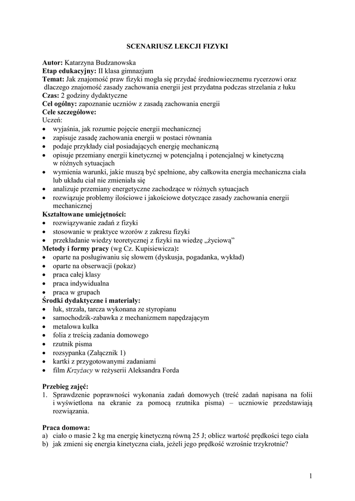 SCENARIUSZ LEKCJI FIZYKI Autor: Katarzyna Budzanowska Etap edukacyjny: II klasa gimnazjum Temat: Jak znajomość praw fizyki mogła się przydać średniowiecznemu rycerzowi oraz dlaczego znajomość zasady zachowania energii jest przydatna podczas strzelania z łuku Czas: 2 godziny dydaktyczne Cel ogólny: zapoznanie uczniów z zasadą zachowania energii Cele szczegółowe: Uczeń: wyjaśnia, jak rozumie pojęcie energii mechanicznej zapisuje zasadę zachowania energii w postaci równania podaje przykłady ciał posiadających energię mechaniczną opisuje przemiany energii kinetycznej w potencjalną i potencjalnej w kinetyczną w różnych sytuacjach wymienia warunki, jakie muszą być spełnione, aby całkowita energia mechaniczna ciała lub układu ciał nie zmieniała się analizuje przemiany energetyczne zachodzące w różnych sytuacjach rozwiązuje problemy ilościowe i jakościowe dotyczące zasady zachowania energii mechanicznej Kształtowane umiejętności: rozwiązywanie zadań z fizyki stosowanie w praktyce wzorów z zakresu fizyki przekładanie wiedzy teoretycznej z fizyki na wiedzę „życiową” Metody i formy pracy (wg Cz. Kupisiewicza): oparte na posługiwaniu się słowem (dyskusja, pogadanka, wykład) oparte na obserwacji (pokaz) praca całej klasy praca indywidualna praca w grupach Środki dydaktyczne i materiały: łuk, strzała, tarcza wykonana ze styropianu samochodzik-zabawka z mechanizmem napędzającym metalowa kulka folia z treścią zadania domowego rzutnik pisma rozsypanka (Załącznik 1) kartki z przygotowanymi zadaniami film Krzyżacy w reżyserii Aleksandra Forda Przebieg zajęć: 1. Sprawdzenie poprawności wykonania zadań domowych (treść zadań napisana na folii i wyświetlona na ekranie za pomocą rzutnika pisma) – uczniowie przedstawiają rozwiązania. Praca domowa: a) ciało o masie 2 kg ma energię kinetyczną równą 25 J; oblicz wartość prędkości tego ciała b) jak zmieni się energia kinetyczna ciała, jeżeli jego prędkość wzrośnie trzykrotnie? 1 c) oblicz, o ile wzrośnie energia potencjalna chłopca o masie 70 kg, który wszedł na szczyt wieży Eiffla; przyjmij, że wysokość wieży wynosi 300 m. 2. Oglądanie fragmentu filmu Krzyżacy w reżyserii Aleksandra Forda, opartego na powieści Henryka Sienkiewicza pod tym samym tytułem, przedstawiającego przekazanie mieczy przez posłańców krzyżackich królowi Jagielle. 3. Przypomnienie wiadomości o energii kinetycznej, energii potencjalnej i pracy mechanicznej z uwzględnieniem odpowiedzi na pytania: a) jaki rodzaj energii mechanicznej został zaprezentowany w przedstawionym fragmencie filmu Krzyżacy? (jaki rodzaj energii mają miecze podczas przekazywania ich przez posłów krzyżackich królowi Jagielle?) b) kiedy miecz ma energię kinetyczną? c) kiedy miecz ma energię potencjalną? d) kiedy miecz ma energię potencjalną sprężystości? e) co to jest praca mechaniczna? f) w jakich jednostkach wyrażamy energię i pracę? Odpowiadając na pytania drugie, trzecie i czwarte w kolejności, uczniowie podają przykłady innych ciał mających te rodzaje energii. 4. Przedstawienie tematyki zajęć; nauczyciel pyta uczniów, czy strzelali kiedyś z łuku oraz czy uważają, że znajomość praw fizyki mogła się przydać średniowiecznemu rycerzowi, a jeśli tak – to do czego. Pyta też, jak uczniowie rozumieją temat i informuje, że zajęcia będą dotyczyły zasady zachowania energii oraz pomogą ustalić odpowiedź na drugie pytań zawarte w temacie. 5. Przypomnienie fragmentu powieści Henryka Sienkiewicza Krzyżacy w celu wyróżnienia rodzajów broni używanej w bitwie pod Grunwaldem; czyta nauczyciel lub wybrany uczeń. Henryk Sienkiewicz Krzyżacy (fragment) „Lecz Litwa ugięła się pod straszliwą nawałą Niemców. (…) I jakże mogło być inaczej, gdyż z jednej strony walczyło rycerstwo całkiem zakute w stalowe zbroje i na koniach stalą osłonione, z drugiej lud, rosły wprawdzie i silny, ale na drobnych konikach i skórami jeno okryty?... Próżno też szukał uporny Litwin, jak do skóry niemieckiej się dobrać. Sulice, szable, ostrza oszczepów, pałki nasadzone krzemieniem lub gwoździami odbijały się tak o żelazne blachy jak o skałę lub jak o mury zamkowe. Ciężar ludzi i koni gniótł nieszczęsne Witoldowe zastępy, cięły ich miecze i topory, bodły i kruszyły kości berdysze, tratowały kopyta końskie”. Po wysłuchaniu fragmentu powieści uczniowie nazywają rodzaje broni rycerskiej (nie tylko wymienione przez autora Krzyżaków). W razie potrzeby nauczyciel przypomina, że po obu stronach walczyli także kusznicy i łucznicy. Świadczą o tym zabytki znalezione przez archeologów na polu bitwy. 6. Pogadanka na temat różnych rodzajów energii i przemian energii występujących w przyrodzie a) Nauczyciel przypomina, że wokół nas, w przyrodzie, bezustannie coś się dzieje: jeżdżą samochody, latają samoloty, w naszych żyłach płynie krew, pada deszcz i śnieg, świeci 2 słońce. Wszystkie te zjawiska (oraz wiele innych) zachodzą dzięki przemianom energii. Energia jest źródłem aktywności. Jest dużo rodzajów energii. b) Pogadanka. Uczniowie szukają odpowiedzi na pytanie: jakie znasz rodzaje energii? Następnie w dwuosobowych zespołach układają rozsypankę (Załącznik 1). c) Sprawdzenie poprawności ułożenia rozsypanki i ustalenie odpowiedzi na pytanie: które z rodzajów energii wymienionych w rozsypance są rodzajami energii mechanicznej? 7. Zademonstrowanie przykładów ciał mających energię mechaniczną powstającą po przekształceniu jednego rodzaju energii w inny rodzaj energii. Nauczyciel wykonuje eksperyment pokazowy, a uczniowie obserwują zachowanie się ciała i udzielają odpowiedzi na pytania. Eksperyment – nauczyciel zakłada strzałę na łuk, delikatnie napina cięciwę i wypuszcza strzałę, która wbija się w tarczę Pytania: skąd strzała uzyskała energię? jaką energię ma łuk wpr