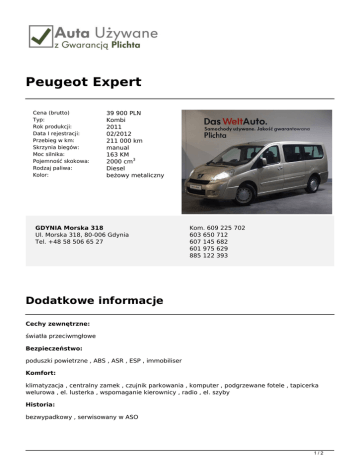 Peugeot Expert Cena (brutto) Typ: Rok produkcji: Data I rejestracji: Przebieg w km: Skrzynia biegów: Moc silnika: Pojemność skokowa: Rodzaj paliwa: Kolor: 39 900 PLN Kombi 2011 02/2012 211 000 km manual 163 KM 2000 cm3 Diesel beżowy metaliczny GDYNIA Morska 318 Ul. Morska 318, 80-006 Gdynia Tel. +48 58 506 65 27 Kom. 609 225 702 603 650 712 607 145 682 601 975 629 885 122 393 Dodatkowe informacje Cechy zewnętrzne: światła przeciwmgłowe Bezpieczeństwo: poduszki powietrzne , ABS , ASR , ESP , immobiliser Komfort: klimatyzacja , centralny zamek , czujnik parkowania , komputer , podgrzewane fotele , tapicerka welurowa , el. lusterka , wspomaganie kierownicy , radio , el. szyby Historia: bezwypadkowy , serwisowany w ASO 1/2 Gwarancja Szanowni Państwo, Pragniemy Państwa poinformować, iż firma Plichta – Autoryzowany Dealer Škoda Auto prowadzi skup oraz sprzedaż samochodów używanych wszystkich marek, oferując także samochody używane z gwarancją objęte programem „Auta używane z Gwarancją Plichta”. W ramach programu „Auta Używane z Gwarancją Plichta ” każdy Klient otrzymuje atrakcyjny pakiet zniżek pozwalający zoptymalizować koszty eksploatacji samochodu: -50% na serwis klimatyzacji -50% na ustawienie zbieżności -50% na kosmetykę auta -50% na ścieżkę diagnostyczną -25% na wymiany oleju -25% na zakup opon + 5zł na sezon za hotelowanie opon -15% na części i akcesoria Oferujemy również kompleksową obsługę w zakresie finansowania i ubezpieczenia: - kredyty już od 4,99% - leasingi i kredyty bez zaświadczeń - uproszczone procedury – decyzja już od 30 min. - atrakcyjne pakiety AC/OC/NW/ASS wiodących firm ubezpieczeniowych Możliwość pozostawienia dotychczas użytkowanego auta w rozliczeniu – BEZPŁATNA WYCENA!!! Zapraszamy wszystkich Klientów na jazdę próbną wybranym autem. Numer oferty: E970 Informacja nie stanowi oferty w rozumieniu art. 66 KC. Podane dane mają charakter wyłącznie informacyjny. 2/2 Powered by TCPDF (www.tcpdf.org)