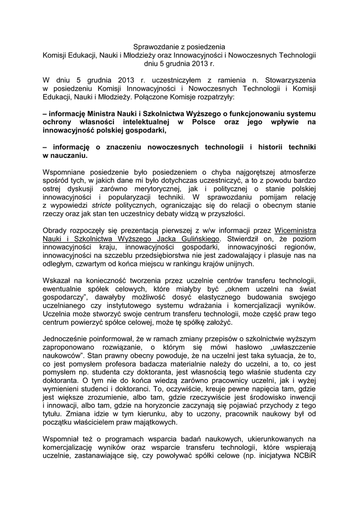 Sprawozdanie z posiedzenia Komisji Edukacji, Nauki i Młodzieży oraz Innowacyjności i Nowoczesnych Technologii dniu 5 grudnia 2013 r. W dniu 5 grudnia 2013 r. uczestniczyłem z ramienia n. Stowarzyszenia w posiedzeniu Komisji Innowacyjności i Nowoczesnych Technologii i Komisji Edukacji, Nauki i Młodzieży. Połączone Komisje rozpatrzyły: – informację Ministra Nauki i Szkolnictwa Wyższego o funkcjonowaniu systemu ochrony własności intelektualnej w Polsce oraz jego wpływie na innowacyjność polskiej gospodarki, – informację o znaczeniu nowoczesnych technologii i historii techniki w nauczaniu. Wspomniane posiedzenie było posiedzeniem o chyba najgorętszej atmosferze spośród tych, w jakich dane mi było dotychczas uczestniczyć, a to z powodu bardzo ostrej dyskusji zarówno merytorycznej, jak i politycznej o stanie polskiej innowacyjności i popularyzacji techniki. W sprawozdaniu pomijam relację z wypowiedzi stricte politycznych, ograniczając się do relacji o obecnym stanie rzeczy oraz jak stan ten uczestnicy debaty widzą w przyszłości. Obrady rozpoczęły się prezentacją pierwszej z w/w informacji przez Wiceministra Nauki i Szkolnictwa Wyższego Jacka Gulińskiego. Stwierdził on, że poziom innowacyjności kraju, innowacyjności gospodarki, innowacyjności regionów, innowacyjności na szczeblu przedsiębiorstwa nie jest zadowalający i plasuje nas na odległym, czwartym od końca miejscu w rankingu krajów unijnych. Wskazał na konieczność tworzenia przez uczelnie centrów transferu technologii, ewentualnie spółek celowych, które miałyby być „oknem uczelni na świat gospodarczy”, dawałyby możliwość dosyć elastycznego budowania swojego uczelnianego czy instytutowego systemu wdrażania i komercjalizacji wyników. Uczelnia może stworzyć swoje centrum transferu technologii, może część praw tego centrum powierzyć spółce celowej, może tę spółkę założyć. Jednocześnie poinformował, że w ramach zmiany przepisów o szkolnictwie wyższym zaproponowano rozwiązanie, o którym się mówi hasłowo „uwłaszczenie naukowców”. Stan prawny obecny powoduje, że na uczelni jest taka sytuacja, że to, co jest pomysłem profesora badacza materialnie należy do uczelni, a to, co jest pomysłem np. studenta czy doktoranta, jest własnością tego właśnie studenta czy doktoranta. O tym nie do końca wiedzą zarówno pracownicy uczelni, jak i wyżej wymienieni studenci i doktoranci. To, oczywiście, kreuje pewne napięcia tam, gdzie jest większe zrozumienie, albo tam, gdzie rzeczywiście jest środowisko inwencji i innowacji, albo tam, gdzie na horyzoncie zaczynają się pojawiać przychody z tego tytułu. Zmiana idzie w tym kierunku, aby to uczony, pracownik naukowy był od początku właścicielem praw majątkowych. Wspomniał też o programach wsparcia badań naukowych, ukierunkowanych na komercjalizację wyników oraz wsparcie transferu technologii, które wspierają uczelnie, zastanawiające się, czy powoływać spółki celowe (np. inicjatywa NCBiR pod nazwą SPIN TECH). Są to programy, które wspierają inkubatory innowacyjności, które już są na uczelniach. Oparte są o pilotażowe konkursy (jest ich sześć). Dopiero po ich zakończeniu będzie można wysnuć wnioski, czy tego typu działania można na trwałe zapisać w instrumentach wsparcia, chociażby w perspektywie 20142020.Oczywiście, jak to ostatecznie będzie wyglądało będzie zależało od dyskusji i od ostatecznego kształtu przyjętej nowelizacji, zarówno prawa o szkolnictwie wyższym, jak i ustawy o zasadach finansowania nauki. Dr inż. Marek Bury, Politechnika Warszawska skrytykował projekt uwłaszczenia naukowców, wskazując, że takie koncepcje były już obowiązującym prawem w kilku krajach, np. w Stanach Zjednoczonych, lecz nie zakończyły się sukcesem uchyleniem przepisów. Porażki zostały nie dostatecznie przeanalizowane przed zaproponowaniem projektu ustawy, co spowodowało ostrą reakcję Konferencji Rektorów Akademickich Szkół Polskich. Do stanowiska rektorów została np. dołączona opinia profesora Szewca, który wyraża się dość niepochlebnie na temat spójności legislacyjnej tego projektu, stwierdzając, że projekt ten jest „siermiężny”, „Wybrane rozwiązanie poraża anachronizmem i naiwnością”, „Zawarta w projekcie noweli próba «reanimacji» zasady twórczości w jej pierwotnej wersji cofa nasze prawo własności intelektualnej o ponad 100 lat”. Ustawa wymaga zatem nieco głębszego dopracowania. Wiceprezes Polskiej Akademii Nauk prof. Marek Chmielewski wyraził zaniepokojenie faktem likwidowania pionów badawczo-rozwojowych, szczególnie w dużych firmach państwowych. I tak np. w Orlenie, z przychodem 120 mld zł rocznie, gdzie Skarb Państwa to akcjonariusz strategiczny ( do niego 28% akcji ) nie ma pionu badawczorozwojowego. Zarząd twierdzi, że boleją nad tym i chcą taki pion badawczorozwojowy mieć, ale nie ma do tego asumptu od akcjonariuszy. Duże firmy likwidują piony badawczo-rozwojowe (np. Orlen). Bez pionu badawczo-rozwojowego w przemyśle nie ma mowy o żadnej współpracy nauki z przemysłem, bo po prostu nie ma z kim rozmawiać. W dużych firmach krajowych, w których PAN organizował spotkania Komitetu Chemii słyszano od prezesów: „Pion badawczo-rozwojowy? Wyprowadziłem za bramę”, albo „Pion badawczo-rozwojowy? A po co mi? Jakbym miał jakieś nadwyżki, to wolę dać na moją drużynę koszykówki”. Dużo uwag i to niestety krytycznych wywołało wystąpienie Prezes Urzędu Patentowego Alicji Adamczak, która stwierdziła, że w pierwszej połowie 2013r., według danych statystycznych odnotowanych w UPRP, 41% wszystkich zgłoszeń wynalazków i wzorów użytkowych pochodziło z sektora nauki, rozumianego jako instytuty badawcze, jednostki naukowe PAN i szkoły wyższe. Z jednostek sektora gospodarki było 40% zgłoszeń i od osób fizycznych 19%. Ten rozkład liczbowy był charakter