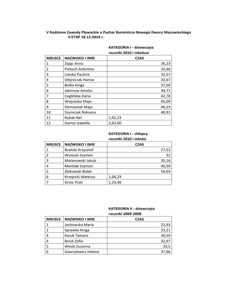 V Rodzinne Zawody Pływackie o Puchar Burmistrza Nowego Dworu Mazowieckiego II ETAP 18.12.2016 r. MIEJSCE 1 2 3 4 5 6 7 8 9 10 11 12 MIEJSCE 1 2 3 4 5 6 7 MIEJSCE 1 2 3 4 5 6 NAZWISKO I IMIE Zając Anna Pietuch Antonina Liwska Paulina Olejniczak Hanna Bułka Kinga Jakimow Amelia Ceglińśka Daria Wojcieska Maja Demianiuk Maja Szymczak Roksana Rybak Nel Damsz Izabella NAZWISKO I IMIE Brański Krzysztof Wysocki Szymon Matanowski Jakub Mentlak Szymon Żbikowski Bolek Krzepicki Mateusz Siroic Piotr NAZWISKO I IMIE Jankowska Maria Sprawka Kinga Karuk Tamara Bziuk Zofia Wicek Zuzanna Gawryłowicz Helena KATEGORIA I - dziewczęta roczniki 2010 i młodsze CZAS 26,23 32,46 32,57 32,67 37,09 39,71 42,78 45,09 46,23 48,91 1,02,23 2,63,00 KATEGORIA I - chłopcy roczniki 2010 i młodsi CZAS 27,52 32 35,16 40,59 54,03 1,06,23 1,23,40 KATEGORIA II - dziewczęta roczniki 2009-2008 CZAS 22,93 23,21 30,59 32,97 33,5 37,66 MIEJSCE 1 2 3 4 5 6 7 8 9 10 MIEJSCE 1 2 3 4 5 6 7 8 9 10 MIEJSCE 1 2 3 4 5 6 7 8 9 10 11 12 NAZWISKO I IMIE Oszczyk Maksym Michałowski Jan Lis Przemek Budniak Filip Hołubowicz Filip Osiński Nikodem Majewski Mikołaj Caban Kamil Siroic Wojciech Wysocki Aleksander NAZWISKO I IMIE Jacobson Róża Oliwa Oliwia Brańska Agata Sac Sylwia Wysocka Alicja Krzepicka Olga Mentlak Julia Kiedrowska Martyna Wojciechowska Zofia Marońska Kaja NAZWISKO I IMIE Ślesik Oskar Maliński Julian Trębacz Mikołaj Bułkin Igor Bąkowski Karol Malec Bartłomiej Lis Kamil Ratuszniak Kacper Kapuściński Aleksander Lis Przemek pk Żywczak Oskar Grzybowski Adam KATEGORIA II - chłopcy roczniki 2009-2008 CZAS 18,63 18,96 21,53 22,95 23,33 31,46 36,53 40,59 50,78 58,04 KATEGORIA III - dziewczęta roczniki 2007-2006 CZAS 41,97 44,88 48,59 52,19 53,14 54,94 55,41 1,18,47 1,36,16 KATEGORIA III - chłopcy roczniki 2007-2006 CZAS 38,22 39,74 39,93 41,33 46 48,58 49,49 49,53 50,8 51,69 53,69 54,97 13 14 Kamiński Filip Kucharuk Rafał MIEJSCE NAZWISKO I IMIE 1 Gumińska Diana Grzegorzewska 2 Michalina 3 Osińska Wiktoria 4 Łempicka Aleksandra 5 Tomanek Zuzanna 6 Pietrzak Karolina MIEJSCE 1 2 3 4 5 6 7 8 NAZWISKO I IMIE Zając Szymon Kozub Aleksander Brocławik Mikołaj Cegliński Karol Imiołek Marcin Hołubowicz Piotr Reluga Patryk Kucharuk Piotr MIEJSCE NAZWISKO I IMIE 1 Kamińska Inga 2 Iwańczuk Izabela 3 4 MIEJSCE 1 2 3 4 5 6 NAZWISKO I IMIE Szewczyk Wojciech Florczuk Aleksander Gumiński Gabriel Bziuk Oskar Ratuszniak Kuba Trębacz Michał PK 55,86 1,20,52 KATEGORIA IV - dziewczęta roczniki 2005-2004 CZAS 34,65 35,07 36,35 40,47 42,61 46,41 KATEGORIA IV - Chłopcy roczniki 2005-2004 CZAS 33,81 38,72 41,39 41,91 47,19 48,88 49,1 1,26,27 KATEGORIA V - dziewczęta roczniki 2003-2001 CZAS 30,35 41,66 KATEGORIA V - Chłopcy roczniki 2003-2001 CZAS 28,22 31,83 32,31 32,89 42,51 28,84 MIEJSCE NAZWISKO I IMIE 1 Bułkin Laura MIEJSCE 1 2 3 4 5 NAZWISKO I IMIE Imiołek Wojciech Demianiuk Marcin Grzelak Łukasz Matanowski Sebastian Ratuszniak Krzysztof KATEGORIA VI OPEN - Kobiety roczniki 2000-… CZAS 41,03 KATEGORIA VI OPEN - Meżczyźni roczniki 2000-… CZAS 34,25 34,41 35,44 44,61 45,94 MIEJSCE NAZWISKO I IMIE 1 Sierzputowska Maria 2 Urszula Mańkowska KATEGORIA VII OPEN 50+ - Kobiety roczniki 50+ CZAS 1,22,47 1,35,36 MIEJSCE 1 2 3 KATEGORIA VII OPEN 50+ Mężczyźni roczniki 50+ CZAS 40,19 40,75 1,41,78 NAZWISKO I IMIE Młodzikowski Rafał Grzelak Tomasz Fabrycy Ryszard Sztafeta Rodzinna Grupa I ( dziecko rocznika 2006 i młodsze) MIEJSCE NAZWISKO I IMIĘ Trębacz Miikołaj 1 Trębacz Piotr Oliwa Oliwia 2 Trzaskoma Piotr Maliński Julian 3 Maliński Grzegorz Bułkin Igor CZAS 35,7 35,72 36,58 38,84 4 Bułkin Laura Oszczyk Maksym 5 Oszczyk Piotr Mentlak Julia 42,53 6 Mentlak Konrad Jankowska Maria 44,9 7 Jankowski Paweł Lis Przemek 45,23 8 Lis Marek Lis Kamil 45,59 45,85 9 Lis Marek Sieniakowski Marcel 10 Sieniakowski Adrian Miszczak Karina 46,31 11 Miszczak Rafał Matanowski Jakub 53,79 12 Matanowski Sebastian Osiński Nikodem 55,3 13 Osiński Piotr Żywczak Maja 59,81 14 Żywczak Rafał Tomanek Maria 1,09,40 15 Młodzikowski Rafał Matanowska Katarzyna 1,25,28 16 Matanowski Sebastian 1,54,56 Sztafeta OPEN grupa I (dziecko rocznika 2006 i młodsze) MIEJSCE 1 NAZWISKO I IMIĘ Oskar Ślesik Wojcieszek Antoni Trębacz Mikołaj 2 38,79 Kamińska Inga Grzybowski Adam 4 32,03 Trębacz Michał Kamiński Filip 3 CZAS 31,94 53,34 Trojanowska Weronika Sztafeta Rodzinna Grupa II ( dziecko rocznika 2005 i starsze) MIEJSCE NAZWISKO I IMIĘ Sieniakowski Krystian CZAS 1 Sieniakowski Adrian Grzelak Łukasz 32,87 2 Grzelak Tomasz Rzeplińska Iwona 34,15 3 Brocławik Mikołaj Cegliński Karol 39,43 39,95 4 Cegliński Marcin Tomanek Zuzanna 5 Młodzikowski Rafał Kozub Aleksander 41,4 6 Kozub Kamila 49,03 Sztafeta OPEN Grupa II ( dziecko rocznika 2005 i starsze) TOR 1 2 3 4 NAZWISKO I IMIĘ Szewczyk Wojciech CZAS 26,66 Szewczyk Michał Gumińska Diana 32,18 Gumiński Gabriel Grzegorzewska Michalina 34,1 Osińska Wiktoria Imiołek Wojciech Imiołek Marcin 39