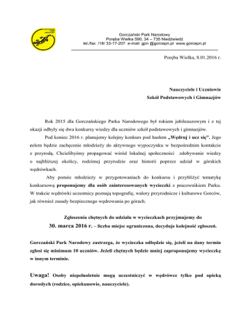 Gorczański Park Narodowy Poręba Wielka 590, 34 – 735 Niedźwiedź tel./fax /18/ 33-17-207 e-mail: gpn @gorcepn.pl www.gorcepn.pl Poręba Wielka, 8.01.2016 r. Nauczyciele i Uczniowie Szkół Podstawowych i Gimnazjów Rok 2015 dla Gorczańskiego Parku Narodowego był rokiem jubileuszowym i z tej okazji odbyły się dwa konkursy wiedzy dla uczniów szkół podstawowych i gimnazjów. Pod koniec 2016 r. planujemy kolejny konkurs pod hasłem „Wędruj i ucz się”. Jego celem będzie zachęcenie młodzieży do aktywnego wypoczynku w bezpośrednim kontakcie z przyrodą. Chcielibyśmy propagować wśród lokalnej społeczności zdobywanie wiedzy o najbliższej okolicy, rodzimej przyrodzie oraz historii poprzez udział w górskich wędrówkach. Aby pomóc młodzieży w przygotowaniach do konkursu i przybliżyć tematykę konkursową proponujemy dla osób zainteresowanych wycieczki z pracownikiem Parku. W trakcie wędrówki uczestnicy poznają topografię, walory przyrodnicze i kulturowe Gorców, jak również zasady bezpiecznego wędrowania po górach. Zgłoszenia chętnych do udziału w wycieczkach przyjmujemy do 30. marca 2016 r. – liczba miejsc ograniczona, decyduje kolejność zgłoszeń. Gorczański Park Narodowy zastrzega, że wycieczka odbędzie się, jeżeli na dany termin zgłosi się minimum 10 uczniów. Jeżeli chętnych będzie mniej zaproponujemy wycieczkę w innym terminie. Uwaga! Osoby niepełnoletnie mogą uczestniczyć w wędrówce tylko pod opieką dorosłych (rodzice, opiekunowie, nauczyciele). Zgłoszenia prosimy kierować do Zespołu Edukacji i Udostępniania Parku drogą elektroniczną na adres: [email protected] W zgłoszeniu należy podać nazwisko uczestnika i jego opiekuna oraz dane kontaktowe – numer telefonu oraz adres e-mail. O szczegółach organizacyjnych będziemy powiadamiać bezpośrednio zainteresowanych. Proponowane terminy i trasy wędrówek: 28. maja 2016 r. (sobota) – ścieżka edukacyjna „Z Łopusznej na Jankówki”, szlak czerwony. Spotkanie z przewodnikiem – gajówka Mikołaja w Łopusznej; czas wędrówki ok. 5 godz. Trasa ok. 7 km, pokonywana różnica wzniesień 500 m; 29. maja 2016 r. (niedziela) – ścieżka edukacyjna „Na Turbaczyk”, szlak zielony. Spotkanie z przewodnikiem – miejsce biwakowe Oberówka w Koninkach; czas wędrówki ok. 5 godz. Trasa 6 km, pokonywana różnica wzniesień 360 m; 4. czerwca 2016 r. (sobota) – ścieżka edukacyjna „Dolina Gorcowego potoku”, szlak żółty i zielony przez Stawieniec. Spotkanie z przewodnikiem – miejsce biwakowe Trusiówka w Lubomierzu; czas wędrówki ok. 6 godz. Trasa ok. 11 km, pokonywana różnica wzniesień 500 m; 5. czerwca 2016 r. (niedziela) – szlak niebieski na Czoło Turbacza – Turbacz, powrót czerwonym i zielonym przez Tobołów. Spotkanie z przewodnikiem – miejsce biwakowe Oberówka w Koninkach; czas wędrówki ok. 7 godz. Trasa ok. 15 km, pokonywana różnica wzniesień 640 m; 16. lipca 2016 r. (sobota) – szlak żółty przez Kudłoń do przełęczy Borek i powrót niebieskim szlakiem doliną Kamienicy. Spotkanie z przewodnikiem – miejsce biwakowe Oberówka w Koninkach; czas wędrówki ok. 7 godz. Trasa ok. 16 km, pokonywana różnica wzniesień 560 m; 6. sierpnia 2016 r. (sobota) – szlak niebieski na Czoło Turbacza – Turbacz – powrót zielonym przez Turbaczyk. Spotkanie z przewodnikiem – miejsce biwakowe Oberówka w Koninkach; czas wędrówki ok. 7 godz. Trasa ok. 16 km, pokonywana różnica wzniesień 640 m; 17. września 2016 r. (sobota) – ścieżka edukacyjna „Dolina potoku Jaszcze” Spotkanie z przewodnikiem – polana Łonna w Ochotnicy Górnej czas wędrówki ok. 4 godz. Trasa ok. 9 km, pokonywana różnica wzniesień 380 m; 18. września 2016 r. (niedziela) – ścieżka edukacyjna „Z Turbacza na Jaworzynę Kamienicką”. Spotkanie z przewodnikiem – schronisko im. Wł. Orkana pod Turbaczem; czas wędrówki ok. 3 godz. praktycznie po płaskim grzbiecie. Długość ok. 8 km. Uwaga! Uczestnicy wycieczki na miejsce spotkania z przewodnikiem muszą dotrzeć sami. Powrót z wycieczki również we własnym zakresie!!! Wyboru wycieczki należy dokonać biorąc pod uwagę termin, długość trasy, stopień trudności. Aby poznać podstawowe zagadnienia wystarczy uczestniczyć w jednej lub dwóch wycieczkach. Zwracamy się z prośbą o rozpropagowanie wycieczek również wśród Rodziców.