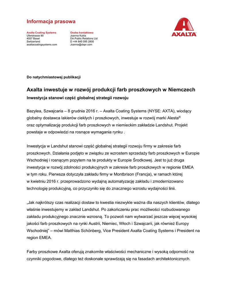 Informacja prasowa Axalta Coating Systems Uferstrasse 90 4057 Basel Switzerland axaltacoatingsystems.com Osoba kontaktowa Joanna Kukla DA Public Relations Ltd D +44 845 095 2800 [email protected] Do natychmiastowej publikacji Axalta inwestuje w rozwój produkcji farb proszkowych w Niemczech Inwestycja stanowi część globalnej strategii rozwoju Bazylea, Szwajcaria – 8 grudnia 2016 r. – Axalta Coating Systems (NYSE: AXTA), wiodący globalny dostawca lakierów ciekłych i proszkowych, inwestuje w rozwój marki Alesta® oraz optymalizację produkcji farb proszkowych w niemieckim zakładzie Landshut. Projekt powstaje w odpowiedzi na rosnące wymagania rynku . Inwestycja w Landshut stanowi część globalnej strategii rozwoju firmy w zakresie farb proszkowych. Działania podjęto w związku ze wzrostem sprzedaży farb proszkowych w Europie Wschodniej i rosnącym popytem na te produkty w Europie Środkowej. Jest to już druga inwestycja w rozwój zdolności produkcyjnych w zakresie farb proszkowych w regionie EMEA w tym roku. Pierwsza dotyczyła zakładu firmy w Montbrison (Francja), w ramach której w kwietniu 2016 r. przeprowadzono wydajną automatyzację zakładu i zmodernizowano technologię produkcyjną, co przyczyniło się do znacznego wzrostu wydajności linii. „Jak najkrótszy czas realizacji dostaw to kwestia niezwykle ważna dla naszych klientów, dlatego właśnie inwestujemy w zakład Landshut. Po zakończeniu prac możliwości rozbudowanego zakładu produkcyjnego znacznie wzrosną. To pozwoli nam wytwarzać jeszcze więcej wysokiej jakości farb proszkowych na rynki Austrii, Niemiec, Włoch i Szwajcarii, jak również Europy Wschodniej” – mówi Matthias Schönberg, Vice President Axalta Coating Systems i President na region EMEA. Farby proszkowe Axalta oferują znakomite właściwości mechaniczne i wysoką odporność na czynniki pogodowe, dlatego też doskonale sprawdzają się na fasadach architektonicznych. Inwestycje w zakłady Montbrison i Landshut dowodzą zaangażowania firmy Axalta w rozwój zdolności produkcyjnych w zakresie farb proszkowych. Celem firmy jest sprostać wymaganiom swoich klientów. Projekt rozbudowy zakładu w Landshut składa się z trzech etapów i powinien dobiec końca w marcu 2017 r. Pierwszy etap zakończył się pod koniec 2015 r., a drugi – w marcu 2016 r. Więcej informacji o farbach proszkowych Axalta na stronie: www.powder.axaltacs.com. O Axalta Coating Systems – 150 lat w przemyśle lakierniczym Axalta jest wiodącą światową firmą koncentrującą się wyłącznie na materiałach lakierniczych, która oferuje swoim klientom innowacyjne, kolorowe, piękne i niezawodne rozwiązania. Nasze lakiery przeznaczone są dla producentów samochodów, warsztatów renowacyjnych zajmujących się naprawą samochodów osobowych i dostawczych, dostawców silników elektrycznych i rurociągów oraz branży budowlanej i projektowane są z myślą o zapobieganiu korozji, zwiększaniu wydajności i zapewnianiu trwałości powlekanych powierzchni. Bazując na 150 latach doświadczeń w branży lakierniczej, 12 800 pracowników firmy Axalta stale poszukuje sposobów, by jeszcze lepiej służyć ponad 120 000 klientom w 130 krajach, oferując im najlepsze systemy lakiernicze i techniki ich aplikacji. Więcej informacji na naszej stronie internetowej axaltacoatingsystems.com i na Twitterze @Axalta oraz na LinkedIn. ### 409 słów