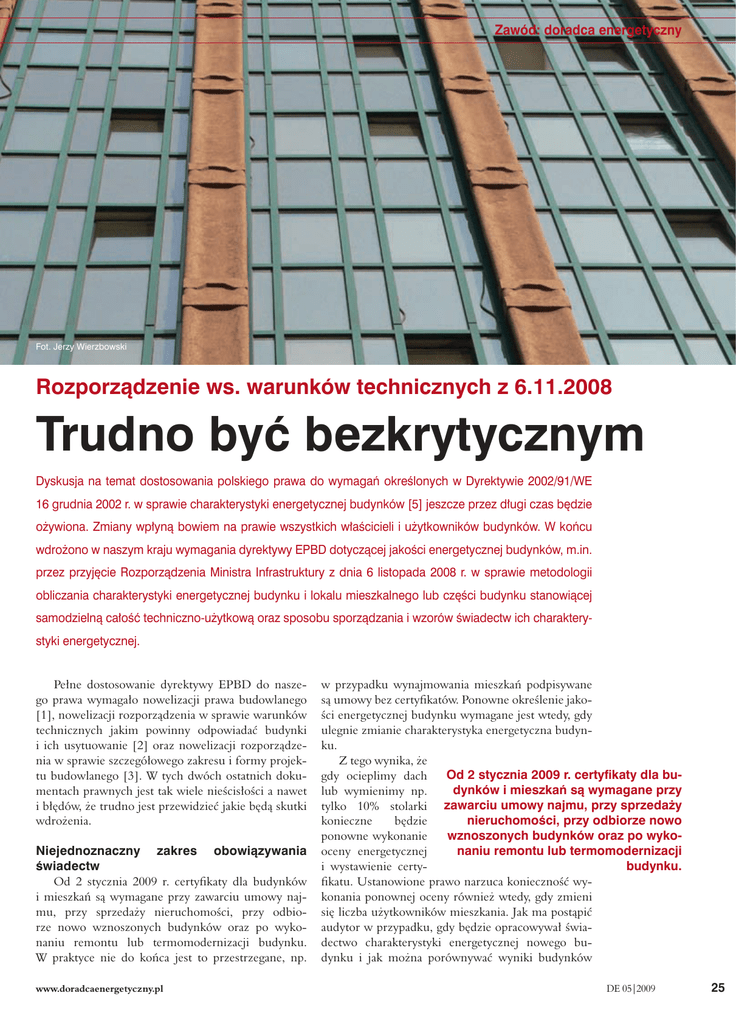 Zawód: doradca energetyczny Fot. Jerzy Wierzbowski Rozporządzenie ws. warunków technicznych z 6.11.2008 Trudno być bezkrytycznym Dyskusja na temat dostosowania polskiego prawa do wymagań określonych w Dyrektywie 2002/91/WE 16 grudnia 2002 r. w sprawie charakterystyki energetycznej budynków [5] jeszcze przez długi czas będzie ożywiona. Zmiany wpłyną bowiem na prawie wszystkich właścicieli i użytkowników budynków. W końcu wdrożono w naszym kraju wymagania dyrektywy EPBD dotyczącej jakości energetycznej budynków, m.in. przez przyjęcie Rozporządzenia Ministra Infrastruktury z dnia 6 listopada 2008 r. w sprawie metodologii obliczania charakterystyki energetycznej budynku i lokalu mieszkalnego lub części budynku stanowiącej samodzielną całość techniczno-użytkową oraz sposobu sporządzania i wzorów świadectw ich charakterystyki energetycznej. Pełne dostosowanie dyrektywy EPBD do naszego prawa wymagało nowelizacji prawa budowlanego [1], nowelizacji rozporządzenia w sprawie warunków technicznych jakim powinny odpowiadać budynki i ich usytuowanie [2] oraz nowelizacji rozporządzenia w sprawie szczegółowego zakresu i formy projektu budowlanego [3]. W tych dwóch ostatnich dokumentach prawnych jest tak wiele nieścisłości a nawet i błędów, że trudno jest przewidzieć jakie będą skutki wdrożenia. Niejednoznaczny świadectw zakres obowiązywania Od 2 stycznia 2009 r. certyfikaty dla budynków i mieszkań są wymagane przy zawarciu umowy najmu, przy sprzedaży nieruchomości, przy odbiorze nowo wznoszonych budynków oraz po wykonaniu remontu lub termomodernizacji budynku. W praktyce nie do końca jest to przestrzegane, np. www.doradcaenergetyczny.pl w przypadku wynajmowania mieszkań podpisywane są umowy bez certyfikatów. Ponowne określenie jakości energetycznej budynku wymagane jest wtedy, gdy ulegnie zmianie charakterystyka energetyczna budynku. Z tego wynika, że Od 2 stycznia 2009 r. certyfikaty dla bugdy ocieplimy dach dynków i mieszkań są wymagane przy lub wymienimy np. tylko 10% stolarki zawarciu umowy najmu, przy sprzedaży nieruchomości, przy odbiorze nowo konieczne będzie wznoszonych budynków oraz po wykoponowne wykonanie naniu remontu lub termomodernizacji oceny energetycznej i wystawienie certybudynku. fikatu. Ustanowione prawo narzuca konieczność wykonania ponownej oceny również wtedy, gdy zmieni się liczba użytkowników mieszkania. Jak ma postąpić audytor w przypadku, gdy będzie opracowywał świadectwo charakterystyki energetycznej nowego budynku i jak można porównywać wyniki budynków DE 05|2009 25 Zawód: doradca energetyczny oddawanych do użytkowania i budynków już eksploatowanych? Z jednej strony ustawodawca próbuje uprościć procedury, tak aby za jednym razem wykonać ocenę budynku i znajdujących się w nim lokali, z drugiej strony narzuca konieczność wykonywania oceny kiedy zostanie wprowadzone nawet drobne usprawnienie mające wpływ na jakość energetyczną obiektu lub mieszkania. W tej sytuacji można stwierdzić, że nie zostało sprecyzowane poprawnie kiedy, po jakim remoncie budynku będzie wymagane wykonanie certyfikatu, co spowo- Nie jest precyzyjnie określone kiedy powinien być wykonany certyfikat dla lokalu wynajmowanego. Trudność polega na tym, że nie wiadomo jak się zachować kiedy umowa na wynajem lokalu lub mieszkania została zawarta przed 2009 r. i nie zawiera zapisu o konieczności posiadania certyfikatu. Czy należy postąpić jak z mieszkaniem, dla którego certyfikat jest wymagany dopiero przy zawieraniu umowy notarialnej? duje szereg problemów, które mogą doprowadzić do łamania prawa. Nikt nie będzie wykonywał ponownie certyfikatu dla budynku, w którym dokonano np. wymiany jednego okna lub, gdy zmieni się liczba osób użytkujących mieszkanie. Jest pewne, że posiadanie certyfikatu będzie wymagane, gdy inwestor będzie ubiegał się o pozwolenie na użytkowanie. W przypadku drobnych remontów mających wpływ na jakość energetyczną budynku lub lokalu taki wymóg będzie nagminnie omijany. Można metodą porównawczą wywnioskować, że skoro dla istniejących mieszkań wymóg posiadania certyfikatu występuje dopiero przy zawarciu umowy najmu, to podobnie dla wynajmowanych lokali i mieszkań udostępnienie certyfikatu wystąpi dopiero na etapie zawarcia lub zmiany umowy najmu. Wydaje się, że zapis ten jest sprzeczny z wymaganiami dyrektywy. Rozporządzenie technicznych w sprawie warunków Wprowadzenie zmian warunków, jakim powinny odpowiadać budynki wskazują na niekonsekwencję, a ponadto brak spójności z innymi dokumentami. Konsekwencje mogą być poważne. W § 328. 1. rozszerzono zapis, który wymaga, aby budynek i jego instalacje ogrzewcze, wentylacyjne i klimatyzacyjne, ciepłej wody użytkowej, a w przypadku budynku użyteczności publicznej również oświetlenia wbudowanego, były zaprojektowane i wykonane w taki sposób, aby ilość ciepła, chłodu i energii elektrycznej, potrzebnych do użytkowania budynku zgodnie z jego przeznaczeniem, można było utrzymać na racjonalnie niskim poziomie. Rozszerzenie racjonalizacji obejmuje dodatkowo sprawdzenie wymagań w zakresie ciepłej wody użyt- 26 DE 05|2009 kowej, chłodu i energii elektrycznej. W rozporządzeniu jest szereg nieprecyzyjnych zapisów. Na przykład wymaga się, aby budynek był zaprojektowany i wykonany w sposób ograniczający ryzyko przegrzewania budynku w okresie letnim. Nie ma jednak sprecyzowanego warunku, za pomocą którego można zweryfikować poprawność przyjętych rozwiązań. Można się tylko domyślać, że chodzi o graniczny współczynnik przepuszczalności energii całkowitej okna oraz przegród przezroczystych gc, który odnosi się do wszystkich rodzajów budynków. Liczony jest według wzoru: gc = fc · gg gdzie: gg – współczynnik przepuszczalności energii całkowitej dla zestawu szybowego, fc – współczynnik korekcyjny ze względu na zastosowane urządz