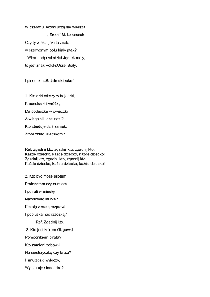 W czerwcu Jeżyki uczą się wiersza: „ Znak” M. Łaszczuk Czy ty wiesz, jaki to znak, w czerwonym polu biały ptak? - Wiem -odpowiedział Jędrek mały, to jest znak Polski:Orzeł Biały. I piosenki :„Każde dziecko” 1. Kto dziś wierzy w bajeczki, Krasnoludki i wróżki, Ma poduszkę w owieczki, A w kąpieli kaczuszki? Kto zbuduje dziś zamek, Zrobi obiad laleczkom? Ref. Zgadnij kto, zgadnij kto, zgadnij kto. Każde dziecko, każde dziecko, każde dziecko! Zgadnij kto, zgadnij kto, zgadnij kto. Każde dziecko, każde dziecko, każde dziecko! 2. Kto być może pilotem, Profesorem czy nurkiem I potrafi w minutę Narysować laurkę? Kto się z nudą rozprawi I popluska nad rzeczką? Ref. Zgadnij kto… 3. Kto jest królem ślizgawki, Pomocnikiem pirata? Kto zamieni zabawki Na siostrzyczkę czy brata? I smuteczki wyleczy, Wyczaruje słoneczko?