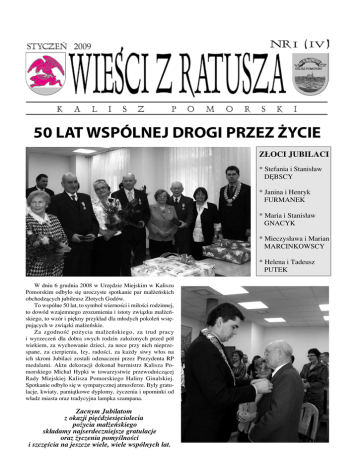 50 LAT WSPÓLNEJ DROGI PRZEZ ŻYCIE ZŁOCI JUBILACI * Stefania i Stanisław Dębscy * Janina i Henryk Furmanek * Maria i Stanisław Gnacyk * Mieczysława i Marian Marcinkowscy * Helena i Tadeusz Putek W dniu 6 grudnia 2008 w Urzędzie Miejskim w Kaliszu Pomorskim odbyło się uroczyste spotkanie par małżeńskich obchodzących jubileusz Złotych Godów. To wspólne 50 lat, to symbol wierności i miłości rodzinnej, to dowód wzajemnego zrozumienia i istoty związku małżeńskiego, to wzór i piękny przykład dla młodych pokoleń wstępujących w związki małżeńskie. Za zgodność pożycia małżeńskiego, za trud pracy i wyrzeczeń dla dobra swych rodzin założonych przed pół wiekiem, za wychowanie dzieci, za noce przy nich nieprzespane, za cierpienia, łzy, radości, za każdy siwy włos na ich skroni Jubilaci zostali odznaczeni przez Prezydenta RP medalami. Aktu dekoracji dokonał burmistrz Kalisza Pomorskiego Michał Hypki w towarzystwie przewodniczącej Rady Miejskiej Kalisza Pomorskiego Haliny Ginalskiej. Spotkanie odbyło się w sympatycznej atmosferze. Były gratulacje, kwiaty, pamiątkowe dyplomy, życzenia i upominki od władz miasta oraz tradycyjna lampka szampana. Zacnym Jubilatom z okazji pięćdziesięciolecia pożycia małżeńskiego składamy najserdeczniejsze gratulacje oraz życzenia pomyślności i szczęścia na jeszcze wiele, wiele wspólnych lat. STR. 2 MIKOŁAJU NASZ… Wzorem ubiegłych lat, 5 grudnia 2008 roku, już od wczesnych godzin rannych ulicami Kalisza Pomorskiego spacerowały Mikołaje pozdrawiając mieszkańców i obdarowując najmłodszych słodyczami. Mikołaje odwiedziły m. in. Przedszkole Miejskie „Bajkolandia” oraz wszystkie gminne szkoły. Dzieci, którym nie udało się spotkać Mikołaja na ulicach miasta mogły się wybrać na osobiste z nim spotkanie, które odbyło się 6 grudnia 2008 o godz. 16.00 w Miejsko-Gminnym Ośrodku Kultury w Kaliszu Pomorskim. Towarzystwo Przyjaciół Dzieci Koło Pomocy Dzieciom z Niepełną Sprawnością Ruchową DZIAŁA JUŻ 10 LAT Dnia 20 grudnia 2008 roku w Miejsko-Gminnym Ośrodku Kultury w Kaliszu Pomorskim odbyło się spotkanie Świąteczno-Noworoczne „Integracja przy opłatku” połączone z obchodami 10-lecia Koła Pomocy Dzieciom z Niepełną Sprawnością Ruchową. Współorganizatorem spotkania był Samorząd Mieszkańców nr 1,2,3. Występy artystyczne rozpoczęły się świątecznym wierszem, który wyrecyto- wała podopieczna Koła Monika Misiura. Następnie wystąpiły dzieci ze Szkoły Podstawowej z programem przygotowanym przez panie Urszulę Jarzyńską i Teodorę Ilnicka. Na zakończenie występów pięknie na organach zagrał Hubert Jankowski. Historię Koła Pomocy Dzieciom z Niepełną Sprawnością Ruchową, przybliżyła prezentacja multimedialna przygotowana przez uczniów Zespołu Szkół Ponadgimnazjalnych pod opieką Adama Stąporka. Były życzenia, opłatek, Mikołaj i tort jubileuszowy a także wiele innych słodkości i prezentów. Wszyscy zaproszeni goście otrzymali wykonane przez dzieci upominki. Podczas spotkania można było podziwiać wystawę prezentującą 10 lat działalności koła. Kaliskie Koło Pomocy Dzieciom z Niepełną Sprawnością Ruchową składa serdeczne podziękowania dla sponsorów: starosty drawskiego i Rady Powiatu burmistrza Kalisza Pomorskiego i Rady Miejskiej Banku Spółdzielczego w Kaliszu Pomorskim Zachodniopomorskiej Izby Rolniczej w Szczecinie Szkoły Podstawowej w Kaliszu Pomorskim Klubu Calisia Pani Bożeny Kuwałek Państwa Wandy i Ryszarda Domagalskich Pani Teresy Kozak. Z okazji 10-lecia działalności Koła złożono podziękowania za szczególny wkład i zaangażowanie w działania na rzecz dzieci niepełnosprawnych, a także za pomoc w gromadzeniu środków pie- STR. 3 WIEŚCI Z RATUSZA niężnych dla władz samorządowych, dla miejscowych przedsiębiorców oraz ludzi dobrej woli i otwartych serc. Podziękowania otrzymali: Zygmunt Pyszkowski – prezes Towarzystwa Przyjaciół Dzieci, Zachodniopomorski Oddział Regionalny w Szczecinie. Henryk Zabrocki – prezes Towarzystwa Przyjaciół Dzieci, Oddział Okręgowy w Koszalinie. Stanisław Cybula – starosta Powiatu Drawskiego. Michał Hypki – burmistrz Kalisza Pomorskiego. Tadeusz Wach – zastępca burmistrza Kalisza Pomorskiego Halina Samek – radna Powiatu Drawskiego Grażyna Kowalska – radna Powiatu Drawskiego. Halina Ginalska – przewodnicząca Rady Miejskiej. Antoni Oleksiuk – radny Kalisza Pomorskiego. Violetta Zbytek – radna Kalisza Pomorskiego. Bożena Kuwałek – radna Kalisza Pomorskiego. Zbigniew Witek – radny Kalisza Pomorskiego Paweł Kulbacki – radny Kalisza Pomorskiego Alicja Krycka-Sumińska – kierownik Powiatowego Centrum Pomocy Rodzinie w Drawsku Pomorskim. Wiesława Mackiewicz – Powiatowe Centrum Pomocy Rodzinie w Drawsku Pomorskim. Danuta Sycz – dyrektor Poradni Psychologiczno-Pedagogicznej w Draw- sku Pomorskim Halina Maras – kierownik MiejskoGminnego Ośrodka Pomocy Społecznej w Kaliszu Pomorskim. Tomasz Bukowski – dyrektor Miejsko-Gminnego Ośrodka Kultury w Kaliszu Pomorskim. Stanisław Samek – dyrektor Banku Spółdzielczego w Kaliszu Pomorskim. Wiesława Minkiewicz – dyrektor Gimnazjum im. Marii SkłodowskiejCurie. Beata Pierzgalska – dyrektor Szkoły Podstawowej w Kaliszu Pomorskim. Iwona Sobczak – zastępca dyrektora Szkoły Podstawowej w Kaliszu Pomorskim. Joanna Kulesza – dyrektor Zespołu Szkół Ponadgimnazjalnych im. Pamięci Ofiar Terroryzmu 11 września 2001 r. Kazimiera Ignaszewska – dyrektor Przedszkola Miejskiego „Bajkolandia” Mariusz Bazan – dyrektor Ośrodka Szkolno-Wychowawczego w Niemieńsku. Tomasz Kucharski – dyrektor Ośrodka Szkolno-Wychowawczego w Bobrowie. Józef Śliwiński – nadleśniczy Nadleśnictwa Kalisz Pomorski. Beata Pender – Caritas Parafialna w Kaliszu Pomorskim. Wiesław Kowalski – przewodniczący Samorządu Mieszkańców nr 1 w Kaliszu Pomorskim. Bolesława Pła