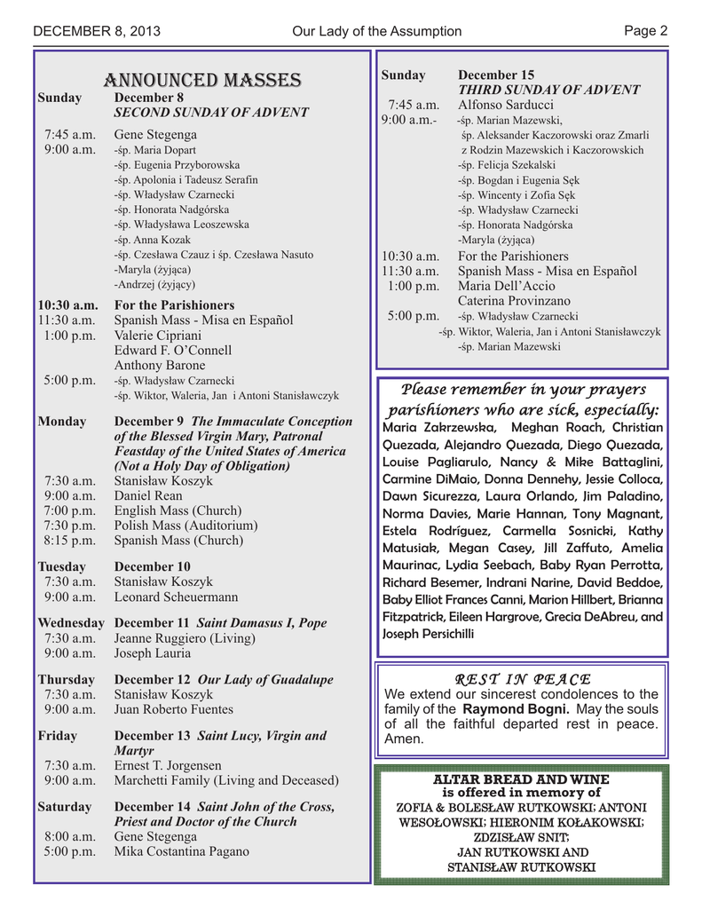 DECEMBER 8, 2013 Sunday 7:45 a.m. 9:00 a.m. 10:30 a.m. 11:30 a.m. 1:00 p.m. 5:00 p.m. Monday 7:30 a.m. 9:00 a.m. 7:00 p.m. 7:30 p.m. 8:15 p.m. Tuesday 7:30 a.m. 9:00 a.m. Our Lady of the Assumption ANNOUNCED MASSES December 8 SECOND SUNDAY OF ADVENT Gene Stegenga -śp. Maria Dopart -śp. Eugenia Przyborowska -śp. Apolonia i Tadeusz Serafin -śp. Władysław Czarnecki -śp. Honorata Nadgórska -śp. Władysława Leoszewska -śp. Anna Kozak -śp. Czesława Czauz i śp. Czesława Nasuto -Maryla (żyjąca) -Andrzej (żyjący) For the Parishioners Spanish Mass - Misa en Español Valerie Cipriani Edward F. O’Connell Anthony Barone -śp. Władysław Czarnecki -śp. Wiktor, Waleria, Jan i Antoni Stanisławczyk December 9 The Immaculate Conception of the Blessed Virgin Mary, Patronal Feastday of the United States of America (Not a Holy Day of Obligation) Stanisław Koszyk Daniel Rean English Mass (Church) Polish Mass (Auditorium) Spanish Mass (Church) December 10 Stanisław Koszyk Leonard Scheuermann Wednesday December 11 Saint Damasus I, Pope 7:30 a.m. Jeanne Ruggiero (Living) 9:00 a.m. Joseph Lauria Thursday 7:30 a.m. 9:00 a.m. Friday 7:30 a.m. 9:00 a.m. Saturday 8:00 a.m. 5:00 p.m. December 12 Our Lady of Guadalupe Stanisław Koszyk Juan Roberto Fuentes December 13 Saint Lucy, Virgin and Martyr Ernest T. Jorgensen Marchetti Family (Living and Deceased) December 14 Saint John of the Cross, Priest and Doctor of the Church Gene Stegenga Mika Costantina Pagano Sunday 7:45 a.m. 9:00 a.m.- 10:30 a.m. 11:30 a.m. 1:00 p.m. 5:00 p.m. Page 2 December 15 THIRD SUNDAY OF ADVENT Alfonso Sarducci -śp. Marian Mazewski, śp. Aleksander Kaczorowski oraz Zmarli z Rodzin Mazewskich i Kaczorowskich -śp. Felicja Szekalski -śp. Bogdan i Eugenia Sęk -śp. Wincenty i Zofia Sęk -śp. Władysław Czarnecki -śp. Honorata Nadgórska -Maryla (żyjąca) For the Parishioners Spanish Mass - Misa en Español Maria Dell’Accio Caterina Provinzano -śp. Władysław Czarnecki -śp. Wiktor, Waleria, Jan i Antoni Stanisławczyk -śp. Marian Mazewski Please remember in your prayers parishioners who are sick, especially: Maria Zakrzewska, Meghan Roach, Christian Quezada, Alejandro Quezada, Diego Quezada, Louise Pagliarulo, Nancy & Mike Battaglini, Carmine DiMaio, Donna Dennehy, Jessie Colloca, Dawn Sicurezza, Laura Orlando, Jim Paladino, Norma Davies, Marie Hannan, Tony Magnant, Estela Rodríguez, Carmella Sosnicki, Kathy Matusiak, Megan Casey, Jill Zaffuto, Amelia Maurinac, Lydia Seebach, Baby Ryan Perrotta, Richard Besemer, Indrani Narine, David Beddoe, Baby Elliot Frances Canni, Marion Hillbert, Brianna Fitzpatrick, Eileen Hargrove, Grecia DeAbreu, and Joseph Persichilli REST IN PEACE We extend our sincerest condolences to the family of the Raymond Bogni. May the souls of all the faithful departed rest in peace. Amen. ALTAR BREAD AND WINE is offered in memory of ZOFIA & BOLESŁAW RUTKOWSKI; ANTONI WESOŁOWSKI; HIERONIM KOŁAKOWSKI; ZDZISŁAW SNIT; JAN RUTKOWSKI AND STANISŁAW RUTKOWSKI DECEMBER 8, 2013 ADVENT Our Lady of the Assumption Page 3 ADORATION OF THE BLESSED SACRAMENT On Wednesdays of Advent we are going to have an exposition and adoration of the Blessed Sacrament from 4:30pm to 8pm. We know it is a very busy time of the year when everybody is rushing while shopping, preparing gifts and goodies for Christmas. We are so preoccupied that we tend to forget what this is all about – the Birth of our Savior Jesus Christ. We invite you to prepare your souls through prayer and acts of charity. Without Jesus everything is fluff. Silence and prayer in front of the Blessed Sacrament is the best opportunity to prepare ourselves spiritually for the upcoming Christmas. NATIONAL NIGHT OF PRAYER FOR LIFE Thank you to all who signed up for this weekend's (December 8th/9th) National Night Of Prayer For Life. If you did not get the opportunity to sign-up in advance, we would love to have you join your fellow parishioners for any time that is suitble for you. Please take some time to sit in the presence of the Lord as we pray in unity with other Parishes that our Nation may restore the freedom necessary to defend Life and Faith. Pray For those Serving in the Military Staff Sgt. Christopher Dunscomb Sgt. Eduardo Sime Sgt. Andrew Barrett God of Mercy, we beg You now to protect in a special way, those who are defending us and the Country we love. Bless them and take care of them. Amen Knights of Columbus, Council #9267 Regular Meeting: Monday, December 9th, at 8:00PM, in the Outreach Meeting Room. The Immaculate Conception of the Blessed Virgin Mary Monday, December 9th 7:00 p.m. English (Church) 7:30 p.m. Polish (Auditorium) 8:15 p.m. Spanish (Church) Our Lady of Guadalupe Thursday, December 12th 7:00 p.m. Spanish Mass (Auditorium) CHRISTMAS SCHEDULE 2013 CONFESSIONS Sunday, December 22nd 4:00-6:00 p.m. Auditorium/All 7:00-8:30 p.m. Auditorium/All MASSES Christmas Eve 5:00 p.m. English (Auditorium) 8:00 pm Spanish (Auditorium) 10:30 p.m. English (Church) Midnight - Polish (Auditorium) Christmas Day 7:45 a.m. English (Church) 9:00 a.m. Polish (Auditorium) 10:30 a.m. English (Church) 11:30 a.m. Spanish (Auditorium) 1:00 p.m. English (Church) No Masses in the evening New Year’s Eve 5:00 p.m. English Mass (Church) New Year’s Day 7:45 a.m. NO MASS 9:00 a.m. Polish (Auditorium) 10:30 a.m. English (Church) 11:30 a.m. Spanish (Auditorium) 1:00 p.m. English (Church) 5:00 p.m. Polish Mass (Church) FAMILY MASS - December 15, 2013 10:30AM - Church Please join us! DECEMBER 8, 2013 Our Lady of the Assumption I know that somewhere in Webster’s Dictionary there is a word that I want but I cannot find it. I have checked out “terrific, “great”, “awesome”, “phenomenal”...well, you get the idea. Not one of these words came near defining the people of our parish. Our good friend, Super Storm Sandy, could not have cleared the giving trees in the Church and the Auditorium as quickly as the parishioners of OLA. You managed the job in 