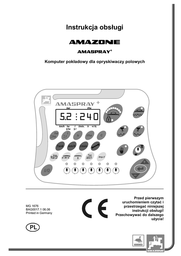 Instrukcja obsługi az AMASPRAY+ Komputer pokładowy dla opryskiwaczy polowych MG 1676 BAG0017.1 06.06 Printed in Germany Przed pierwszym uruchomieniem czytać i przestrzegać niniejszej instrukcji obsługi! Przechowywać do dalszego użycia! NIE MOŻNA Czytać instrukcji obsługi nieuważnie i pobieżnie a potem się tym kierować; nie wystarczy od innych słyszeć, że maszyna jest dobra i na tym polegać przy zakupie oraz wierzyć, że teraz wszystko stanie się samo. Użytkownik doprowadzi wtedy do szkód nie tylko dla siebie samego, lecz także do powstania usterki, której przyczynę zrzuci na maszynę zamiast na siebie. Aby być pewnym sukcesu, należy wniknąć w sedno rzeczy względnie zapoznać się z przeznaczeniem każdego z zespołów maszyny i posługiwaniem się nim. Dopiero wtedy można być zadowolonym z siebie i z maszyny. Celem niniejszej instrukcji jest tego osiągnięcie. Leipzig-Plagwitz 1872. 2 AMASPRAY+ BAG0017.1 06.06 Dane identyfikacyjne Dane identyfikacyjne Producent: AMAZONEN-WERKE H. DREYER GmbH & Co. KG Nr. identyfikacyjny maszyny.: Typ: AMASPRAY+ Producent-adres AMAZONEN-WERKE H. DREYER GmbH & Co. KG Postfach 51 D-49202 Hasbergen Tel.: + 49 (0) 5405 50 1-0 Fax.: + 49 (0) 5405 501-234 E-mail: [email protected] Zamawianie części zamiennych AMAZONEN-WERKE H. DREYER GmbH & Co. KG Postfach 51 D-49202 Hasbergen Tel.: + 49 (0) 5405 501-290 Fax.: + 49 (0) 5405 501-106 E-mail: [email protected] Katalog części zamiennych - online: www.amazone.de Przy zamawianiu części zamiennych prosimy zawsze podawać numer swojej maszyny. Formalności dotyczące instrukcji obsługi Numer dokumentu: MG 1676 Data produkcji: 06.06 © Copyright AMAZONEN-WERKE H. DREYER GmbH & Co. KG, 2004 Wszystkie prawa zastrzeżone. Przedruk i sporządzanie wyciągów tylko za pisemnym zezwoleniem AMAZONEN-WERKE H. DREYER GmbH & Co. KG. AMASPRAY+ BAG0017.1 06.06 3 Przedmowa Przedmowa Szanowni Klienci, Zdecydowali się Państwo na nasz wysokiej jakości produkt z bogatej palety wyrobów AMAZONEN-WERKE, H. DREYER GmbH & Co. KG. Dziękujemy za pokładane w nas zaufanie. Przy otrzymaniu maszyny prosimy ustalić, czy nie wystąpiły uszkodzenia w transporcie i czy nie ma braków części! Prosimy sprawdzić kompletację dostarczonej maszyny włącznie z zamówionym wyposażeniem specjalnym. Tylko natychmiastowa reklamacja prowadzi do likwidacji szkód! Przed pierwszym uruchomieniem maszyny prosimy przeczytać niniejszą instrukcję obsługi, a szczególnie informacje dotyczące bezpieczeństwa. Po starannym przeczytaniu mogą Państwo w pełni wykorzystać zalety swojej nowo zakupionej maszyny. Prosimy zatroszczyć się o to, by wszystkie osoby obsługujące maszynę przeczytały niniejszą instrukcję obsługi przed jej uruchomieniem. Przy ewentualnych pytaniach lub problemach, prosimy czytać instrukcję obsługi lub po prostu do nas zadzwonić Regularne przeglądy i konserwacje oraz terminowa wymiana części zużytych lub uszkodzonych podnosi trwałość Państwa maszyny. Ocena użytkownika Szanowne panie, szanowni panowie, nasze instrukcje obsługi są regularnie aktualizowane. Dzięki propozycjom ich poprawy pomogą Państwo stworzyć instrukcję bardziej przyjazną użytkownikowi. Prosimy nadsyłać nam Państwa propozycje przez fax. AMAZONEN-WERKE H. DREYER GmbH & Co. KG Postfach 51 D-49202 Hasbergen 4 Tel.: + 49 (0) 5405 50 1-0 Fax.: + 49 (0) 5405 501-234 E-mail: [email protected] AMASPRAY+ BAG0017.1 06.06 Spis treści 1 Wskazówki dla użytkownika .......................................................................6 1.1 1.2 1.3 Przeznaczenie dokumentów................................................................................................6 Podawanie kierunków w instrukcji obsługi ...........................................................................6 Stosowane opisy .................................................................................................................6 2 Ogólne wskazówki dotyczące bezpieczeństwa.........................................7 2.1 2.2 2.3 2.4 2.4.1 Obowiązki i odpowiedzialność .............................................................................................7 Przedstawienie symboli bezpieczeństwa .............................................................................7 Czynności organizacyjne.....................................................................................................8 Wskazówki dotyczące bezpieczeństwa użytkownika............................................................8 Instalacja elektryczna..........................................................................................................8 3 Opis produktu ..............................................................................................9 3.1 3.2 3.3 Przegląd zespołów ..............................................................................................................9 Zastosowanie zgodne z przeznaczeniem .......................................................................... 10 Deklaracja zgodności ........................................................................................................ 10 4 Budowa i funkcje........................................................................................11 4.1 4.2 4.3 4.4 4.5 Funkcje............................................................................................................................. 11 Wyświetlacz ...................................................................................................................... 11 Opis włączników ............................................................................................................... 12 Opis wskaźników............................................................................................................... 12 Opis przycisków ................................................................................................................13 5 Uru
