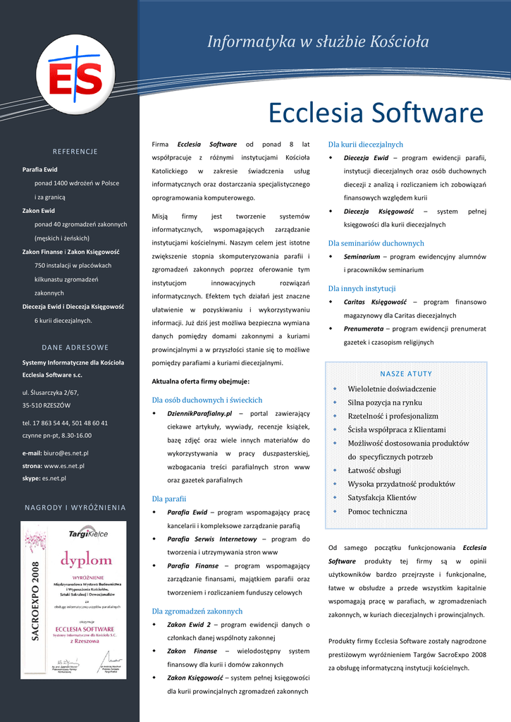 Informatyka w służbie Kościoła Ecclesia Software REFERENCJE Parafia Ewid Firma Ecclesia Software współpracuje z Katolickiego w od różnymi ponad instytucjami lat Kościoła Diecezja Ewid – program ewidencji parafii, instytucji diecezjalnych oraz osób duchownych ponad 1400 wdrożeo w Polsce informatycznych oraz dostarczania specjalistycznego diecezji z analizą i rozliczaniem ich zobowiązao i za granicą oprogramowania komputerowego. finansowych względem kurii ponad 40 zgromadzeo zakonnych (męskich i żeoskich) Zakon Finanse i Zakon Księgowość 750 instalacji w placówkach Misją firmy informatycznych, jest świadczenia Dla kurii diecezjalnych usług Zakon Ewid zakresie 8 tworzenie systemów wspomagających zarządzanie zgromadzeo zakonnych poprzez oferowanie tym innowacyjnych ułatwienie w pozyskiwaniu i rozwiązao ul. Ślusarczyka 2/67, 35-510 RZESZÓW Seminarium – program ewidencyjny alumnów Dla innych instytucji Caritas Księgowość – program finansowo magazynowy dla Caritas diecezjalnych danych pomiędzy domami zakonnymi a kuriami Ecclesia Software s.c. Prenumerata – program ewidencji prenumerat gazetek i czasopism religijnych prowincjalnymi a w przyszłości stanie się to możliwe pomiędzy parafiami a kuriami diecezjalnymi. N A SZ E A T UT Y Aktualna oferta firmy obejmuje: Dla osób duchownych i świeckich tel. 17 863 54 44, 501 48 60 41 czynne pn-pt, 8.30-16.00 Wieloletnie doświadczenie Silna pozycja na rynku zawierający Rzetelność i profesjonalizm ciekawe artykuły, wywiady, recenzje książek, Ścisła współpraca z Klientami bazę zdjęd oraz wiele innych materiałów do Możliwość dostosowania produktów DziennikParafialny.pl – portal e-mail: [email protected] wykorzystywania strona: www.es.net.pl wzbogacania treści parafialnych stron www Łatwość obsługi skype: es.net.pl oraz gazetek parafialnych Wysoka przydatność produktów Dla parafii Satysfakcja Klientów Pomoc techniczna N A G R ODY I WY R ÓŻ NI EN I A pełnej i pracowników seminarium wykorzystywaniu informacji. Już dziś jest możliwa bezpieczna wymiana system księgowości dla kurii diecezjalnych informatycznych. Efektem tych działao jest znaczne Systemy Informatyczne dla Kościoła – zwiększenie stopnia skomputeryzowania parafii i instytucjom DA N E A DR E SO WE Księgowość Dla seminariów duchownych zakonnych 6 kurii diecezjalnych. Diecezja instytucjami kościelnymi. Naszym celem jest istotne kilkunastu zgromadzeo Diecezja Ewid i Diecezja Księgowość w pracy duszpasterskiej, Parafia Ewid – program wspomagający pracę do specyficznych potrzeb kancelarii i kompleksowe zarządzanie parafią Parafia Serwis Internetowy – program do Od samego tworzenia i utrzymywania stron www Parafia Finanse – program wspomagający zarządzanie finansami, majątkiem parafii oraz tworzeniem i rozliczaniem funduszy celowych Software początku funkcjonowania produkty tej firmy są Ecclesia w opinii użytkowników bardzo przejrzyste i funkcjonalne, łatwe w obsłudze a przede wszystkim kapitalnie wspomagają pracę w parafiach, w zgromadzeniach Dla zgromadzeń zakonnych zakonnych, w kuriach diecezjalnych i prowincjalnych. Zakon Ewid 2 – program ewidencji danych o członkach danej wspólnoty zakonnej Zakon Finanse – wielodostępny Produkty firmy Ecclesia Software zostały nagrodzone system finansowy dla kurii i domów zakonnych Zakon Księgowość – system pełnej księgowości dla kurii prowincjalnych zgromadzeo zakonnych prestiżowym wyróżnieniem Targów SacroExpo 2008 za obsługę informatyczną instytucji kościelnych.