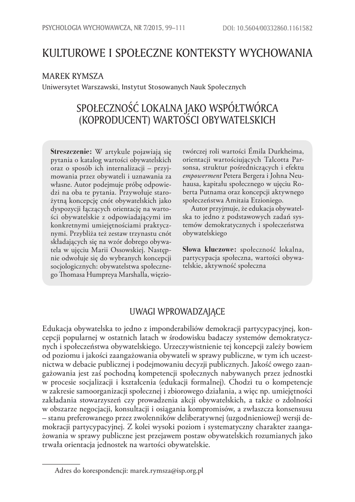 PSYCHOLOGIA WYCHOWAWCZA, NR 7/2015, 7/2015 99–111 DOI: 10.5604/00332860.1161582 KULTUROWE I SPOŁECZNE KONTEKSTY WYCHOWANIA MAREK RYMSZA Uniwersytet Warszawski, Instytut Stosowanych Nauk Społecznych SPOŁECZNOŚĆ LOKALNA JAKO WSPÓŁTWÓRCA (KOPRODUCENT) WARTOŚCI OBYWATELSKICH Streszczenie: W artykule pojawiają się pytania o katalog wartości obywatelskich oraz o sposób ich internalizacji – przyjmowania przez obywateli i uznawania za własne. Autor podejmuje próbę odpowiedzi na oba te pytania. Przywołuje starożytną koncepcję cnót obywatelskich jako dyspozycji łączących orientację na wartości obywatelskie z odpowiadającymi im konkretnymi umiejętnościami praktycznymi. Przybliża też zestaw trzynastu cnót składających się na wzór dobrego obywatela w ujęciu Marii Ossowskiej. Następnie odwołuje się do wybranych koncepcji socjologicznych: obywatelstwa społecznego Thomasa Humpreya Marshalla, więzio- twórczej roli wartości Émila Durkheima, orientacji wartościujących Talcotta Parsonsa, struktur pośredniczących i efektu empowerment Petera Bergera i Johna Neuhausa, kapitału społecznego w ujęciu Roberta Putnama oraz koncepcji aktywnego społeczeństwa Amitaia Etzioniego. Autor przyjmuje, że edukacja obywatelska to jedno z podstawowych zadań systemów demokratycznych i społeczeństwa obywatelskiego Słowa kluczowe: społeczność lokalna, partycypacja społeczna, wartości obywatelskie, aktywność społeczna UWAGI WPROWADZAJĄCE Edukacja obywatelska to jedno z imponderabiliów demokracji partycypacyjnej, koncepcji popularnej w ostatnich latach w środowisku badaczy systemów demokratycznych i społeczeństwa obywatelskiego. Urzeczywistnienie tej koncepcji zależy bowiem od poziomu i jakości zaangażowania obywateli w sprawy publiczne, w tym ich uczestnictwa w debacie publicznej i podejmowaniu decyzji publicznych. Jakość owego zaangażowania jest zaś pochodną kompetencji społecznych nabywanych przez jednostki w procesie socjalizacji i kształcenia (edukacji formalnej). Chodzi tu o kompetencje w zakresie samoorganizacji społecznej i zbiorowego działania, a więc np. umiejętności zakładania stowarzyszeń czy prowadzenia akcji obywatelskich, a także o zdolności w obszarze negocjacji, konsultacji i osiągania kompromisów, a zwłaszcza konsensusu – stanu preferowanego przez zwolenników deliberatywnej (uzgodnieniowej) wersji demokracji partycypacyjnej. Z kolei wysoki poziom i systematyczny charakter zaangażowania w sprawy publiczne jest przejawem postaw obywatelskich rozumianych jako trwała orientacja jednostek na wartości obywatelskie. AAdres do korespondencji: [email protected] Psychologia wychowawcza, nr 7/2015, 99–111 100 MAREK RYMSZA Pojawiają się tu pytania: (1) o katalog wartości obywatelskich oraz (2) o sposób ich internalizacji – przyjmowania przez obywateli i uznawania za własne. W prezentowanym opracowaniu podejmę próbę odpowiedzi na oba te pytania. W tym celu przywołam sięgającą do dorobku greckiej i rzymskiej filozofii koncepcję cnót obywatelskich jako dyspozycji łączących orientację na wartości obywatelskie z odpowiadającymi im konkretnymi umiejętnościami praktycznymi; przybliżę zestaw trzynastu takich cnót składających się na wzór dobrego obywatela w ujęciu Marii Ossowskiej. Następnie odwołam się do wybranych koncepcji socjologicznych: obywatelstwa społecznego Thomasa Humpreya Marshalla, więziotwórczej roli wartości Émila Durkheima, orientacji wartościujących Talcotta Parsonsa, struktur pośredniczących i efektu empowerment 1) Petera Bergera i Johna Neuhausa, kapitału społecznego w ujęciu Roberta Putnama oraz koncepcji aktywnego społeczeństwa Amitaia Etzioniego. W końcowej części tekstu przedstawię pięć prospołecznych dyspozycji, które stanowią aksjonormatywną podstawę modelu organizowania społeczności lokalnych (OSL). OSL to szeroko stosowna obecnie w praktyce społecznej (od kilku lat także w Polsce) metoda pracy środowiskowej ukierunkowana na wzmacnianie potencjału społeczności lokalnych poprzez zwiększanie kompetencji społecznych i obywatelskich mieszkańców oraz animowanie działań wspólnotowych (por. Twelvetrees, 2014; Mendel, Skrzypczak, 2014). W metodyce OSL odnajdujemy elementy wszystkich przywołanych wcześniej koncepcji socjologicznych. Wspomniane zestawienie dyspozycji prospołecznych można uznać za „empowermentową” orientację wartościującą. Społeczność lokalna i funkcjonujące w jej ramach struktury pośredniczące (mediating structures) mają „moc” uspołeczniania jednostek i są (a przynajmniej mogą być) kuźniami obywatelskości. Same zaś wartości obywatelskie, współtworząc kapitał społeczny lokalnych wspólnot, są zarówno produktami zaangażowania społecznego mieszkańców, jak i zasobem umożliwiającym funkcjonowanie aktywnych, responsywnych2) społeczności. Główna teza artykułu brzmi następująco: istnieje bezpośredni związek między uspołecznieniem i obywatelskością, który przejawia się w tym, że rezultatem procesu uspołecznienia zachodzącego dzięki funkcjonującym na poziomie lokalnym strukturom pośredniczącym jest obywatelstwo społeczne. Tym samym społeczności lokalne są współtwórcami (koproducentami) wartości obywatelskich. Wśród badaczy demokracji istnieje obecnie tendencja do odróżniania tego, co obywatelskie, od tego, co społeczne. Odróżnia się więc aktywność obywatelską, określaną chętnie jako partycypacja publiczna, od aktywności społecznej, sprowadzanej do zaangażowania wolontariackiego czy pracy społecznej. Rozróżnia się sferę publiczną, niejako z założenia administrowaną przez państwo, oraz sferę społeczną, animowaną i zarządzaną przez siły społeczne. Perspektywa przyjmowana w tym opracowaniu jest odmienna. Za Peterem Bergerem i Johnem Neuhausem (1990) przyjmuję, że społeczność lokalna i funkcjonujące w jej ramach struktur