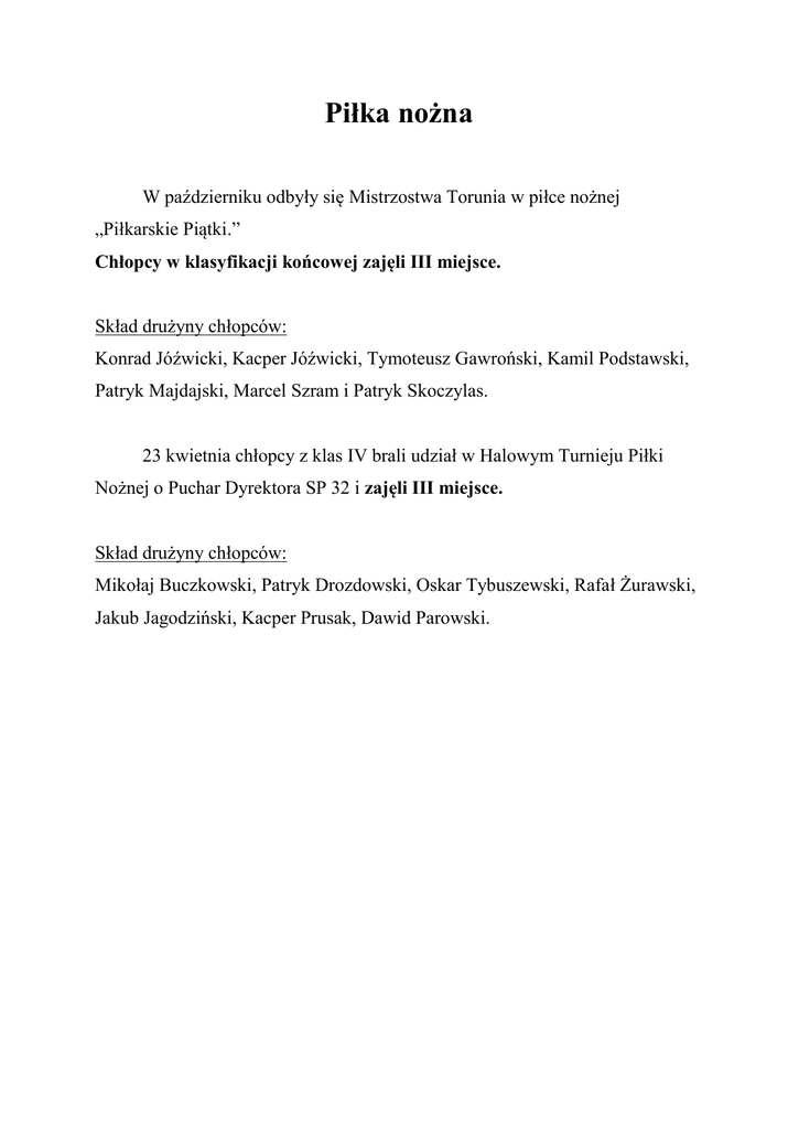 Piłka nożna W październiku odbyły się Mistrzostwa Torunia w piłce nożnej „Piłkarskie Piątki.” Chłopcy w klasyfikacji końcowej zajęli III miejsce. Skład drużyny chłopców: Konrad Jóźwicki, Kacper Jóźwicki, Tymoteusz Gawroński, Kamil Podstawski, Patryk Majdajski, Marcel Szram i Patryk Skoczylas. 23 kwietnia chłopcy z klas IV brali udział w Halowym Turnieju Piłki Nożnej o Puchar Dyrektora SP 32 i zajęli III miejsce. Skład drużyny chłopców: Mikołaj Buczkowski, Patryk Drozdowski, Oskar Tybuszewski, Rafał Żurawski, Jakub Jagodziński, Kacper Prusak, Dawid Parowski.