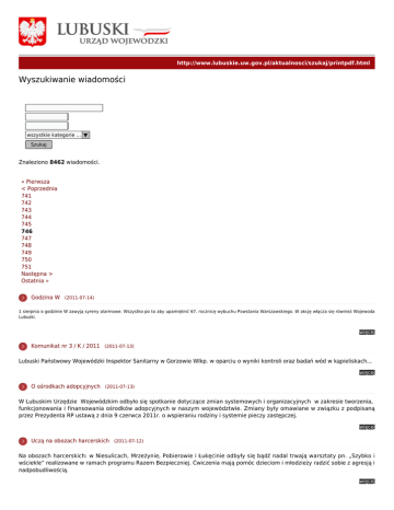http://www.lubuskie.uw.gov.pl/aktualnosci/szukaj/printpdf.html Wyszukiwanie wiadomości wszystkie kategorie ... ▼ Szukaj Znaleziono 8462 wiadomości. « Pierwsza < Poprzednia 741 742 743 744 745 746 747 748 749 750 751 Następna > Ostatnia » Godzina W (2011-07-14) 1 sierpnia o godzinie W zawyją syreny alarmowe. Wszystko po to aby upamiętnić 67. rocznicę wybuchu Powstania Warszawskiego. W akcję włącza się również Wojewoda Lubuski. więcej Komunikat nr 3 / K / 2011 (2011-07-13) Lubuski Państwowy Wojewódzki Inspektor Sanitarny w Gorzowie Wlkp. w oparciu o wyniki kontroli oraz badań wód w kąpieliskach... więcej O ośrodkach adopcyjnych (2011-07-13) W Lubuskim Urzędzie Wojewódzkim odbyło się spotkanie dotyczące zmian systemowych i organizacyjnych w zakresie tworzenia, funkcjonowania i finansowania ośrodków adopcyjnych w naszym województwie. Zmiany były omawiane w związku z podpisaną przez Prezydenta RP ustawą z dnia 9 czerwca 2011r. o wspieraniu rodziny i systemie pieczy zastępczej. więcej Uczą na obozach harcerskich (2011-07-12) Na obozach harcerskich: w Niesulicach, Mrzeżynie, Pobierowie i Łukęcinie odbyły się bądź nadal trwają warsztaty pn. „Szybko i wściekle” realizowane w ramach programu Razem Bezpieczniej. Ćwiczenia mają pomóc dzieciom i młodzieży radzić sobie z agresją i nadpobudliwością. więcej Kajakowy Patrol (2011-07-12) Pod patronatem Heleny Hatki rusza Kajakowy Patrol św. Franciszka. Lubuszanie mogą włączyć się w akcję poprzez udział w wodnych warsztatach edukacji ekologicznej. więcej Razem bezpieczniej w wakacje (2011-07-12) Wojewoda Helena Hatka w tym roku podpisała w sumie 22 umowy z lokalnymi stowarzyszeniami na realizację zadań publicznych w ramach rządowego programu „Razem Bezpieczniej”. Wśród organizacji, które otrzymały dotację Wojewody, są takie, które promują wśród dzieci i młodzieży bezpieczeństwo i wolność od używek właśnie w okresie wakacyjnym. więcej Poszukują ekspertów (2011-07-11) Masz doświadczenie w administracji publicznej, służbie zdrowia lub edukacji? Znasz się na ekonomii czy jesteś prawnikiem? Możesz zostać ekspertem cywilnym w Afganistanie. więcej Korsak w Gorzowie (2011-07-11) W Gorzowie powstanie pomnik Włodzimierza Korsaka. Funkcje Honorowego Przewodniczącego Komitetu budowy monumentu powierzono Janowi Świrepo wicewojewodzie lubuskiemu. więcej Jak dobrze współpracować? (2011-07-08) Jak przyjąć zagranicznych gości? Skąd czerpać wiedzę na temat protokołu dyplomatycznego i z kim konsultować decyzje? Na te pytania odpowiadali eksperci z Ministerstwa Spraw Zagranicznych podczas spotkania, w którym uczestniczył Jan Świrepo. więcej Konwent Wojewodów (2011-07-08) W Warszawie odbył się konwent wojewodów, z udziałem Jana Świrepo. Na spotkaniu został zaprezentowany Informatyczny System Osłony Kraju przed nadzwyczajnymi zagrożeniami oraz zostały poruszone kwestie związane z Systemem Ratownictwa Medycznego i Powiadamiania Ratunkowego. Ponadto został przedstawiony projekt ustawy o szczególnych rozwiązaniach, związanych z usuwaniem skutków powodzi. więcej « Pierwsza < Poprzednia 741 742 743 744 745 746 747 748 749 750 751 Następna > Ostatnia »