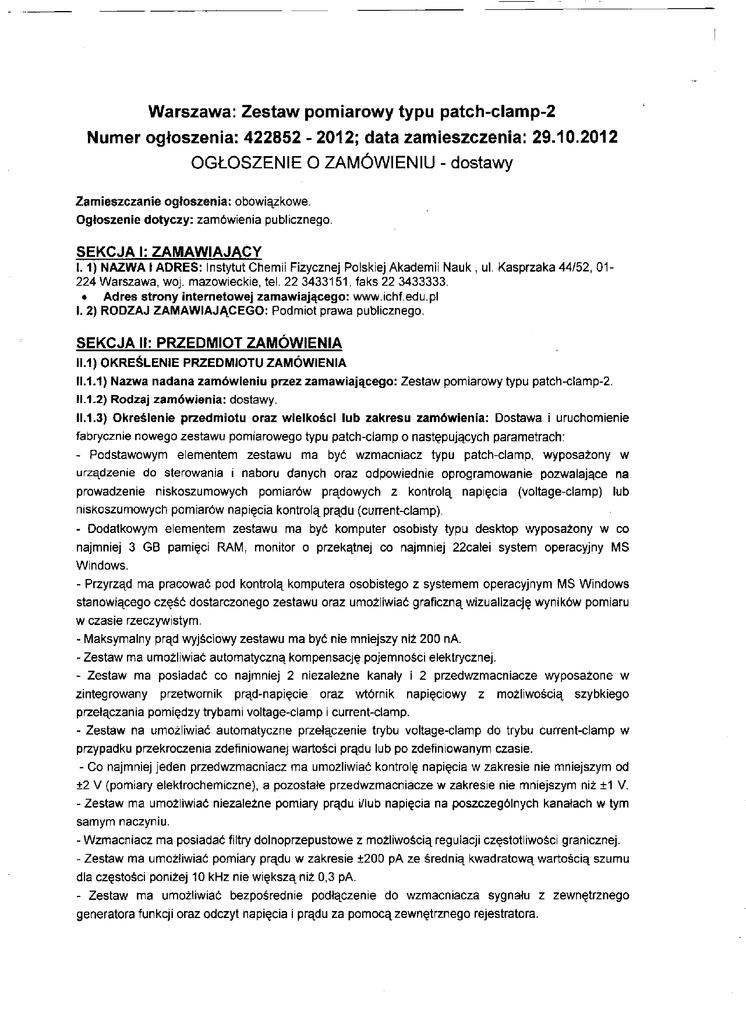 Warszawa: Zestaw pomiarowy typu patch-clamp-2 Numer ogłoszenia: 422852 - 2012; data zamieszczenia: 29.10.2012 OGŁOSZENIE O ZAMÓWIENIU - dostawy Zamieszczanie ogłoszenia: obowiązkowe. Ogłoszenie dotyczy: zamówienia publicznego. SEKCJA I: ZAMAWIAJĄCY 1.1) NAZWA I ADRES: Instytut Chemii Fizycznej Polskiej Akademii Nauk , ul. Kasprzaka 44/52, 01224 Warszawa, woj. mazowieckie, tel. 22 3433151, faks 22 3433333. • Adres strony internetowej zamawiającego: www.ichf.edu.pl I. 2) RODZAJ ZAIMAWIAJĄCEGO: Podmiot prawa publicznego. SEKCJA II: PRZEDMIOT ZAMÓWIENIA II. 1) OKREŚLENIE PRZEDMIOTU ZAMÓWIENIA 11.1.1) Nazwa nadana zamówieniu przez zamawiającego: Zestaw pomiarowy typu patch-clamp-2. IL1.2) Rodzaj zamówienia: dostawy. 11.1.3) Określenie przedmiotu oraz wielkości lub zakresu zamówienia: Dostawa i uruchomienie fabrycznie nowego zestawu pomiarowego typu patch-clamp o następujących parametrach: - Podstawowym elementem zestawu ma być wzmacniacz typu patch-clamp, wyposażony w urządzenie do sterowania i naboru danych oraz odpowiednie oprogramowanie pozwalające na prowadzenie niskoszumowych pomiarów prądowych z kontrolą napięcia (voltage-clamp) lub niskoszumowych pomiarów napięcia kontrolą prądu (current-clamp). - Dodatkowym elementem zestawu ma być komputer osobisty typu desktop wyposażony w co najmniej 3 GB pamięci RAM, monitor o przekątnej co najmniej 22calei system operacyjny MS Windows. - Przyrząd ma pracować pod kontrolą komputera osobistego z systemem operacyjnym MS Windows stanowiącego część dostarczonego zestawu oraz umożliwiać graficzną wizualizację wyników pomiaru w czasie rzeczywistym. - Maksymalny prąd wyjściowy zestawu ma być nie mniejszy niż 200 nA. - Zestaw ma umożliwiać automatyczną kompensację pojemności elektrycznej. - Zestaw ma posiadać co najmniej 2 niezależne kanały i 2 przedwzmacniacze wyposażone w zintegrowany przetwornik prąd-napięcie oraz wtórnik napięciowy z możliwością szybkiego przełączania pomiędzy trybami voltage-clamp i current-clamp. - Zestaw na umożliwiać automatyczne przełączenie trybu voltage-clamp do trybu current-clamp w przypadku przekroczenia zdefiniowanej wartości prądu lub po zdefiniowanym czasie. - Co najmniej jeden przedwzmacniacz ma umożliwiać kontrolę napięcia w zakresie nie mniejszym od ±2 V (pomiary elektrochemiczne), a pozostałe przedwzmacniacze w zakresie nie mniejszym niż ±1 V. - Zestaw ma umożliwiać niezależne pomiary prądu i/lub napięcia na poszczególnych kanałach w tym samym naczyniu. - Wzmacniacz ma posiadać filtry dolnoprzepustowe z możliwością regulacji częstotliwości granicznej. - Zestaw ma umożliwiać pomiary prądu w zakresie ±200 pA ze średnią kwadratową wartością szumu dla częstości poniżej 10 kHz nie większą niż 0,3 pA. - Zestaw ma umożliwiać bezpośrednie podłączenie do wzmacniacza sygnału z zewnętrznego generatora funkcji oraz odczyt napięcia i prądu za pomocą zewnętrznego rejestratora. - Zestaw ma umożliwiać pomiary prądowe przy zmieniającym się skokowo w czasie napięciu oraz napięciu zmieniającym się liniowo w czasie w sposób charakterystyczny dla fali trójkątnej. - Zestaw ma umożliwiać szybkie próbkowanie, co najmniej co 10 ps (100 kHz).. 11.1.4) Czy przewiduje się udzielenie zamówień uzupełniających: nie. 11.1.5) Wspólny Słownilt Zamówień (CPV): 38.00.00.00-5. 11.1.6) Czy dopuszcza się złożenie oferty częściowej: nie. 11.1.7) Czy dopuszcza się złożenie oferty wariantowej: nie. II. 2) CZAS TRWANIA ZAMÓWIENIA LUB TERMIN WYKONANIA: Okres w miesiącach: 3. SEKCJA III: INFORMACJE O CHARAKTERZE PRAWNYM, EKONOMICZNYM. FINANSOWYM I TECHNICZNYM III. 1) WADIUM Informacja na temat wadium: wadium nie jest wymagane III.2) ZALICZKI • Czy przewiduje się udzielenie zaliczelc na poczet wykonania zamówienia: nie III.4) INFORMACJA O OŚWIADCZENIACH LUB DOKUMENTACH, JAKIE MAJĄ DOSTARCZYĆ WYKONAWCY W CELU POTWIERDZENIA SPEŁNIANIA WARUNKÓW UDZIAŁU W POSTĘPOWANIU ORAZ NIEPODLEGANIA WYKLUCZENIU NA PODSTAWIE ART. 24 UST. 1 USTAWY • III.4.1) W zakresie wykazania spełniania przez wykonawcę warunków, o których mowa w art. 22 ust. 1 ustawy, oprócz oświadczenia o spełnieniu warunków udziału w postępowaniu, należy przedłożyć: • III.4.2) W zakresie potwierdzenia niepodlegania wykluczeniu na podstawie art. 24 ust. 1 ustawy, należy przedłożyć: • oświadczenie o braku podstaw do wykluczenia • aktualny odpis z właściwego rejestru, jeżeli odrębne przepisy wymagają wpisu do rejestru, w celu wykazania braku podstaw do wykluczenia w oparciu o art. 24 ust. 1 pkt 2 ustawy, wystawiony nie wcześniej niż 6 miesięcy przed upływem terminu składania wniosków o dopuszczenie do udziału w postępowaniu o udzielenie zamówienia albo składania ofert, a w stosunku do osób fizycznych oświadczenie w zakresie art. 24 ust. 1 pkt 2 ustawy • III.4.3) Dokumenty podmiotów zagranicznych Jeżeli wykonawca ma siedzibę lub miejsce zamieszkania poza terytorium Rzeczypospolitej Polskiej, przedkłada: lil.4.3.1) dokument wystawiony w kraju, w którym ma siedzibę lub miejsce zamieszkania potwierdzający, że: • nie otwarto jego likwidacji ani nie ogłoszono upadłości - wystawiony nie wcześniej niż 6 miesięcy przed upływem terminu składania wniosków o dopuszczenie do udziału w postępowaniu o udzielenie zamówienia albo składania ofert 111.6) INNE DOKUMENTY Inne dokumenty niewymienione w pkt III.4) albo w pkt III.5) Dokładny opis techniczny oferowanego sprzętu wraz z podaniem parametrów i oferowanego modelu 111.7) Czy ogranicza się możliwość ubiegania się o zamówienie publiczne tylko dla wykonawców, u których ponad 50 % pracowników stanowią osoby niepełnosprawne: nie SEKCJA IV: PROCEDURA IV.1) TRYB UDZIELENIA ZAMÓWIENIA IV.1.1) Tryb udzielenia zamówienia: przetarg nieograniczony. IV.2) KRYTERIA OCENY OFERT IV.2.1) Kryteria oceny ofert: najniższa cena. IV.2.2) Czy prz