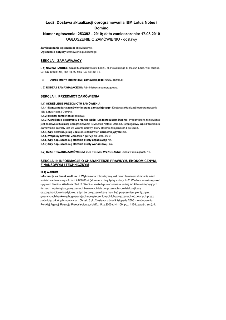 Łódź: Dostawa aktualizacji oprogramowania IBM Lotus Notes i Domino Numer ogłoszenia: 253392 - 2010; data zamieszczenia: 17.08.2010 OGŁOSZENIE O ZAMÓWIENIU - dostawy Zamieszczanie ogłoszenia: obowiązkowe. Ogłoszenie dotyczy: zamówienia publicznego. SEKCJA I: ZAMAWIAJĄCY I. 1) NAZWA I ADRES: Urząd Marszałkowski w Łodzi , al. Piłsudskiego 8, 90-051 Łódź, woj. łódzkie, tel. 042 663 33 90, 663 33 85, faks 042 663 33 91. • Adres strony internetowej zamawiającego: www.lodzkie.pl I. 2) RODZAJ ZAMAWIAJĄCEGO: Administracja samorządowa. SEKCJA II: PRZEDMIOT ZAMÓWIENIA II.1) OKREŚLENIE PRZEDMIOTU ZAMÓWIENIA II.1.1) Nazwa nadana zamówieniu przez zamawiającego: Dostawa aktualizacji oprogramowania IBM Lotus Notes i Domino. II.1.2) Rodzaj zamówienia: dostawy. II.1.3) Określenie przedmiotu oraz wielkości lub zakresu zamówienia: Przedmiotem zamówienia jest dostawa aktualizacji oprogramowania IBM Lotus Notes i Domino. Szczegółowy Opis Przedmiotu Zamówienia zawarty jest we wzorze umowy, który stanowi załącznik nr 4 do SIWZ. II.1.4) Czy przewiduje się udzielenie zamówień uzupełniających: nie. II.1.5) Wspólny Słownik Zamówień (CPV): 48.00.00.00-0. II.1.6) Czy dopuszcza się złożenie oferty częściowej: nie. II.1.7) Czy dopuszcza się złożenie oferty wariantowej: nie. II.2) CZAS TRWANIA ZAMÓWIENIA LUB TERMIN WYKONANIA: Okres w miesiącach: 12. SEKCJA III: INFORMACJE O CHARAKTERZE PRAWNYM, EKONOMICZNYM, FINANSOWYM I TECHNICZNYM III.1) WADIUM Informacja na temat wadium: 1. Wykonawca zobowiązany jest przed terminem składania ofert wnieść wadium w wysokości: 4.000,00 zł (słownie: cztery tysiące złotych) 2. Wadium wnosi się przed upływem terminu składania ofert. 3. Wadium może być wnoszone w jednej lub kilku następujących formach: w pieniądzu, poręczeniach bankowych lub poręczeniach spółdzielczej kasy oszczędnościowo-kredytowej, z tym że poręczenie kasy musi być poręczeniem pieniężnym, gwarancjach bankowych, gwarancjach ubezpieczeniowych lub poręczeniach udzielanych przez podmioty, o których mowa w art. 6b ust. 5 pkt 2 ustawy z dnia 9 listopada 2000 r. o utworzeniu Polskiej Agencji Rozwoju Przedsiębiorczości (Dz. U. z 2000 r. Nr 109, poz. 1158, z późn. zm.). 4. Wniesione wadium musi obejmować okres związania ofertą i nie może zawierać żadnych ograniczeń sprzecznych z Ustawą, w szczególności ograniczających możliwość zrealizowania przez Zamawiającego praw określonych w art. 46 ust. 5 oraz ust. 4a Ustawy. 5. Wpłaty pieniężne, winny być dokonane na rachunek bankowy Zamawiającego: Bank Pekao SA, XI Oddział w Łodzi Nr: 52 1240 3073 1111 0010 0269 1913 6. Potwierdzenie wniesienia wadium należy dołączyć do oferty. Wymagane jest dołączenie do oferty kserokopii dokumentu. Oryginał dokumentu wadium w formie niepieniężnej należy złożyć przed terminem składania ofert w Biurze Podawczym Urzędu Marszałkowskiego w Łodzi przy ul. Piłsudskiego 8 pok. 403. Dokument należy złożyć w zamkniętej kopercie z oznakowaniem Wadium w postępowaniu na: Dostawę aktualizacji oprogramowania IBM Lotus Notes i Domino. Wniesienie wadium w pieniądzu będzie skuteczne, jeżeli rachunek Zamawiającego zostanie uznany kwotą wadium przed terminem składania ofert. Wadium zostanie zwrócone zgodnie z postanowieniami art. 46 Ustawy III.2) ZALICZKI • Czy przewiduje się udzielenie zaliczek na poczet wykonania zamówienia: nie III.3) WARUNKI UDZIAŁU W POSTĘPOWANIU ORAZ OPIS SPOSOBU DOKONYWANIA OCENY SPEŁNIANIA TYCH WARUNKÓW • III. 3.1) Uprawnienia do wykonywania określonej działalności lub czynności, jeżeli przepisy prawa nakładają obowiązek ich posiadania Opis sposobu dokonywania oceny spełniania tego warunku Zamawiający odstępuje od opisu sposobu dokonywania oceny spełniania warunków o w tym zakresie. III.3.2) Wiedza i doświadczenie • Opis sposobu dokonywania oceny spełniania tego warunku Zamawiający odstępuje od opisu sposobu dokonywania oceny spełniania warunków o w tym zakresie. III.3.3) Potencjał techniczny • Opis sposobu dokonywania oceny spełniania tego warunku Zamawiający odstępuje od opisu sposobu dokonywania oceny spełniania warunków o w tym zakresie. III.3.4) Osoby zdolne do wykonania zamówienia • Opis sposobu dokonywania oceny spełniania tego warunku Zamawiający odstępuje od opisu sposobu dokonywania oceny spełniania warunków o w tym zakresie. III.3.5) Sytuacja ekonomiczna i finansowa • Opis sposobu dokonywania oceny spełniania tego warunku Zamawiający odstępuje od opisu sposobu dokonywania oceny spełniania warunków o w tym zakresie. III.4) INFORMACJA O OŚWIADCZENIACH LUB DOKUMENTACH, JAKIE MAJĄ DOSTARCZYĆ WYKONAWCY W CELU POTWIERDZENIA SPEŁNIANIA WARUNKÓW UDZIAŁU W POSTĘPOWANIU ORAZ NIEPODLEGANIA WYKLUCZENIU NA PODSTAWIE ART. 24 UST. 1 USTAWY • III.4.1) W zakresie wykazania spełniania przez wykonawcę warunków, o których mowa w art. 22 ust. 1 ustawy, oprócz oświadczenia o spełnieniu warunków udziału w postępowaniu, należy przedłożyć: • III.4.2) W zakresie potwierdzenia niepodlegania wykluczeniu na podstawie art. 24 ust. 1 ustawy, należy przedłożyć: • oświadczenie o braku podstaw do wykluczenia • aktualny odpis z właściwego rejestru, jeżeli odrębne przepisy wymagają wpisu do rejestru, w celu wykazania braku podstaw do wykluczenia w oparciu o art. 24 ust. 1 pkt 2 ustawy, wystawiony nie wcześniej niż 6 miesięcy przed upływem terminu składania wniosków o dopuszczenie do udziału w postępowaniu o udzielenie zamówienia albo składania ofert, a w stosunku do osób fizycznych oświadczenie w zakresie art. 24 ust. 1 pkt 2 ustawy • wykonawca powołujący się przy wykazywaniu spełniania warunków udziału w postępowaniu na potencjał innych podmiotów, które będą brały udział w realizacji części zamówienia, przedkłada także dokumenty dotyczące tego podmiotu w zakresie wymaganym dla wykonawcy, określonym w