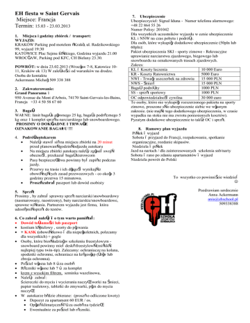 EH fiesta w Saint Gervais Miejsce: Francja Termin: 15.03 - 23.03.2013 1. Miejsca i godziny zbiórek / transport: WYJAZD: KRAKÓW Parking pod motelem “Krak”, ul. Radzikowskiego 99, wyjazd 19:30 KATOWICE Plac Sejmu Śląskiego, Godzina wyjazdu 21.00 WROCŁAW, Parking pod KFC, CH Bielany 23.30. POWRÓT: w dniu 23.02.2013 (Wrocław 7-8, Katowice 1011, Kraków ok 13) W zależności od warunków na drodze. Osoba do kontaktu Ackermann Michał 509 338 388 2. Zakwaterowanie: Grand Panorama 1 950 Avenue du Mont d'Arbois, 74170 Saint-Gervais-les-Bains, Francja +33 4 50 58 67 60 3. Bagaż WAŻNE: limit bagażu głównego 25 kg, bagażu podręcznego 5 kg oraz 1 komplet sprzętu narciarskiego lub snowboardowego. PROSIMY O DOKŁADNE I TRWAŁE OZNAKOWANIE BAGAŻU !!! 4. Podróż autokarem · Należy stawić się na miejscu zbiórki na 20 minut przed planowaną godziną odjazdu autokaru · Na miejscu zbiórki autokaru należy zgłosić swoją obecność, przekazać bagaż kierowcom · Pasy bezpieczeństwa powinny być zapięte podczas jazdy. · Przerwy na trasie i ich długość wynikają z obowiązujących zasad przewozowych - co około 3 godziny przerwa 15 minutowa. · Proszę zabrać paszport lub dowód osobisty 5. Sprzęt Prosimy , by zabrać sprawny sprzęt narciarski/snowboardowy (nasmarowany, naostrzony), buty narciarskie/snowboardowe, sprawne wiązania. Partnerem wyjazdu jest firma, która udostępnią sprzęt do testów. 6. Co zabrać należy – o tym warto pamiętać: · Dowód tożsamości lub paszport · kostium kąpielowy , szorty do pływania · + KASK (obowiązkowo – dla niepełnoletnich, polecamy dla wszystkich) + gogle · Osoby, które biorą udział w szkoleniu freestylowym snowboard powinny mieć deskę freestylową (miękką, najlepiej typu twin-tip). Zalecamy: ochraniacze na kolana, spodenki ochronne, ochraniacz na kręgosłup (żółw lub zbroja ochronna). · Pościel własna lub 8 € za osobę · Ręczniki własne lub 7 € za komplet · krem z wysokim filtrem, szminka wazelinowa, · Należy zabrać: Ściereczki do mycia i wycierania naczyń, worki na śmieci, papier toaletowy, tabletki do zmywarki, płyn do mycia naczyń. · W autokarze będzie zbierane: (proszę o odliczone kwoty) · Depozyt za apartament 60 EUR / os. · Opłatę klimatyczną 7€ za osobę na tydzień · Ewentualnie za pościel lub ręczniki. 7. Ubezpieczenie Ubezpieczyciel: Signal Iduna - Numer telefonu alarmowego: +48 22 864 55 26 Numer Polisy: 201042 Dla wszystkich uczestników wyjazdu w cenie ubezpieczenie KL i NNW na czas pobytu i podróży. Dla osób, które wykupiły dodatkowe ubezpieczenie (50pln lub 60pln): Pakiet ubezpieczenia SKI - sporty zimowe - Rekreacyjne uprawianie narciarstwa zjazdowego, biegowego lub snowboardu na oznakowanych trasach zjazdowych. Zakres: KL – Koszty leczenia 10 000 Euro KR - Koszty Ratownictwa 5000 Euro NWI - Trwały uszczerbek na zdrowiu 15 000 PLN NWS - śmierć 15 000 PLN Bagaż podróżny 1000 PLN SS - sprzęt sportowy 1000 PLN OC odpowiedzialność cywilna 30 000 euro Te osoby, które nie wykupiły rozszerzonego pakietu na sporty zimowe, proszone są o ubezpieczenie siebie we własnym zakresie. (nie mając tego dodatkowego ubezpieczenia, w czasie wypadku na stoku nie ma zwrotu poniesionych kosztów). Pyzatym dodatkowe ubezpieczenie to także OC i sprzęt. 8. Ramowy plan wyjazdu Piątek – wyjazd Sobota – przyjazd do Francji, rozpakowanie, spotkanie organizacyjne, rozdanie skipasów. Niedziela – piątek Jazd na nartach / dla zainteresowanych szkolenia snb/narty Sobota – rano po zdaniu apartamentów – wyjazd Niedziela powrót do Polski To wszystko co powinniście wiedzieć J Pozdrawiam serdecznie Anna Ackermann [email protected] 509338388