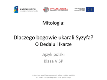 Mitologia: Dlaczego bogowie ukarali Syzyfa? O Dedalu i Ikarze Język polski Klasa V SP Projekt jest współfinansowany ze środków Unii Europejskiej w ramach Europejskiego Funduszu Społecznego Co to jest fascynacja? Fascynacja – urzekający wpływ czegoś, urok, oczarowanie, olśnienie Fascynacja życiem, sztuką, muzyką Co to jest brawura? Brawura – lekceważenie niebezpieczeństwa, skłonność do popisywania się (zwłaszcza odwagą), ryzykanctwo Brawurowa walka, brawurowa jazda ulicami miasta, brawurowy lot, natarcie Projekt jest współfinansowany ze środków Unii Europejskiej w ramach Europejskiego Funduszu Społecznego Kiedy i gdzie rozgrywają się wydarzenia przedstawione w micie o Dedalu i Ikarze? Określenie czasu akcji czasy starożytne, tj. przed naszą erą Miejsce akcji wyspa Kreta, wyspa Ikaria na Morzu Egejskim, Sycylia Bohaterowie: Dedal, Ikar Król Minos, jego syn Minotaur, żona króla - Pazyfae Projekt jest współfinansowany ze środków Unii Europejskiej w ramach Europejskiego Funduszu Społecznego Tytuł Morze Egejskie – morze we wschodniej części Morza Śródziemnego, położone między Półwyspem Bałkańskim, Azją Mniejszą a wyspami Kretą, Karpathos i Rodos Projekt jest współfinansowany ze środków Unii Europejskiej w ramach Europejskiego Funduszu Społecznego Plan ramowy Tytuł Plan szczegółowy Podane punkty ułóż w takiej kolejności, aby powstał poprawnie ułożony plan ramowy mitu. Dodaj podpunkty – otrzymasz plan szczegółowy. Tragedia Ikara. Panowanie króla Minosa na Krecie. Samotne życie Dedala. Narodziny nieszczęśliwego syna Minotaura. Marzenia Dedala o powrocie do ojczyzny. Lot ojca z synem. Przybycie Dedala na Kretę. Projekt jest współfinansowany ze środków Unii Europejskiej w ramach Europejskiego Funduszu Społecznego Opowiadamy mit o Dedalu i Ikarze. Tytuł Plan ramowy. 1.Panowanie króla Minosa na Krecie. 2.Narodziny Minotaura. 3.Przybycie Dedala na Kretę. 4.Umiejętności i wynalazki Ateńczyka. 5.Marzenia Dedala o powrocie do ojczyzny. 6.Lot ojca z synem. 7.Życie Dedala po śmierci syna. Projekt jest współfinansowany ze środków Unii Europejskiej w ramach Europejskiego Funduszu Społecznego - Przyjacielskie stosunki Minosa z sąsiadami. - Śmierć na polu walki. Dobierz podpunkty - Morska potęga Krety. do punktów planu - Wyprawa Minosa na Sycylię. - Zmartwienie Minosa. - Postanowienie ojca o zamknięciu syna. - Umiejętności rzeźbiarskie Dedala. - Budowa labiryntu dla Minotaura. - Wynalazki Dedala. - Przybycie na Sycylię. - Budowa warownego grodu. - Pochowanie Ikara. - Poszukiwanie ciała syna. - Śmiertelny upadek Ikara. - Wypadanie piór ze skrzydeł Ikara. - Topnienie wosku. - Nieprzestrzeganie przestróg ojca. - Brak pozwolenia króla na wyjazd. - Budowa dwu par skrzydeł. - Przestrogi ojca. - Ojciec przewodnikiem podniebnej wyprawy. - Minięcie wysp Samos, Paros i Delos. - Zdziwienie rybaka i pasterza. Projekt jest współfinansowany ze środków Unii Europejskiej Tytuł Tytuł Nazwij uczucia, które przeżywał Dedal po śmierci syna ................................................................................................ . Nazwij i wypisz uczucia, które Twoim zdaniem, mógł przeżywać Ikar, szybując w powietrzu ................................................................................................ .. Znajdź w tekście mitu zdanie, które wyjaśnia, co przeżywali ludzie, którzy zobaczyli lecącego Dedala z Ikarem Projekt jest współfinansowany ze środków Unii Europejskiej w ramach Europejskiego Funduszu Społecznego Tytuł Co sądzimy o Dedalu i Ikarze? Dedal Ikar Artysta – rzeźbiarz, wynalazca, np. świdra, poziomicy, człowiek sławny; doświadczony – wynalazł wiele pożytecznych rzeczy, prowadził budowę labiryntu. rozważny i rozumny- przechytrzył króla Minosa i obmyślił plan ucieczki; Pomysłowy – zbudował skrzydła; rozsądny – unikał niebezpieczeństw w czasie lotu i szczęśliwie dotarł do ojczyzny, dzielny i odważny- jako pierwszy z ludzi wzbił się w przestworza. Syn Dedala; lekkomyślny i nieposłuszny – nie posłuchał rad ojca; beztroski – zachwycił się potęgą wynalazku i pięknymi widokami; nierozważny- nie przewidział skutków nieposłuszeństwa; naiwny i niedoświadczony – przypłacił to życiem; odważny – bez lęku szybował ku słońcu Projekt jest współfinansowany ze środków Unii Europejskiej w ramach Europejskiego Funduszu Społecznego Tytuł Który z bohaterów mitu: - uosabia tęsknotę za ojczyzną ............................. - pragnie niezależności od innych i wolności ............................ - uosabia fascynacje człowieka tym, co nieznane ......................... - upaja się swobodą, lotem .................................... - jest marzycielem i ponosi klęskę ....................... - jest dalekowzroczny i rozsądny ........................... Projekt jest współfinansowany ze środków Unii Europejskiej w ramach Europejskiego Funduszu Społecznego Dlaczego Ikar mimo wszystko budzi naszą sympatię? Tytuł •Ikar uosabia fascynację człowieka tym, co nieznane. •Jest niepoprawnym marzycielem. •Cechuje go młodzieńcza fantazja. •Upaja się swobodą i lotem. Projekt jest współfinansowany ze środków Unii Europejskiej w ramach Europejskiego Funduszu Społecznego Dla ciekawych Tytuł Pierwszy labirynt był rozległą budowlą pełną poplątanych korytarzy, z których wyjść umiała tylko osoba wtajemniczona. Według mitologii greckiej taką budowlę wzniósł na polecenie króla Krety Minosa sycylijczyk Dedal. W labiryncie król umieścił syna – potwornego Minotaura, który miał postać chłopca i głowę byka. Nie mógł on wydostać się z labiryntu, podobnie jak każdy, kto tam wszedł. Minotaurowi raz w roku posyłano na pożarcie siedmiu chłopców i siedem dziewcząt z Aten. Znienawidzonego potwora zabił wreszcie Tezeusz. Odnalazł on wyjście z labiryntu dzięki pomo
