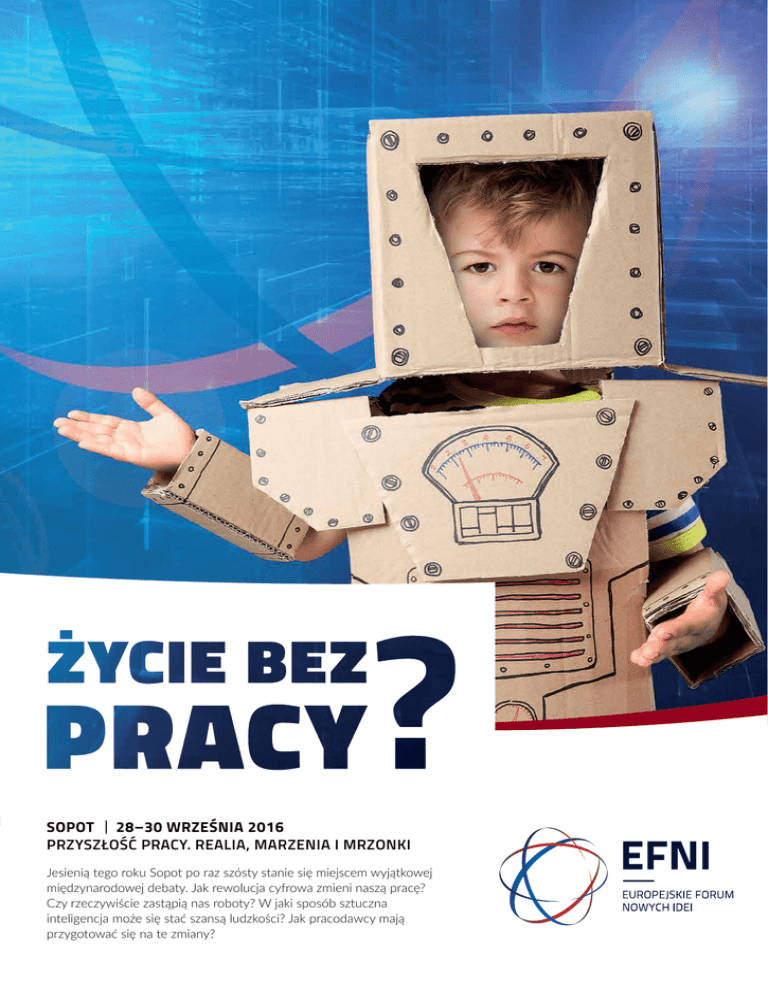 www.efni.pl wejdź, zobacz, zarejestruj się SOPOT ǀ 28–30 WRZEŚNIA 2016 PRZYSZŁOŚĆ PRACY. REALIA, MARZENIA I MRZONKI Jesienią tego roku Sopot po raz szósty stanie się miejscem wyjątkowej międzynarodowej debaty. Jak rewolucja cyfrowa zmieni naszą pracę? Czy rzeczywiście zastąpią nas roboty? W jaki sposób sztuczna inteligencja może się stać szansą ludzkości? Jak pracodawcy mają przygotować się na te zmiany? Szanowni Państwo, Świat pędzi tak szybko, jak nigdy dotąd. Niektóre branże i sektory gospodarki za chwilę będą już tylko wspomnieniem. Roboty i sztuczna inteligencja zrewolucjonizują rynek i styl pracy. Z jednej strony odbiorą ludziom tysiące dotychczasowych zajęć, z drugiej – stworzą tysiące nowych. Jeszcze nie wiemy dokładnie, jakie one będą, ale powinniśmy założyć, że dwoje z trojga dzisiejszych pierwszoklasistów będzie pracowało w zawodach, które jeszcze nie istnieją, a pracodawcy wśród najbardziej poszukiwanych umiejętności będą wskazywać te, które dzisiaj uważamy za drugorzędne. Ta rewolucja już trwa, choć wielu uczestników rynku, i po stronie pracowników, i po stronie biznesu, wydaje się nie zauważać, na czym ona polega oraz jakie szanse i zagrożenia ze sobą niesie. Jeszcze nie rozpala tak naszej wyobraźni, jak targające światem konflikty, masowe migracje, urojone i realne zagrożenia związane z globalną zawieruchą. To rzeczywistość, od której nie ma ucieczki. Będziemy więc o niej mówić na EFNI, ale w tym roku skupimy się przede wszystkim na dyskusji o przyszłości pracy. HENRYKA BOCHNIARZ Prezydent Konfederacji Lewiatan, wiceprezydent BUSINESSEUROPE 50 MIĘDZYNARODOWE FORUM BIZNESU MIĘDZYNARODOWA PERSPEKTYWA ̵ SPOTKANIA Z WYBITNYMI EKSPERTAMI INSPIRUJĄCY PROGRAM I ŻYWE DYSKUSJE ̵ PAKIET WNIOSKÓW I REKOMENDACJI BIZNESOWY NETWORKING GODZIN DEBAT EFNI to miejsce spotkań liderów biznesu, przedstawicieli świata nauki, polityki, kultury, organizacji pozarządowych i mediów. Każde wydarzenie to możliwość wzięcia aktywnego udziału w ważnej debacie. To wyzwanie intelektualne, ale też okazja spotkania interesujących ludzi i uznanych autorytetów, nawiązania relacji biznesowych. 130 PANELISTÓW 1100 UCZESTNIKÓW 2,5 DNIA INSPIRUJĄCYCH SPOTKAŃ Podczas Forum szukamy rozwiązań dla najważniejszych wyzwań stojących przed Europą. Gorące dyskusje służą wypracowaniu rekomendacji i pomysłów na silniejszą Europę i konkurencyjną gospodarkę, otwartą na trendy cywilizacyjne i technologiczne. EFNI jest organizowane od 2011 roku przez Konfederację Lewiatan, we współpracy z BUSINESSEUROPE i Sopotem oraz polskimi i międzynarodowymi firmami, organizacjami i instytucjami. PROGRAM PRZYSZŁOŚĆ PRACY. REALIA, MARZENIA I MRZONKI Nigdzie na świecie nie widziałem bardziej ożywionych dyskusji, nowatorskich pomysłów i poważnej debaty nad stanem współczesnych instytucji. PROF. BENJAMIN BARBER, prezydent Interdependence Movement/CivWorld, USA SESJE PLENARNE Przyszłość pracy. Realia, marzenia i mrzonki. Jakie będą najbliższe i dalekosiężne, społeczne i ekonomiczne konsekwencje zmian technologicznych, globalizacji, mobilności i gospodarki dzielenia się? Od niskich płac do innowacyjności – jak nowe państwa członkowskie mogą nadrobić dystans do starej Europy? Czy w nadrabianiu zaległości możliwe są drogi na skróty? Nowy globalny nieład – co czeka świat i Europę? Co wyłoni się z obecnej światowej zawieruchy: zimna, a może gorąca wojna? PANELE DYSKUSYJNE Czy roboty zabiorą nam pracę? Co będą robić ludzie, którym obecna rewolucja technologiczna, w przeciwieństwie do poprzednich, odbierze miejsca pracy? Jak wykorzystać nowe technologie do tworzenia miejsc pracy? Jakich kompetencji roboty nie zastąpią i gdzie zwiększy się przestrzeń dla ludzkiej pracy? Co po flexicurity? Czy bezpieczny i elastyczny rynek pracy to utopia? CEO przyszłości. Jak zmienią się role i służbowe relacje pracodawców i pracowników ery cyfrowej? Omnibus czy tabula rasa – jaki będzie pracownik przyszłości? Jakie kompetencje będą potrzebne na przyszłym rynku pracy? Jak je przewidzieć i rozwijać już dziś? Jakich umiejętności brakuje pokoleniu „lajków”? Jak kształtować pokolenie otwarte na zmiany przez całe życie? Jak rewolucja technologiczna zmieni edukację? Czy kompetencje przyszłości to tylko kompetencje cyfrowe? Gra o talenty w epoce cyfry i networkingu. Jakie zmiany w kształceniu i łowieniu talentów spowoduje technologia? Jak przygotować się na konsekwencje zmian demograficznych i skąd pozyskiwać pracowników? Największe wyzwania związane z deficytem kapitału ludzkiego Czy tylko państwo może wymusić innowacje? Czy państwo może jeszcze być aktywnym graczem, skoro przez ostatnie dziesięciolecia coraz więcej pola oddawało rynkowi? Uchodźcy na europejskim rynku pracy. Jak adaptować poziom kwalifikacji przypadkowych przybyszów do potrzeb lokalnych rynków pracy? Wzrost czy klimat – nieunikniony wybór? Czy współczesny świat czeka zmiana dotychczasowego paradygmatu rozwoju? GALE A PONADTO Trzy wieczory, podczas których wszyscy uczestnicy EFNI spotykają się w jednym miejscu, w Pawilonie Nowych Idei, na sopockiej plaży. Dwa z nich to uroczyste gale otwarcia i zamknięcia (środa i piątek), a w czwartek zapraszamy na wieczór networkingowy – to niepowtarzalna okazja do nawiązywania kontaktów. Uatrakcyjni go specjalny program artystyczny i tańce. ❙ Okrągły stół pracodawców, związkowców i polityków ❙ Debata przedstawicieli opiniotwórczych mediów europejskich ❙ Spotkanie z polskimi przedsiębiorcami, którzy odnieśli sukces ❙ Rozmowy nocnych marków ❙ Akademia EFNI Zielony kapitalizm – nowy etap w rozwoju ludzkości? Co musi się zmienić w kulturach organizacyjnych firm, by program zeroemisyjnej gospodarki traktować nie w kategorii kosztów, ale wyzwania i przyszłego zysku? Ryzyka k