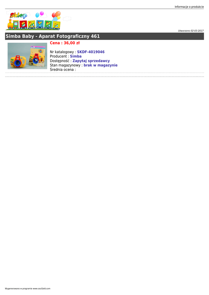 Informacje o produkcie Utworzono 02-03-2017 Simba Baby - Aparat Fotograficzny 461 Cena : 36,00 zł Nr katalogowy : SKDF-4019046 Producent : Simba Dostępność : Zapytaj sprzedawcy Stan magazynowy : brak w magazynie Średnia ocena : Wygenerowano w programie www.oscGold.com
