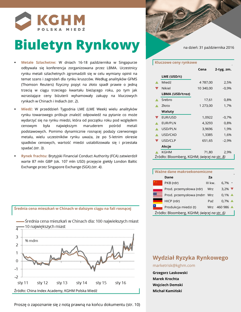 Biuletyn Rynkowy Metale Szlachetne: W dniach 16-18 października w Singapurze na dzień: 31 października 2016 Kluczowe ceny rynkowe odbywała się konferencja zorganizowana przez LBMA. Uczestnicy Cena rynku metali szlachetnych zgromadzili się w celu wymiany opinii na temat szans i zagrożeń dla rynku kruszców. Według analityków GFMS (Thomson Reuters) fizyczny popyt na złoto spadł prawie o jedną trzecią w ciągu trzeciego kwartału bieżącego roku, po tym jak wzrastające ceny biżuterii wyhamowały zakupy na kluczowych rynkach w Chinach i Indiach (str. 2). Miedź: W przeddzień Tygodnia LME (LME Week) wielu analityków rynku towarowego próbuje znaleźć odpowiedź na pytanie co może wydarzyć się na rynku miedzi, która od początku roku pod względem cenowym była największym maruderem pośród metali podstawowych. Pomimo dynamicznie rosnącej podaży czerwonego metalu, wielu uczestników rynku uważa, że po 5-letnim okresie spadków cenowych, wartość miedzi ustabilizowała się i przestała spadać (str. 3). Rynek frachtu: Brytyjski Financial Conduct Authority (FCA) zatwierdził 2-tyg. zm. LME (USD/t) p Miedź 4 787,00 2,5% q Nikiel 10 340,00 -0,9% LBMA (USD/troz) p Srebro 17,61 0,8% 1 273,00 1,7% q EUR/USD 1,0922 -0,7% EUR/PLN 4,3293 0,8% p USD/PLN 3,9696 1,9% p USD/CAD 1,3385 1,6% q USD/CLP 651,65 -2,9% p Złoto Waluty p Akcje 71,80 2,9% p KGHM Źródło: Bloomberg, KGHM; (więcej na str. 8) warte 87 mln GBP (ok. 107 mln USD) przejęcie giełdy London Baltic Exchange przez Singapore Exchange (SGX) (str. 4). Ważne dane makroekonomiczne Dane PKB (rdr) 6,7% Wrz 3,2% q Prod. przemysłowa (mdm) Wrz 0,1% p HICP (rdr) Paź 0,7% p Produkcja miedzi (t) Wrz 460 986 p Prod. przemysłowa (rdr) Średnia cena mieszkań w Chinach w dalszym ciągu na fali rosnącej Za III kw. Źródło: Bloomberg, KGHM; (więcej na str. 6) Wydział Ryzyka Rynkowego [email protected] Grzegorz Laskowski Marek Krochta [1 wykres, jeśli możliwe bez tła (=tło przeźroczyste); Źródło: China Index Academy, KGHM Polska Miedź Wysokość: 6 cm; Szerokość 11,5 cm Proszę o zapoznanie się z notą prawną na końcu dokumentu (str. 10) Wojciech Demski Michał Kamiński Biuletyn Rynkowy | 31 października 2016 Metale podstawowe i szlachetne | Pozostałe surowce Metale Szlachetne W dniach 16-18 października w Singapurze odbywała się konferencja zorganizowana przez LBMA. Uczestnicy rynku metali szlachetnych zgromadzili się w celu wymiany opinii na temat szans i zagrożeń dla rynku kruszców. Według analityków GFMS (Thomson Reuters) fizyczny popyt na złoto spadł prawie o jedną trzecią w ciągu trzeciego kwartału bieżącego roku, po tym jak wzrastające ceny biżuterii wyhamowały zakupy na kluczowych rynkach w Chinach i Indiach. Konferencja London Bullion Market Association (LBMA) W dniach 16-18 października w Singapurze odbyła się konferencja zorganizowana przez LBMA. Uczestnicy rynku metali szlachetnych zgromadzili się w celu wymiany opinii na temat szans i zagrożeń dla rynku kruszców. Wśród rekordowej ilości uczestników tegorocznej edycji znaleźli się przedstawiciele firm górniczych, hutniczych, jubilerskich oraz instytucji finansowych zaangażowanych w rynek metali szlachetnych. Pośród omawianych tematów szczególną uwagę zwróciły: deflacja, aktywność banków centralnych oraz regulatorów rynków, Brexit, rosnące zjawisko populizmu politycznego oraz popyt na kruszce ze strony odbiorców chińskich. Istotnym punktem była również przyszłość ceny referencyjnej dla złota, po tym jak tradycyjne metody jej ustalania zostały porzucone. Wiodącą rolę w tym aspekcie odgrywają zarówno LBMA jak i LME (London Metal Exchange). Konsensus uczestników konferencji w Singapurze był przekonany o kontynuacji wzrostów cenowych w kolejnym roku Ankieta przeprowadzona wśród uczestników konferencji wskazała przewidywaną cenę złota w październiku 2017 roku (czyli w przyszłym roku) na poziomie 1 347 USD/troz, około 80 USD/troz wyżej niż cena bieżąca (+6%). Prognoza dla srebra wyniosła 20,9 USD/troz, czyli ok 3 USD wyżej niż obecne kwotowanie (+18%). Delegaci byli również optymistycznie nastawieni do kształtowania się cen platyny. Prognoza na poziomie 1 055 USD/troz stanowi 12% wzrostu w stosunku do obecnej ceny tego kruszcu, choć z dyskusji podczas konferencji oraz w trakcie sesji London Platinum and Palladium Market wyraźnie dało się zauważyć bardziej negatywny sentyment uczestników do rynku platyny. Prognoza ceny palladu na październik 2017 wyniosła 752,5 USD/troz (+18%). Chociaż wyniki ankiety często nie znajdują potwierdzenia w realnym kształtowaniu się cen w przyszłości, ciężko podważyć rynkowy konsensus wśród uczestników konferencji, uwzględniający ryzyka finansowe i geopolityczne oraz obawy, co do trwałości popytu w Chinach i Indiach, wśród głównych czynników kształtujących ceny metali szlachetnych w przyszłości. Niższy popyt na złoto – raport Reuters GFMS Spadek popytu fizycznego na złoto Według analityków GFMS (Thomson Reuters) fizyczny popyt na złoto spadł prawie o jedną trzecią w ciągu trzeciego kwartału bieżącego roku, po tym jak 2 / 10 Biuletyn Rynkowy | 31 października 2016 wzrastające ceny biżuterii wyhamowały zakupy na kluczowych rynkach w Chinach i Indiach. Nadwyżka netto na rynku złota ukształtowała się na poziomie najwyższym od 2005 roku, przy zmniejszonym popycie widocznym również w aktywach finansowych opartych na złocie. Prognoza dot. cen wskazuje na ich ustabilizowanie w końcówce roku 2016 na niższym poziomie 1240 USD/oz oraz średnią roku 2017 na poziomie 1420 USD/oz. Wyniki walki wyborczej w USA pomiędzy kandydatką Demokratów Hillary Clinton oraz kandydatem Republikanów Donaldem Trumpem, mająca swój finał w listopadowych wyborach oraz decyzja Wielkiej Brytanii o opuszczeniu Unii Europejskiej, są brane pod uwagę, jako główne czynniki popytu na złoto i w 